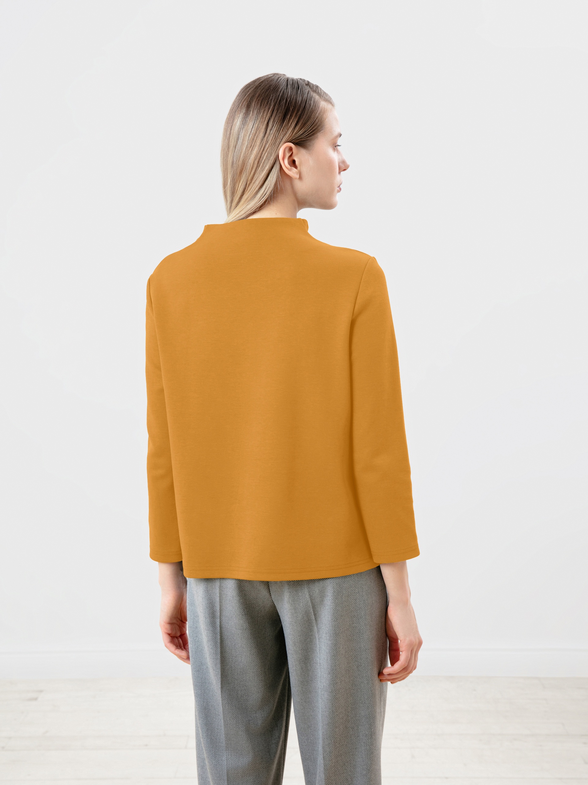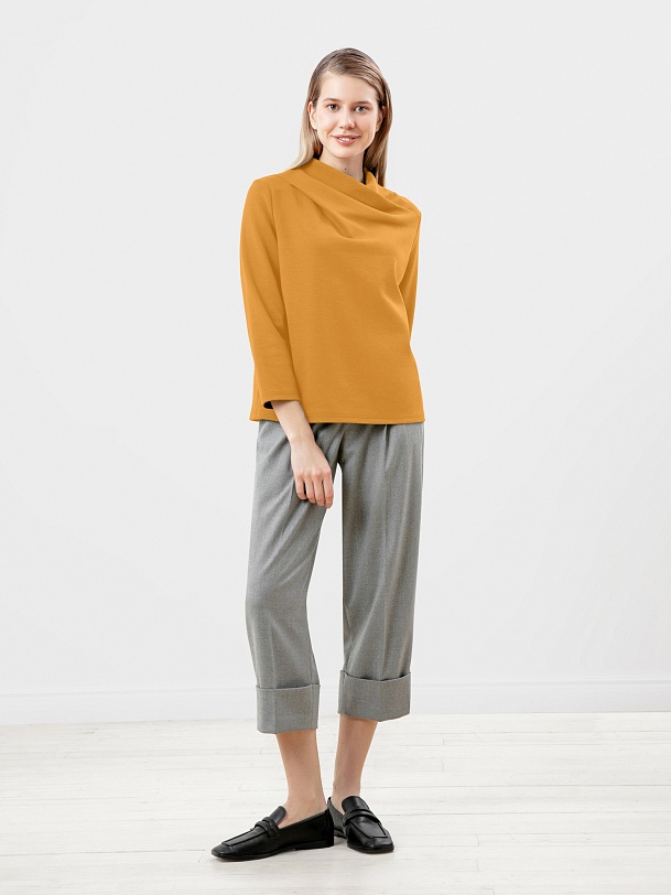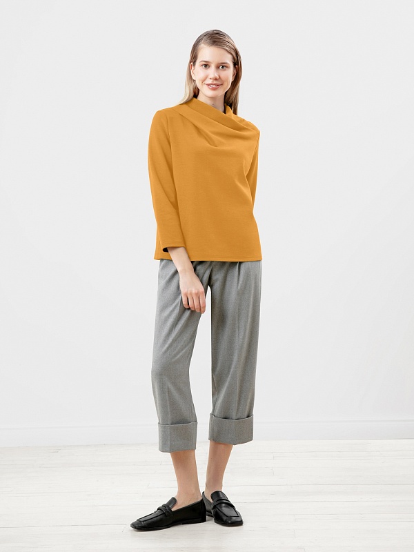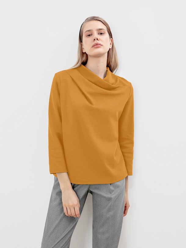 Блуза прямого силуэта из трикотажного полотна в цвете корица с цельнокроенным воротником-стойка и втачным рукавом. Эта модель добавит немного оригинальности в ваш повседневный базовый образ.