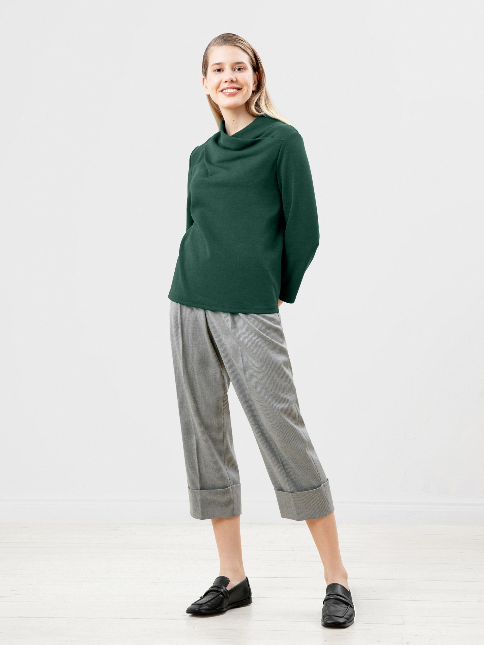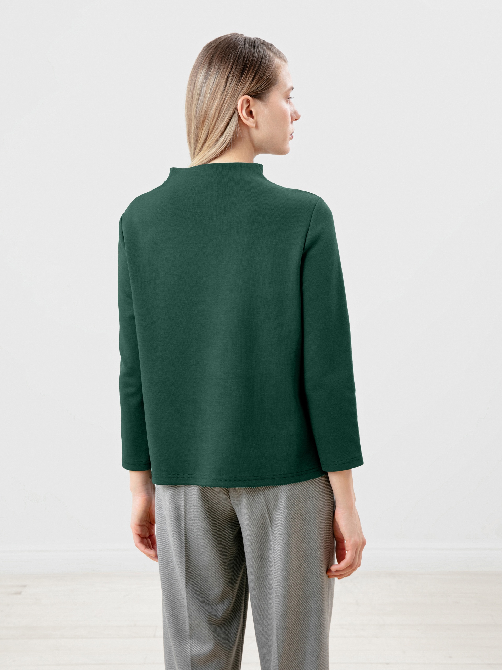 Блуза прямого силуэта из трикотажного полотна темно-зеленого цвета с цельнокроеным воротником-стойкой и втачным рукавом. Эта модель добавит немного оригинальности в ваш повседневный базовый образ.