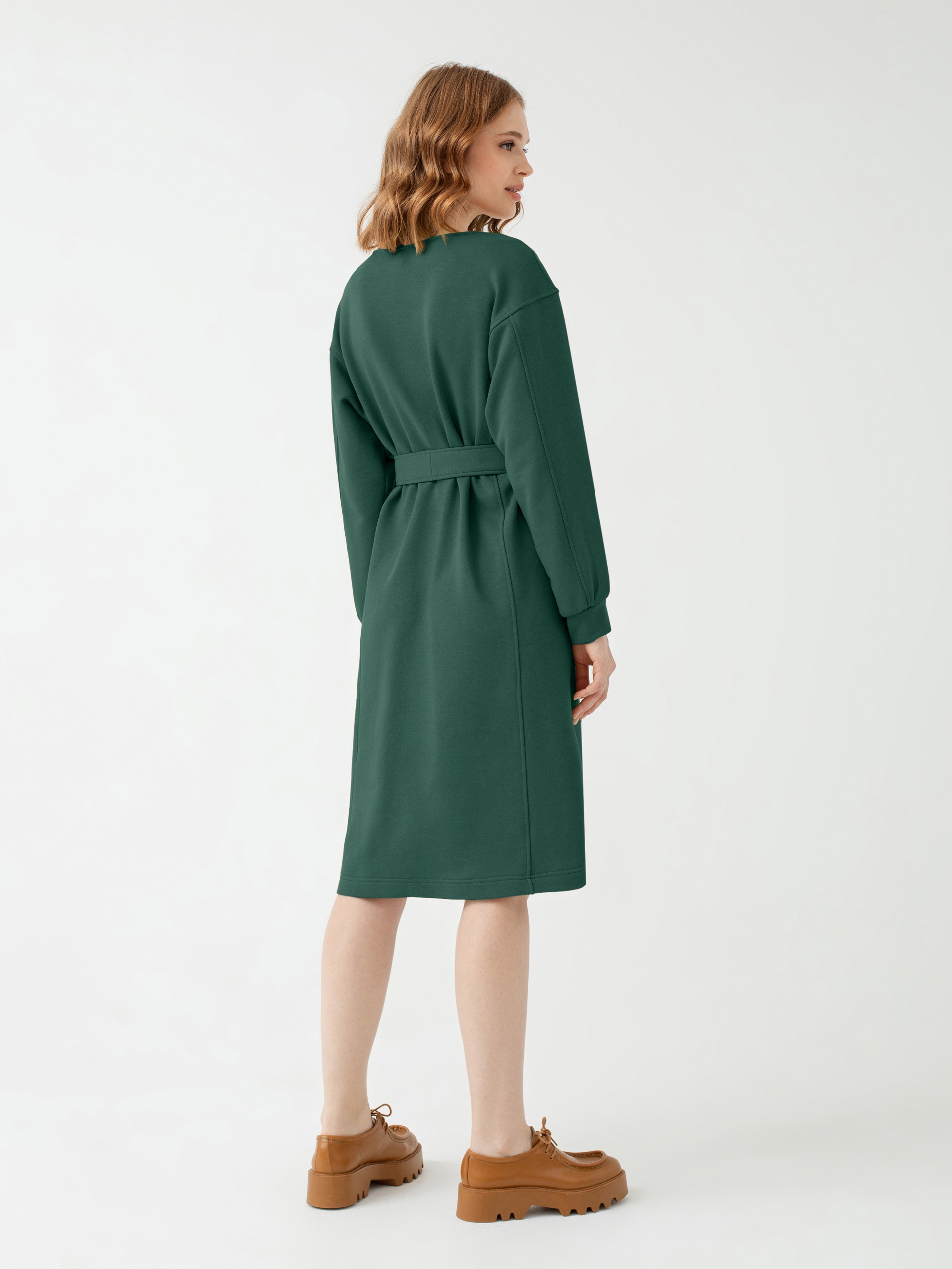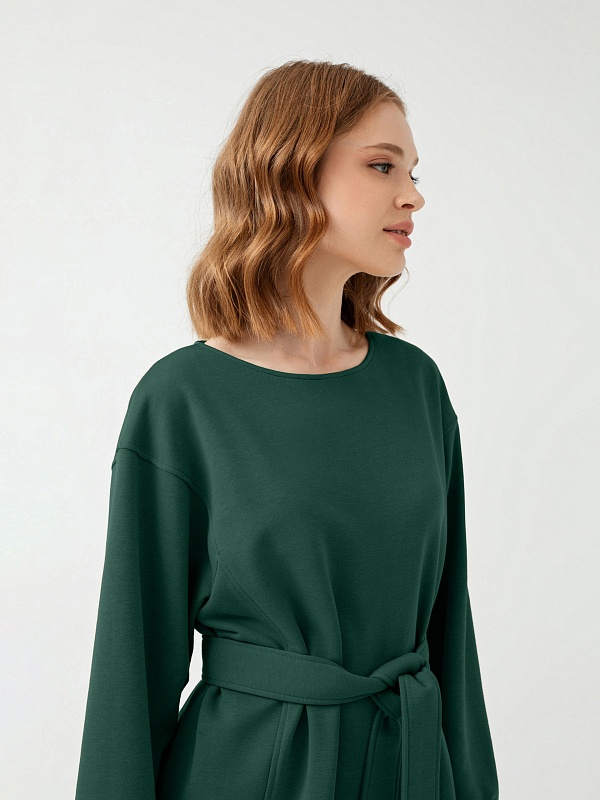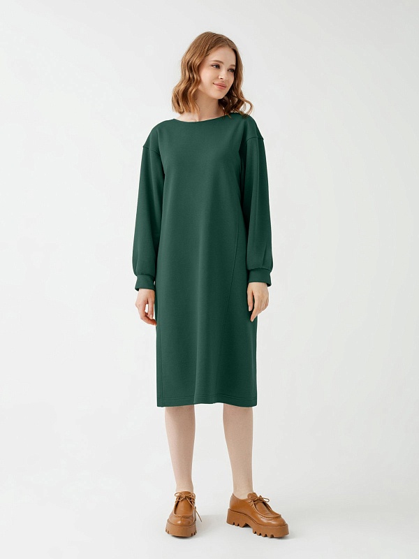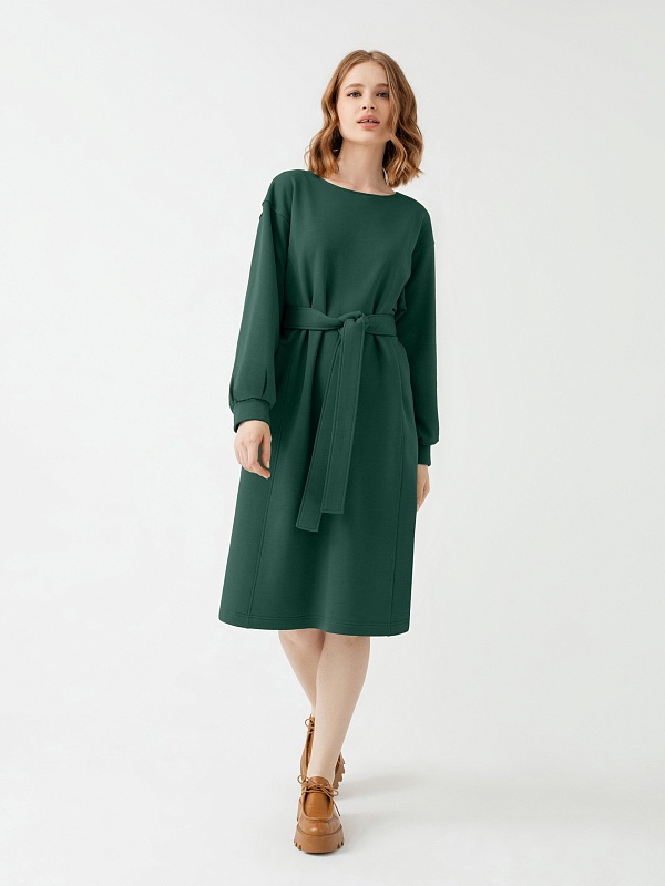 Платье приталенного силуэта из трикотажного полотна в темно-зеленом цвете с горловиной лодочка, спущенным плечом и объёмным рукавом с манжетой. Вертикальные рельефы визуально вытягивают фигуру. Пояс из основной ткани дополнит образ и подчеркнет талию.