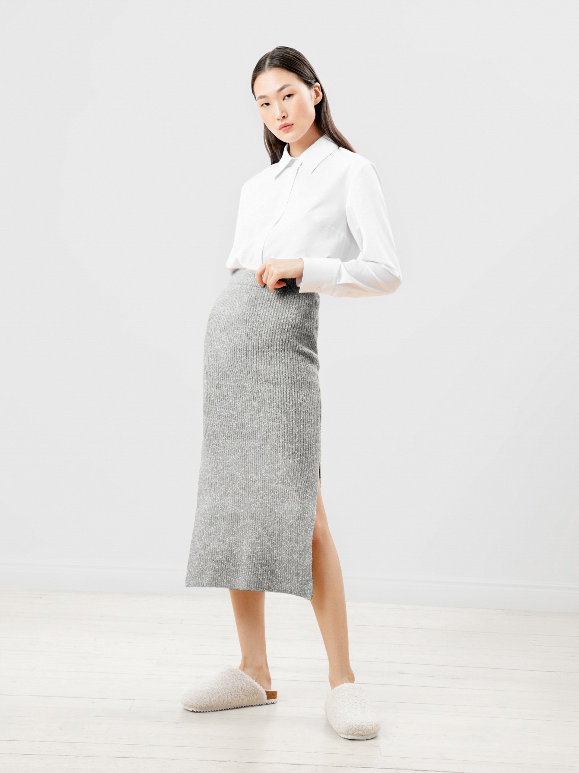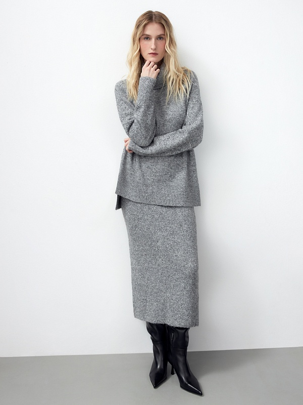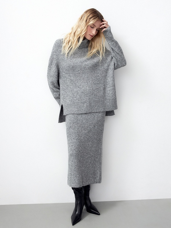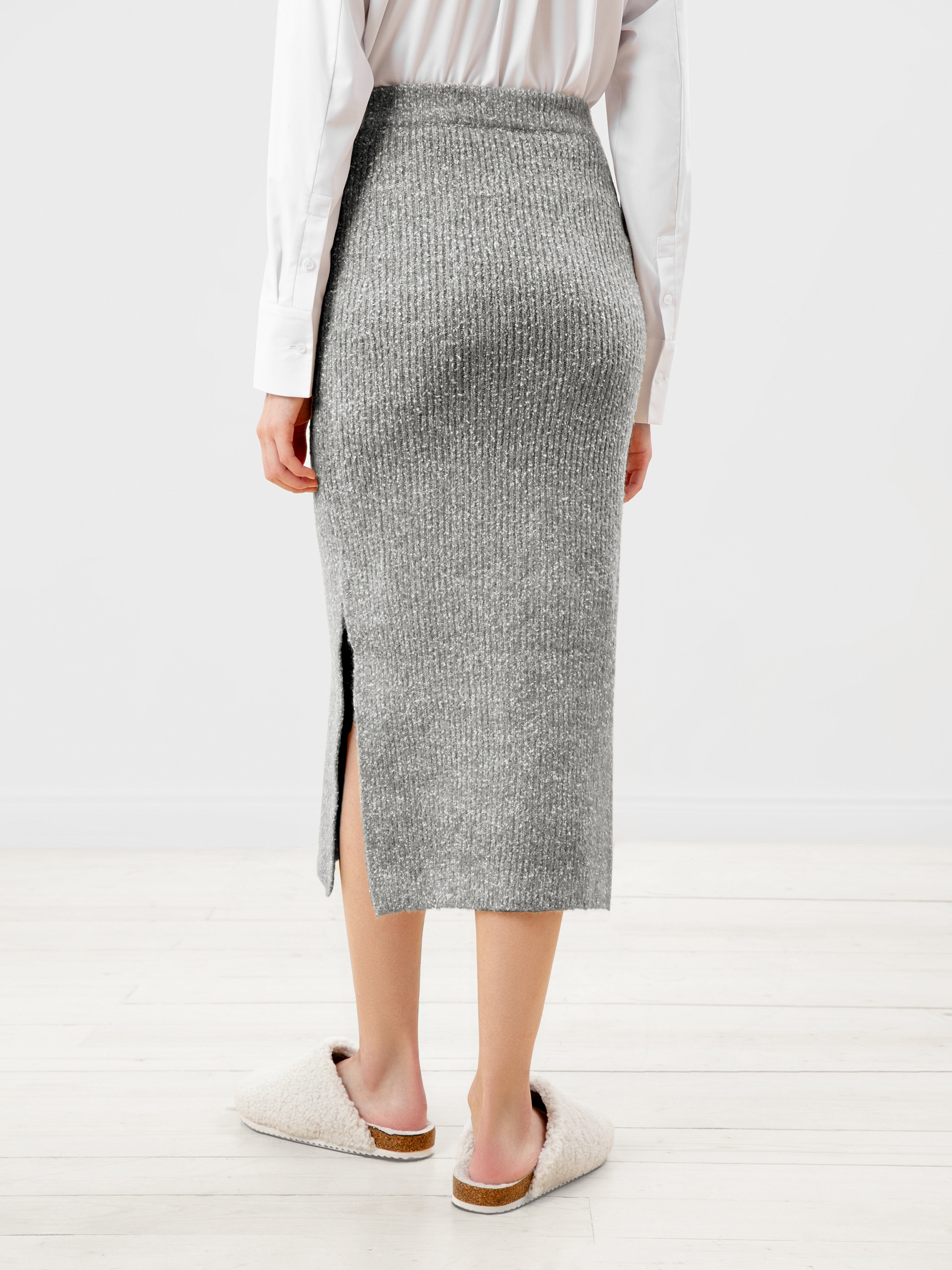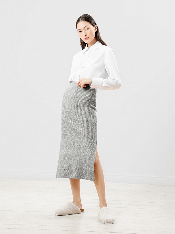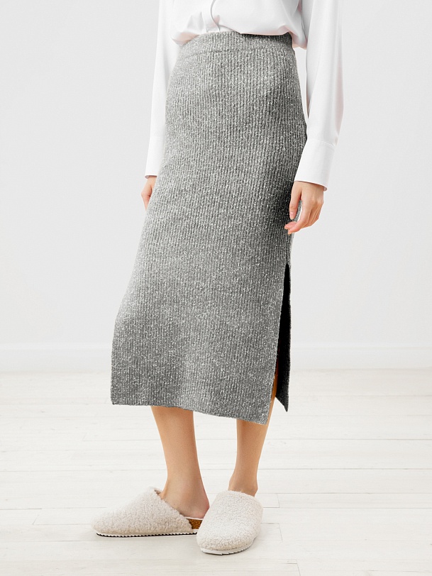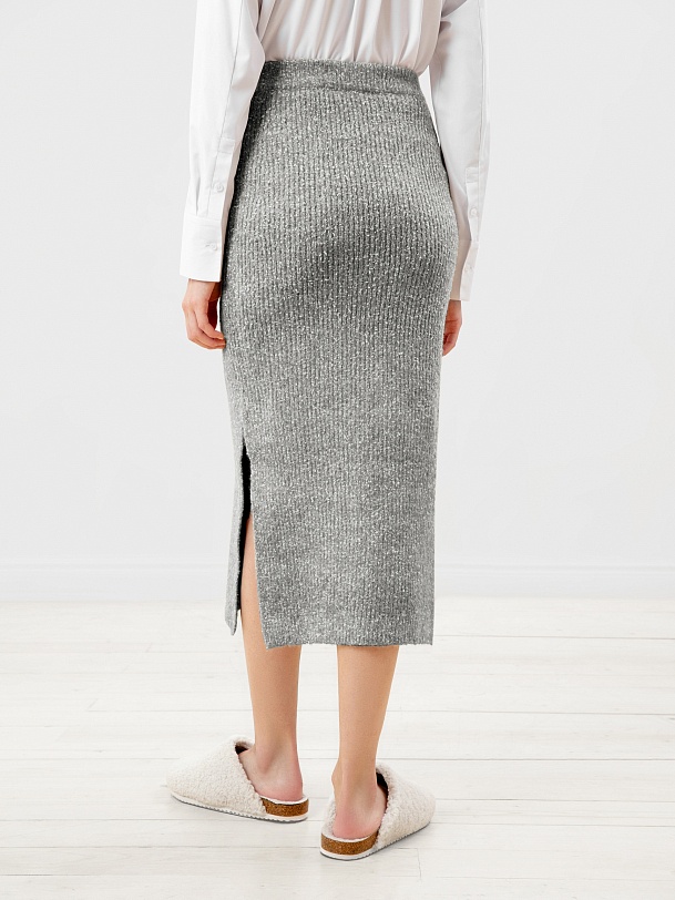 Стильная юбка прямого удлиненного силуэта из фактурного вязаного трикотажа на притачном поясе с резинкой. Универсальная модель для создания актуальных и базовых осенних образов.