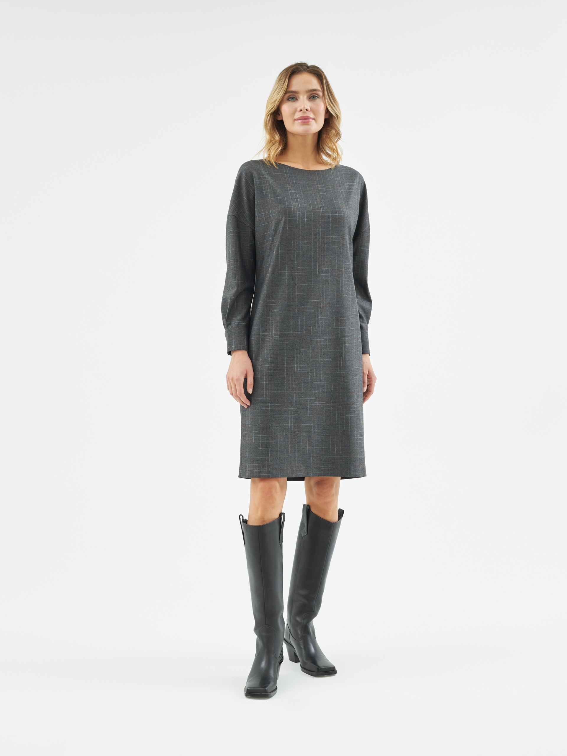 Платье из костюмной ткани прямого силуэта длины миди с горловиной лодочка, спущенным плечом и втачным рукавом полной длины на манжете.