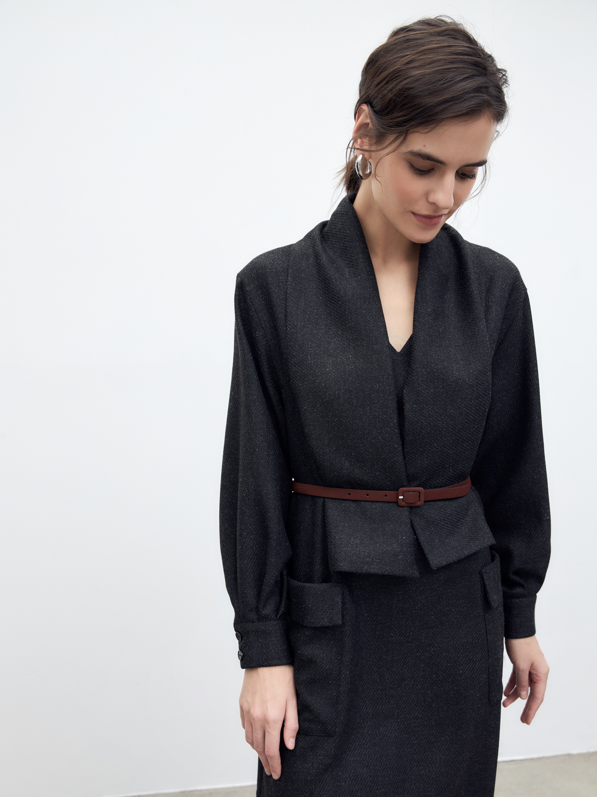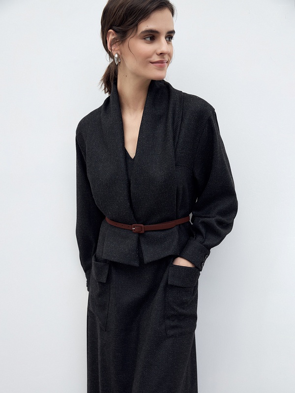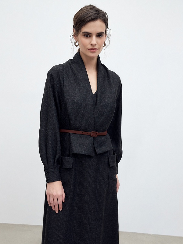 Горловина декорирована палантином со складками из основной ткани, который можно носить как шарф, а можно под пояс как имитацию комплекта из жакета и юбки.