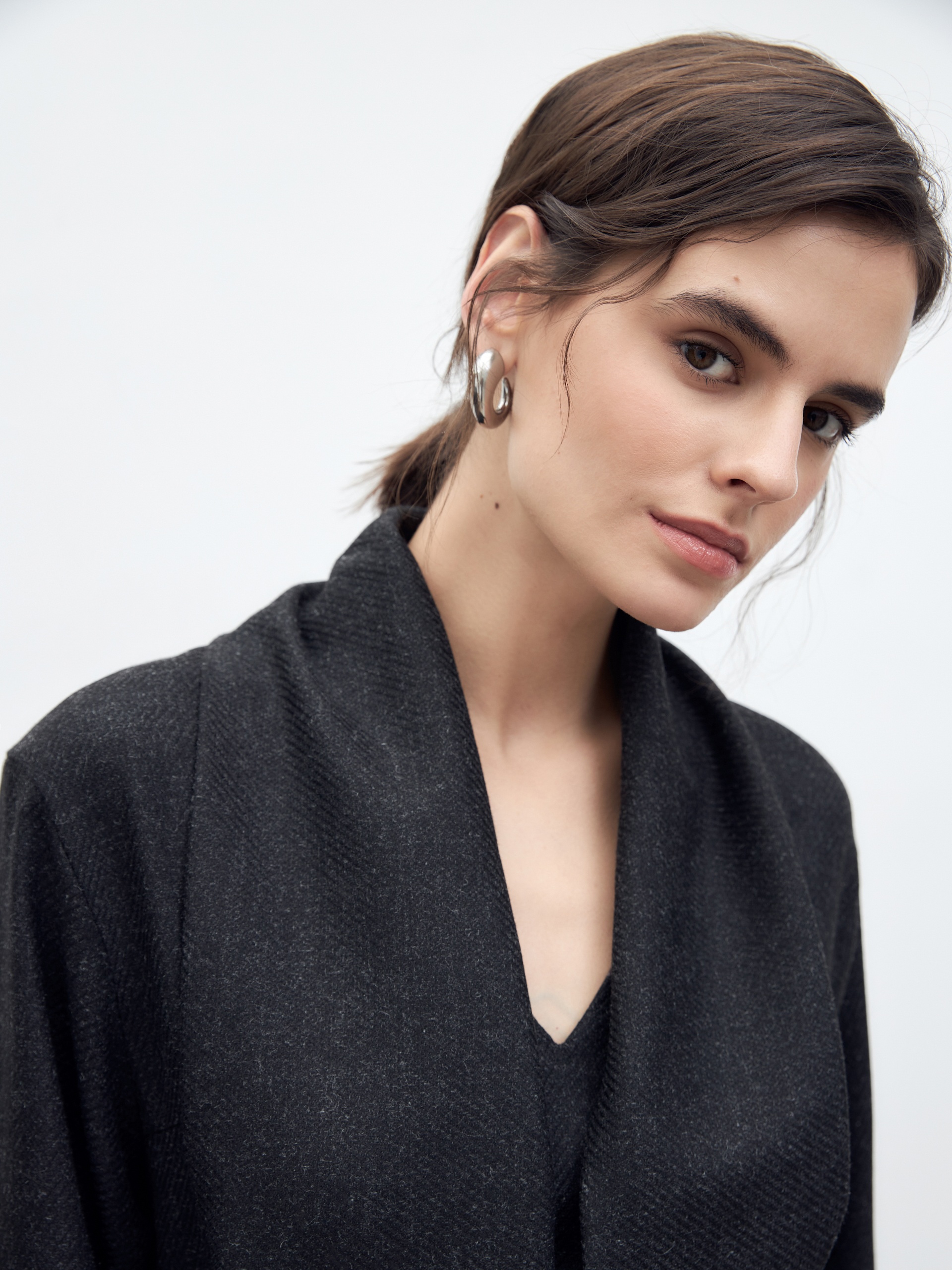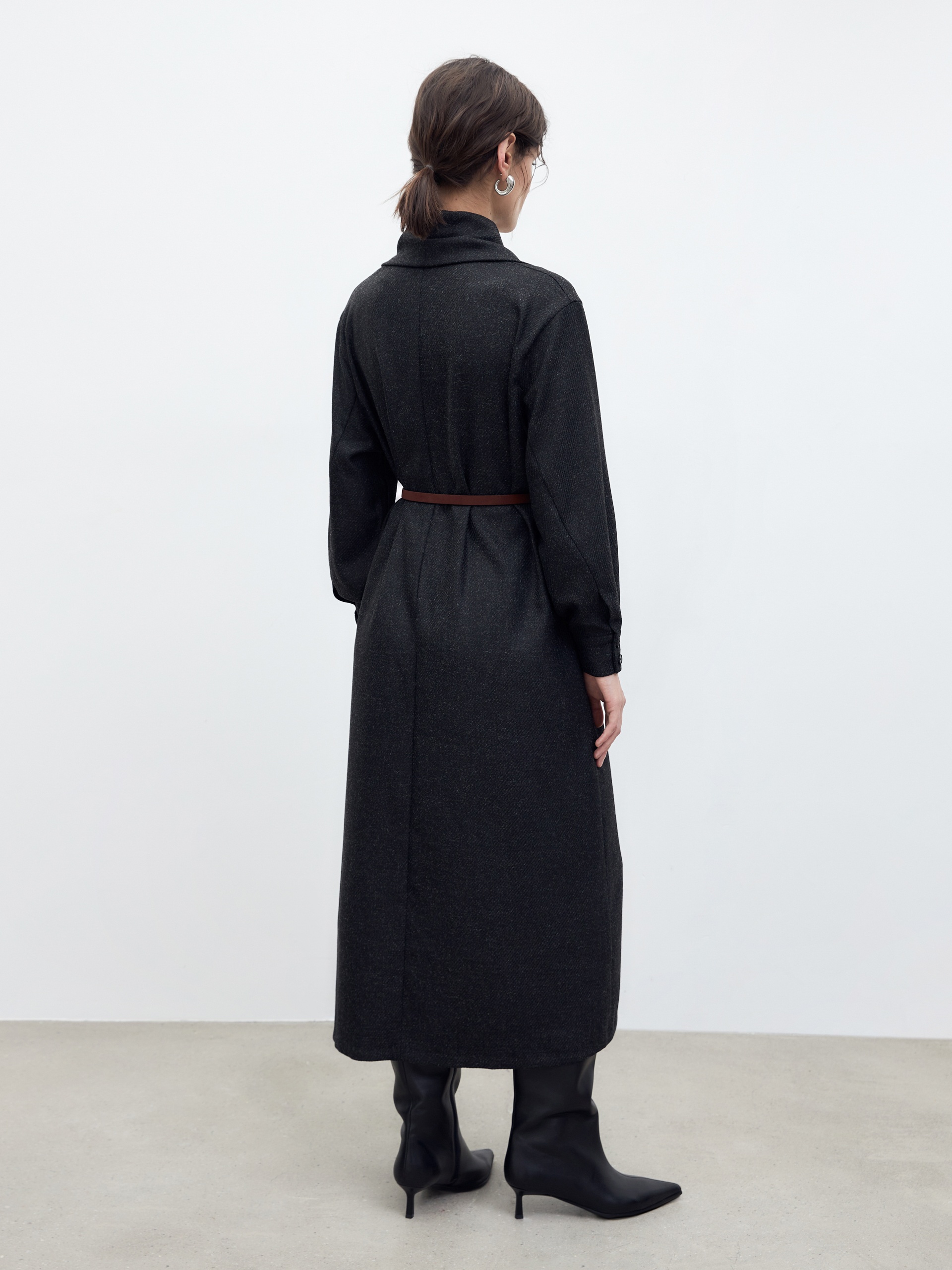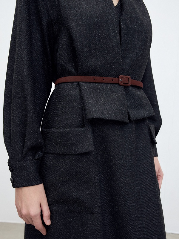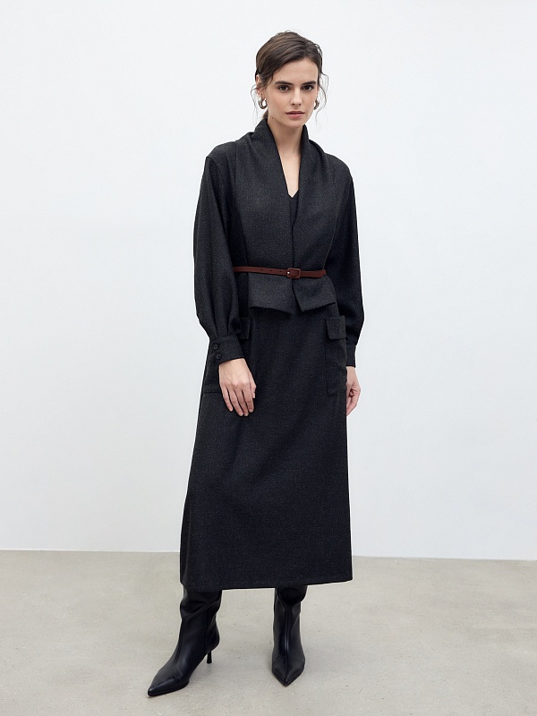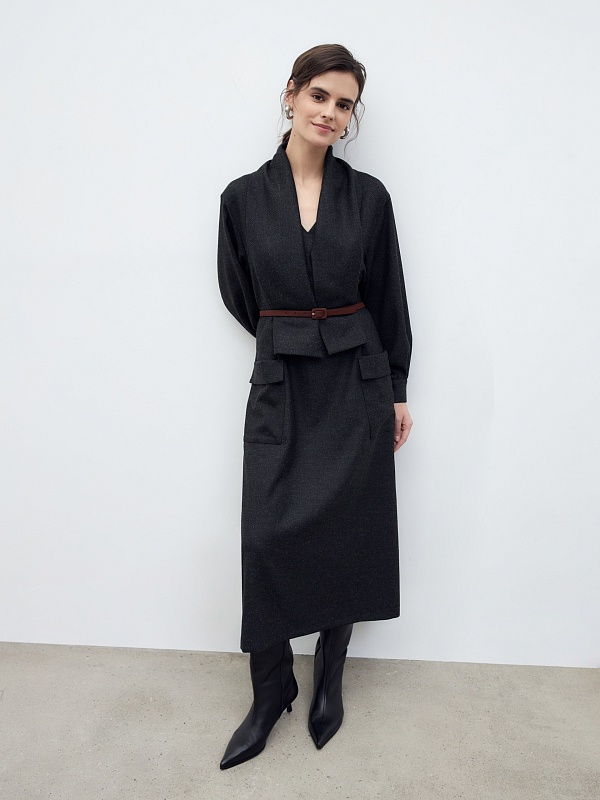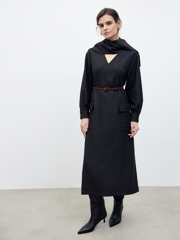 Платье длины мидакси прямого силуэта из костюмной ткани цвета мокрый асфальт с V-образным вырезом горловины, втачным рукавом и крупными накладными карманами.