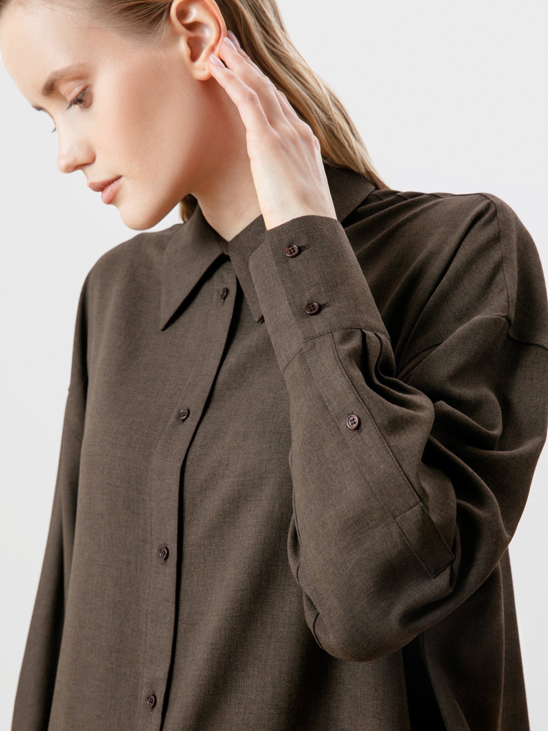 Рубашка прямого свободного силуэта из блузочной ткани болотного цвета с отложным классическим воротником, спущенным плечом и рукавом полной длины с манжетой. Застёжка спереди на пуговицы.