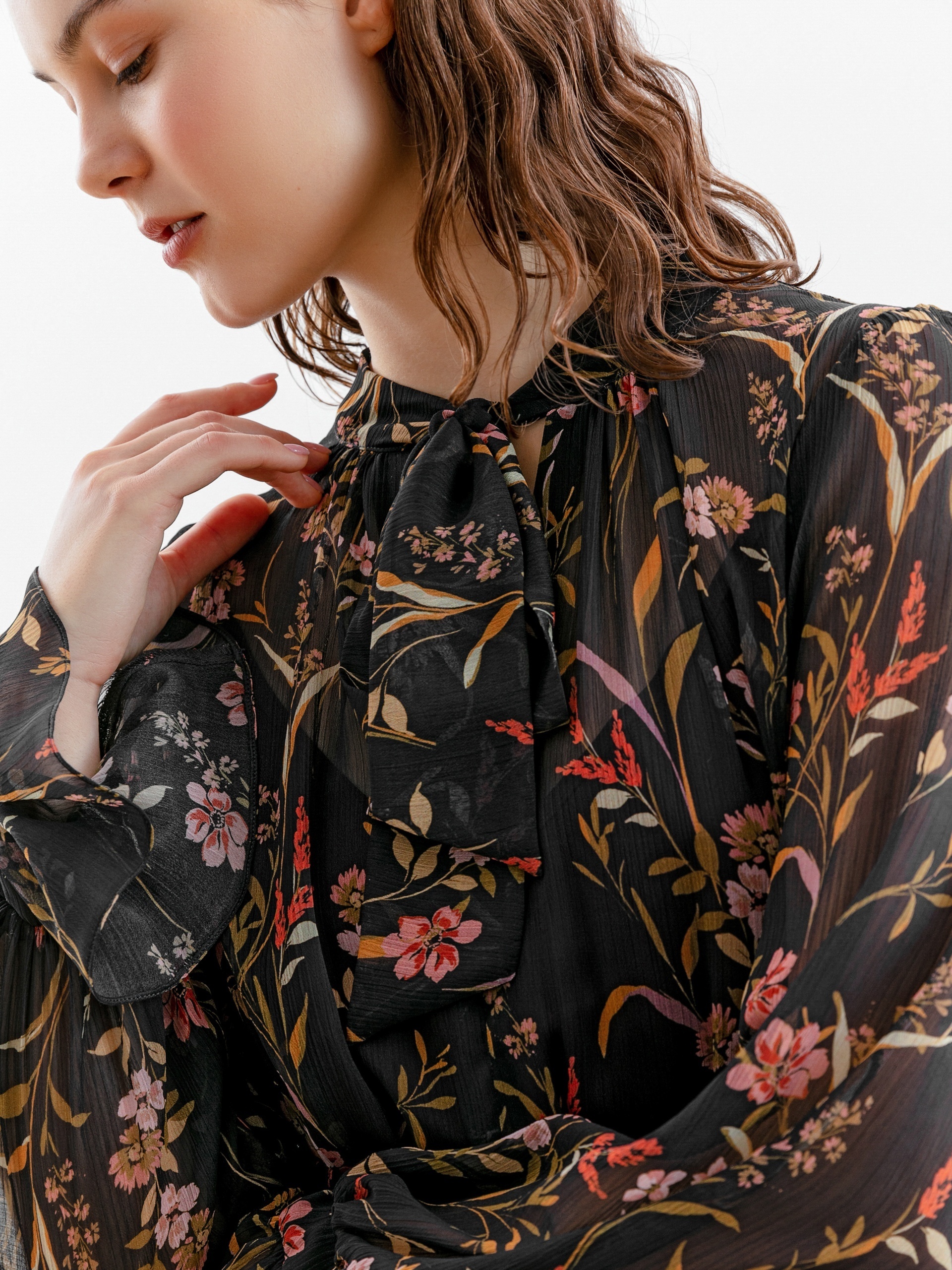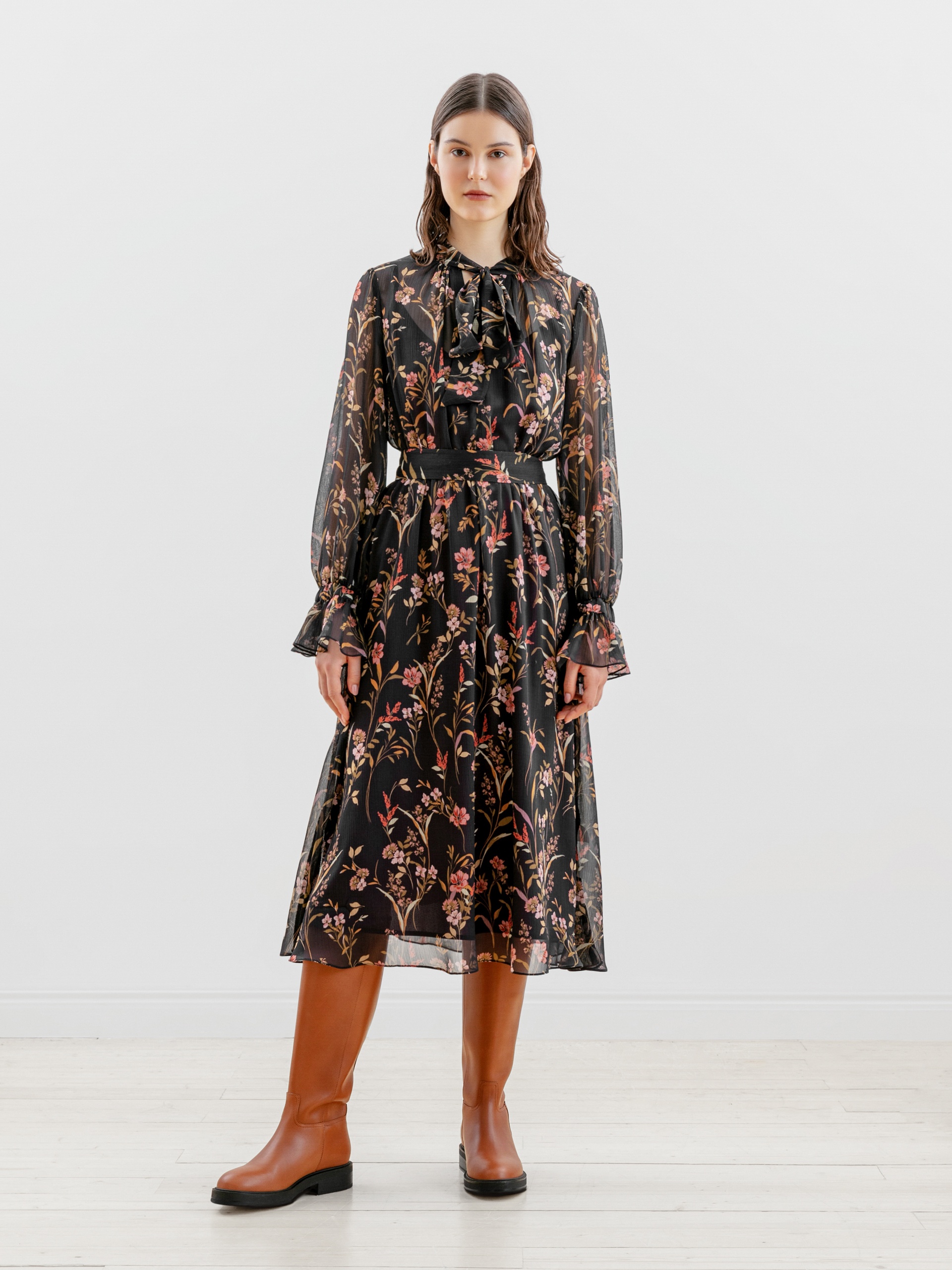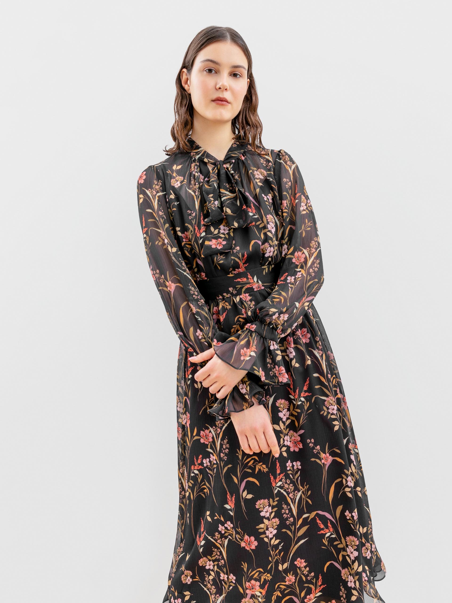 Романтическое шифоновое платье длины макси приталенного силуэта в цветочном принте с воротником стойка, переходящим в бант и втачным рукавом полной длины с манжетой-воланом по низу. Отрезное по линии талии со сборкой и летящей юбкой А-силуэта. В комплекте идет нижнее платье-комбинация из подкладочной ткани и мягкий пояс из шифона.