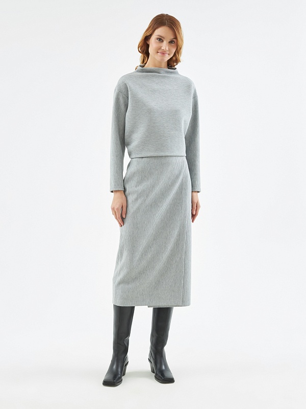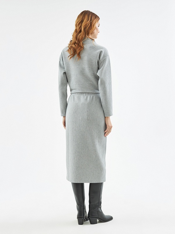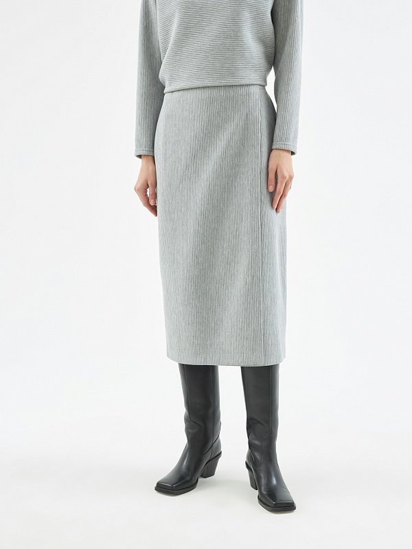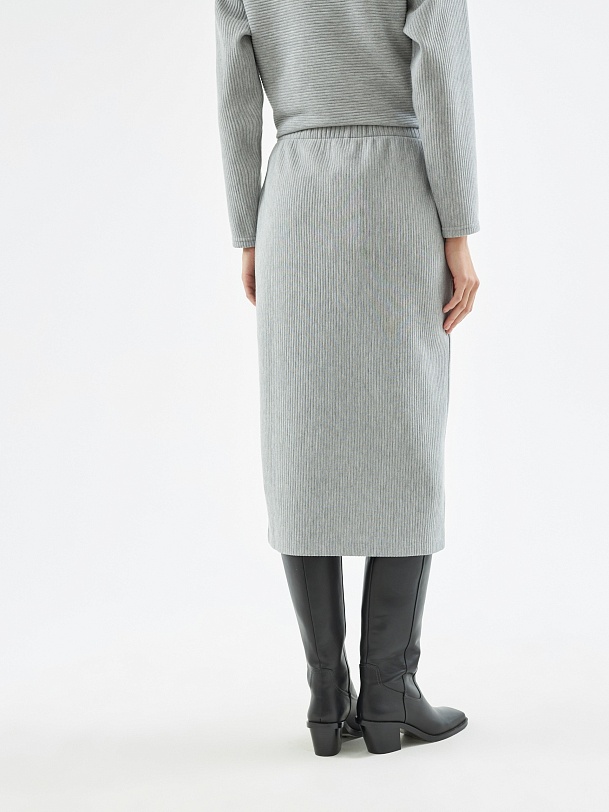 Юбка прямого силуэта на притачном поясе из мягкого трикотажного полотна в сером цвете.