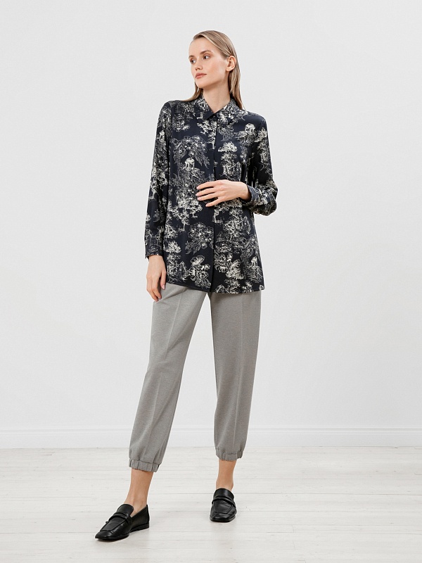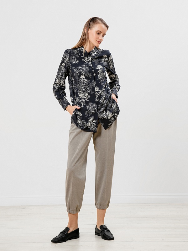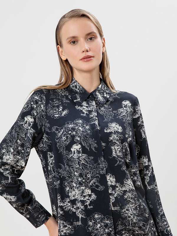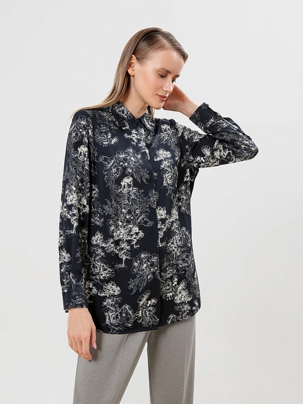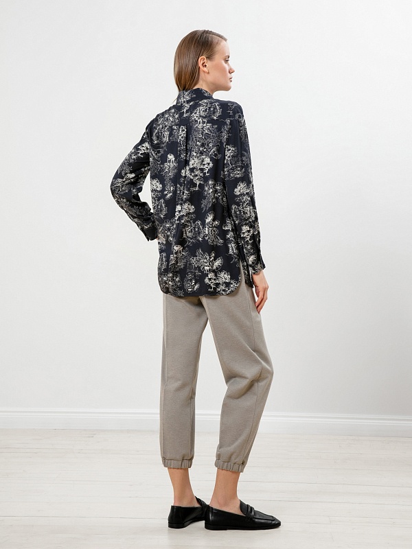 Принт на блузе выполнен в технике японской гравюры, рисунок деревьев отражает приоритет природы в духовной культуре этой страны.