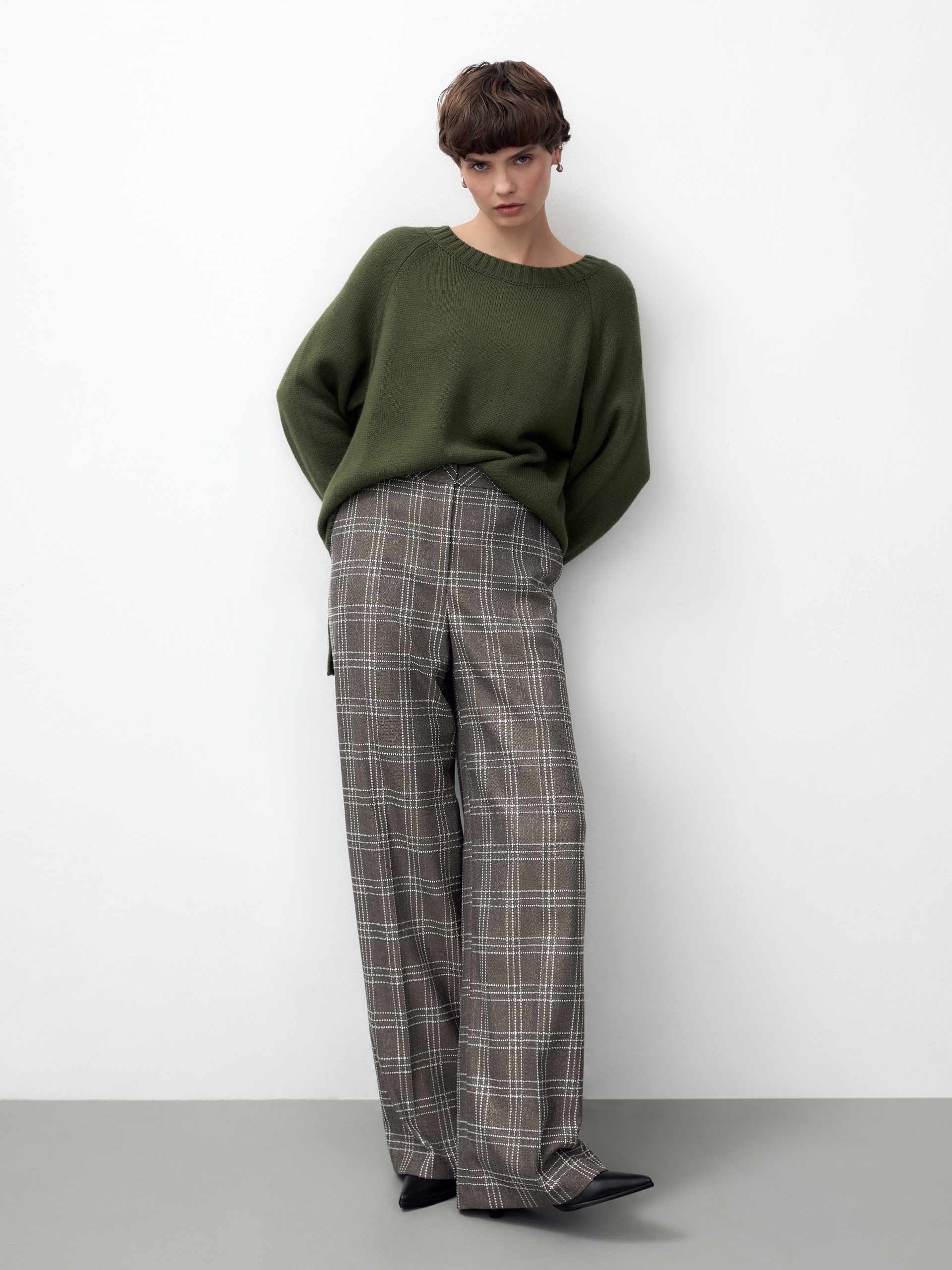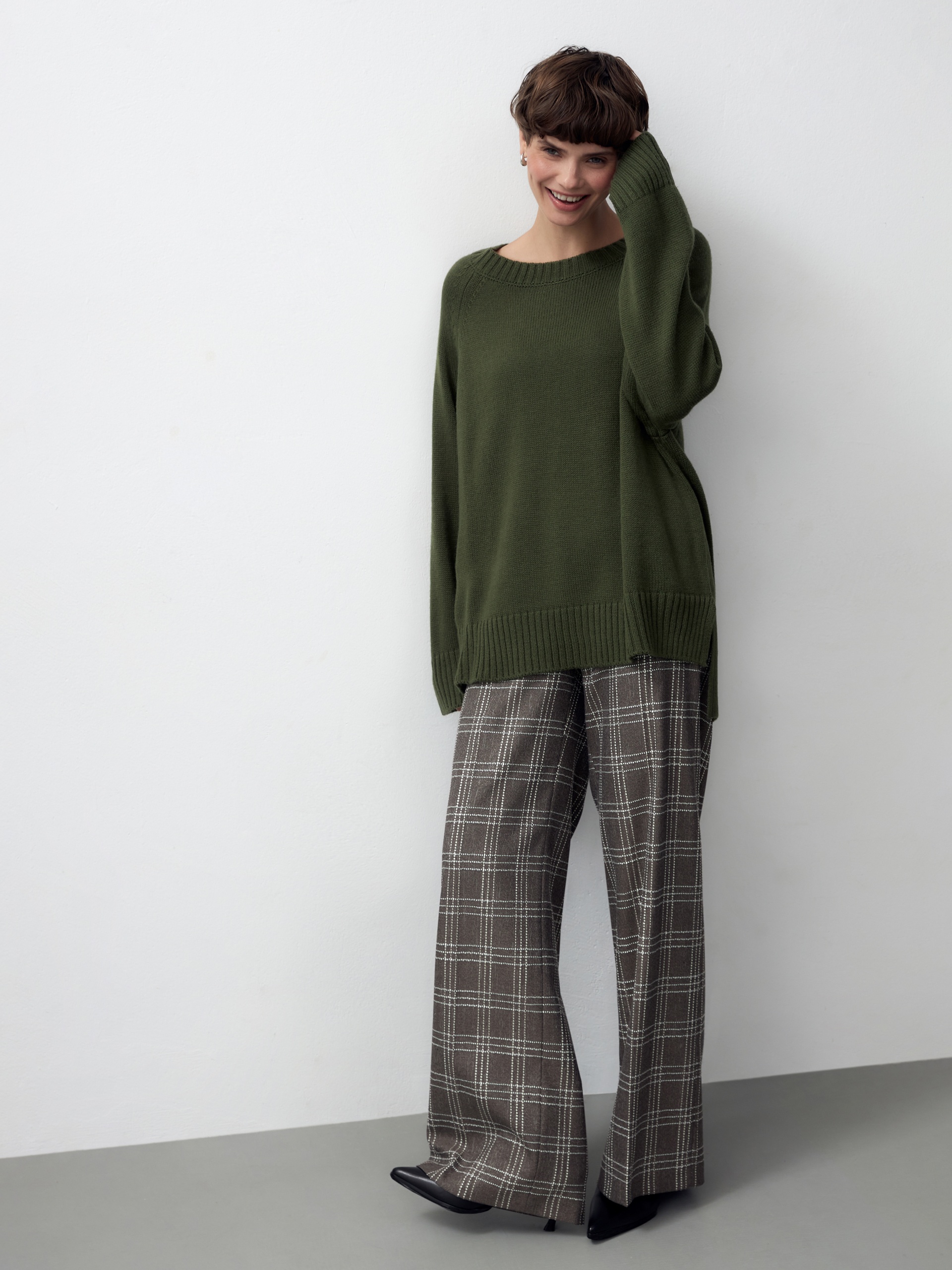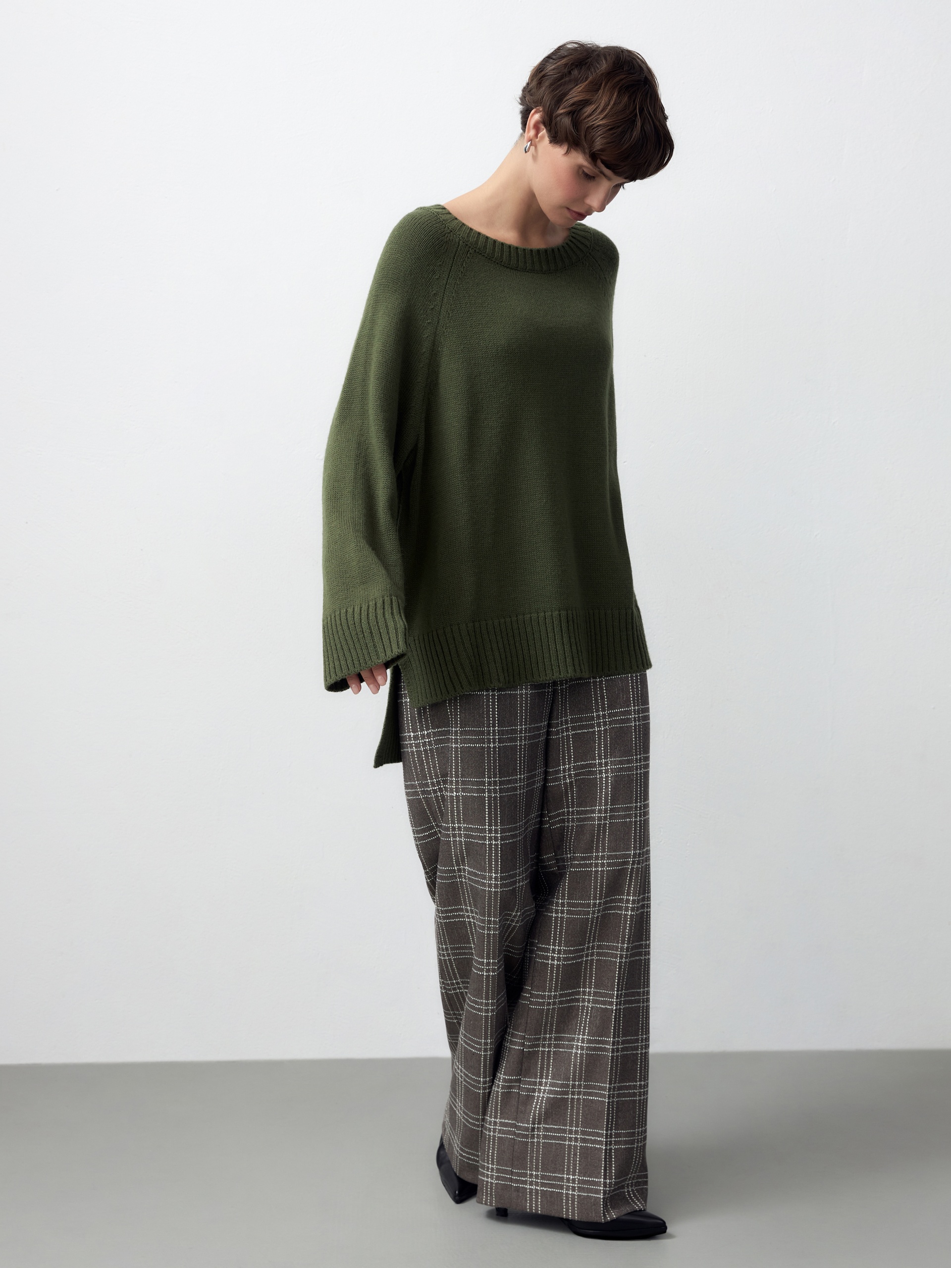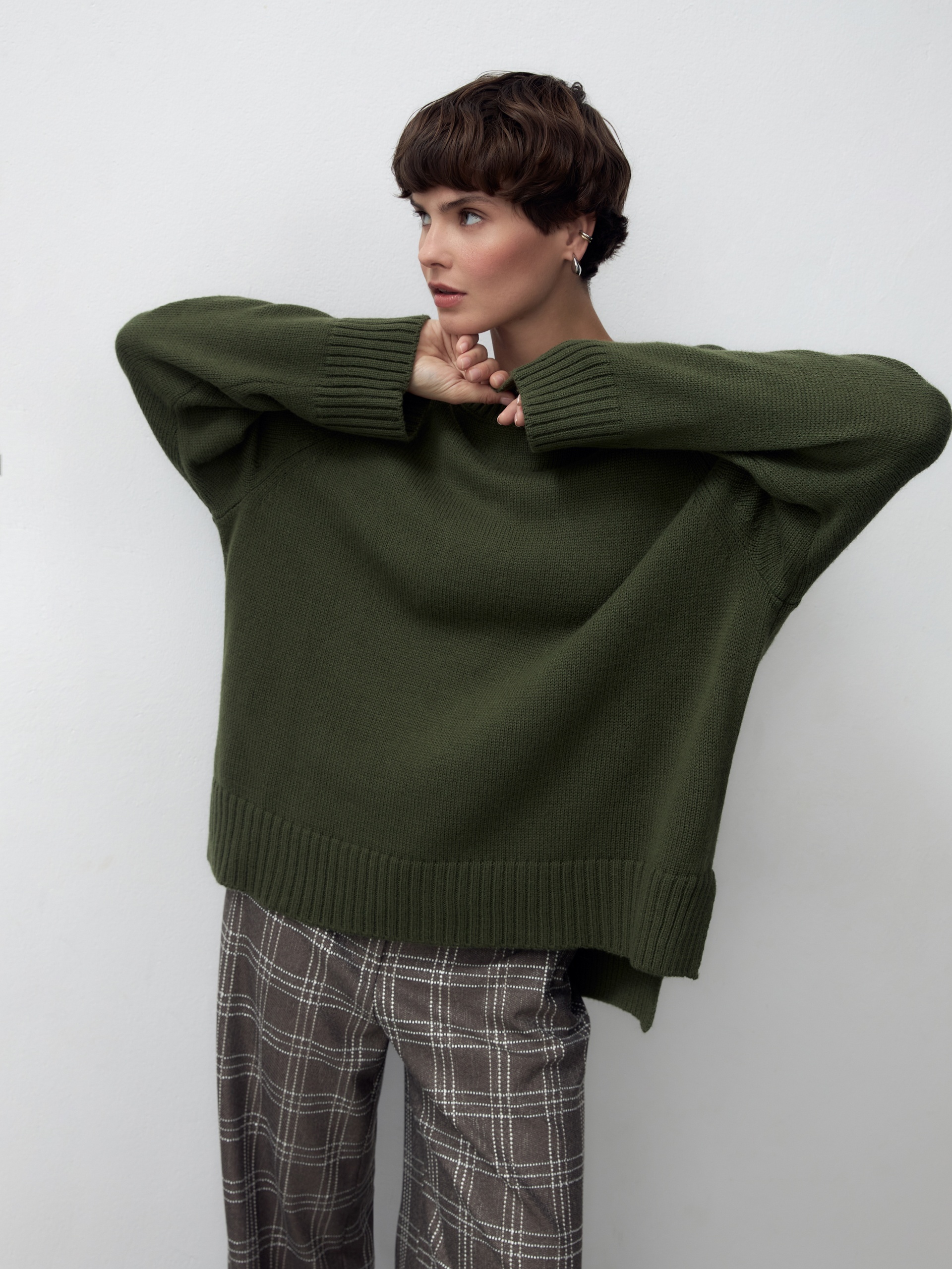 Уютный джемпер из вязаного трикотажа свободного силуэта с круглой горловиной и рукавом реглан полной длины. По низу изделия и рукавов мягкие резинки. Спинка длиннее полочки. Незаменимая вещь для комфортного и стильного осеннего гардероба.