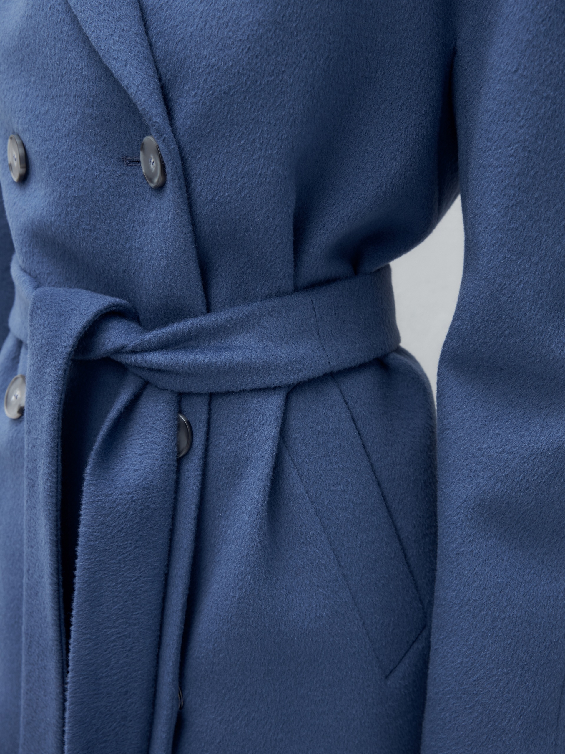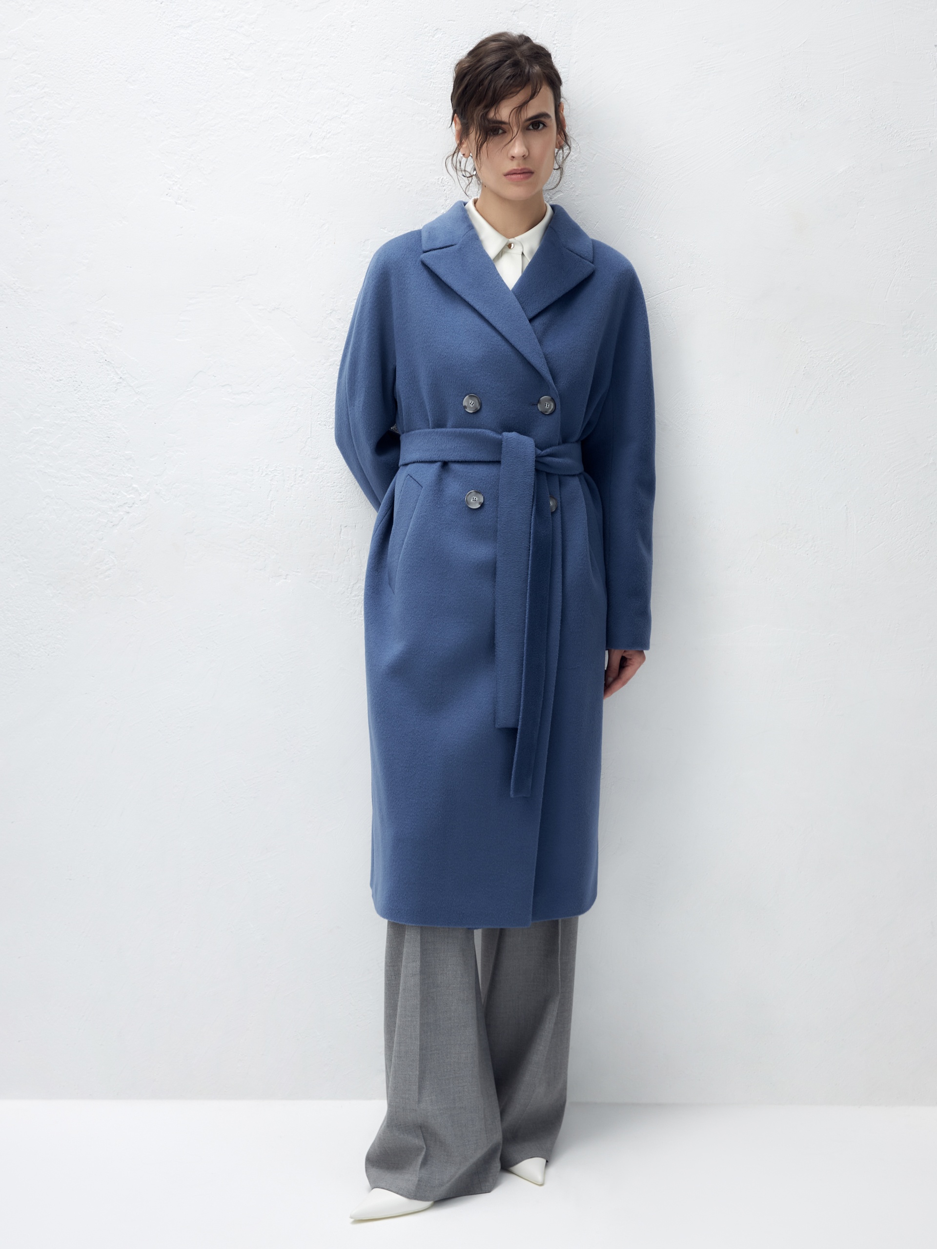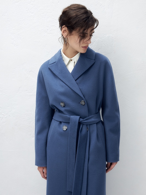Шерстяное пальто двубортное с поясом