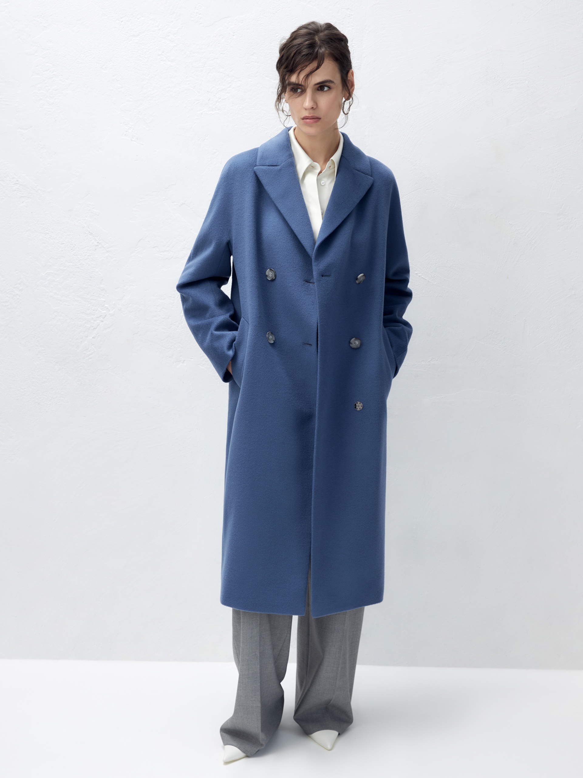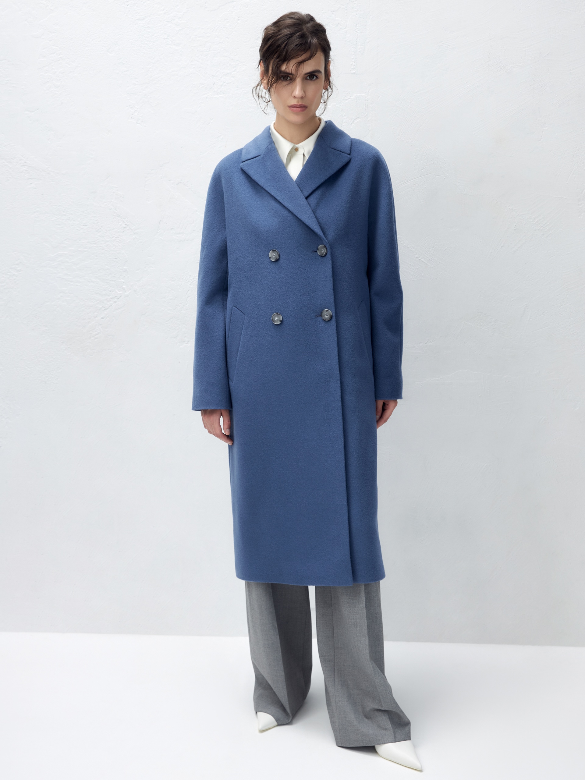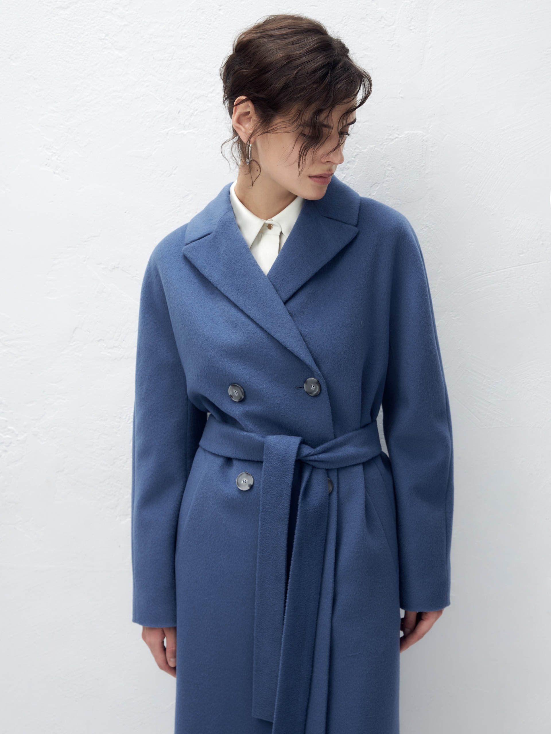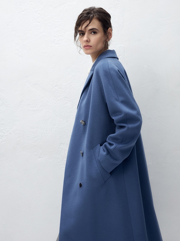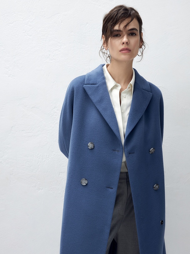 Двубортное пальто с поясом - незаменимая классика. Силуэт удлиненный кокон, цельнокроеный рукав-кимоно, классический английский воротник. Два глубоких кармана с листочками, два ряда крупных пуговиц под натуральный рог, съемный пояс из основной ткани для возможности приталивания изделия и придания ему более женственного силуэта. Пальто выполнено из ворсовой ткани с высоким содержанием шерсти в цвете "лунный синий". Для наших пальто мы используем только качественные премиальные материалы и запатентованные технологии в виде мембраны Raft-Pro, которая позволит сохранить тепло, защитит от ветра и влаги в любую непогоду. Выполнено в Санкт-Петербурге.