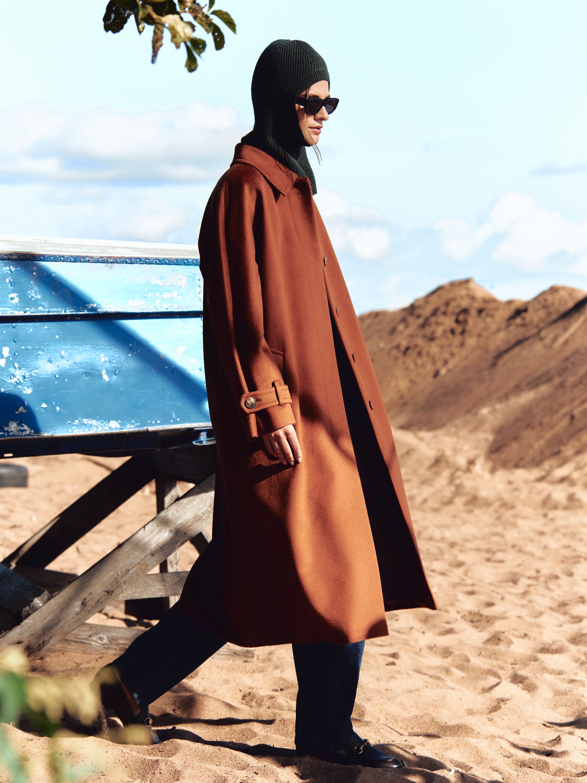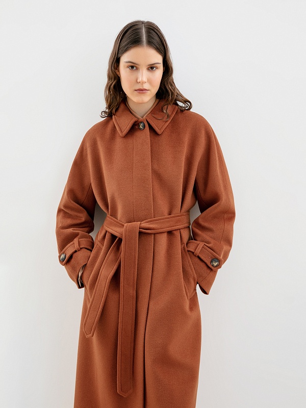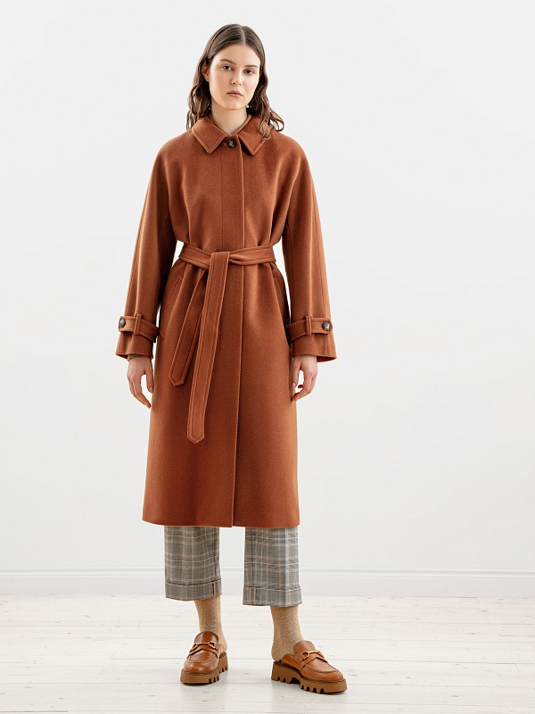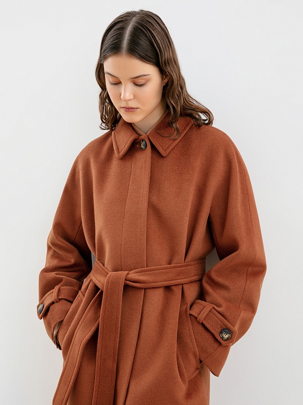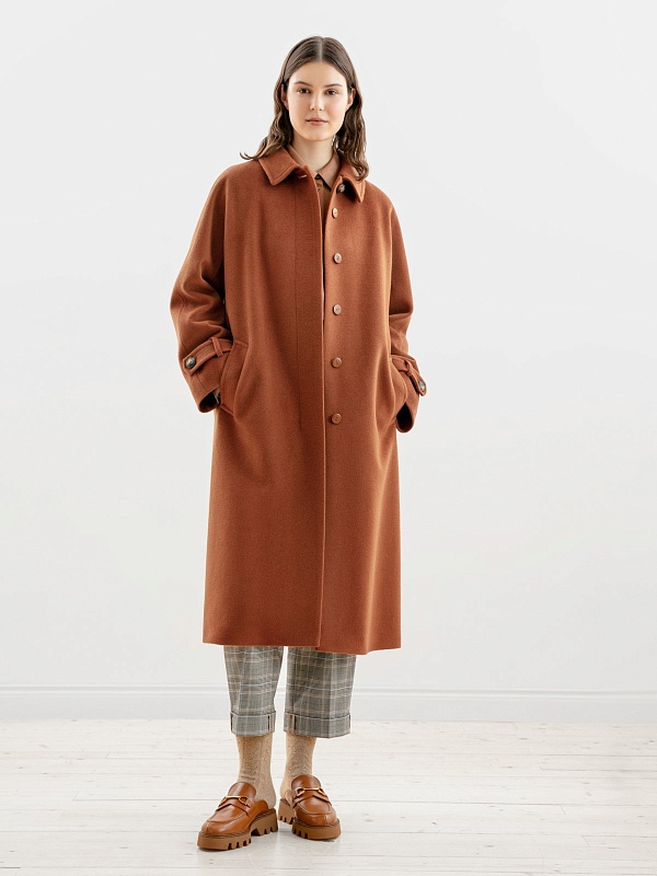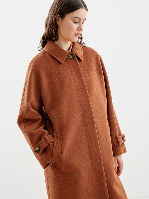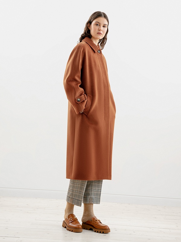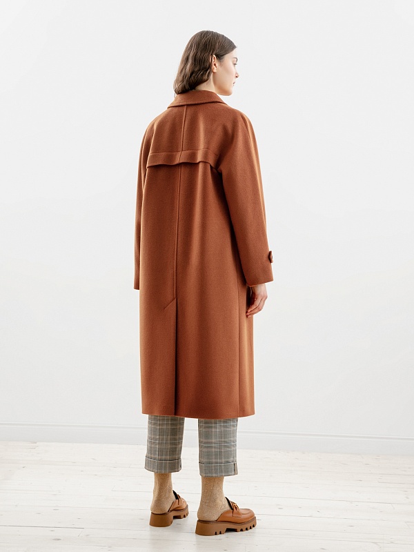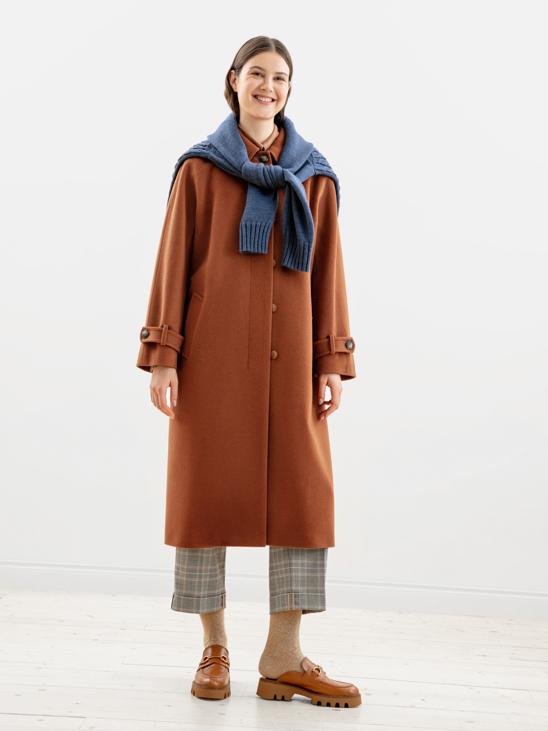 Пальто прямого силуэта из ворсовой шерстяной ткани цвета "корица". Длина до середины икры. Отложной воротник с застежкой на крупную роговую пуговицу, супатная застёжка, которая надежно фиксирует пальто и при этом не берет на себя много внимания. Комфортный комбинированный рукав смотрится очень гармонично и выдержанно со всеми элементами данного пальто. Высокая шлица в среднем шве спинки для комфорта шага, глубокие и вместительные карманы-листочки. Пальто декорировано широкой отделочной строчкой. Спинка на утеплителе RaftThermo. Пальто выполнено с использованием мембраны RaftPro, которая надежно защитит холода, ветра и перепада температур. Произведено в Санкт-Петербурге.