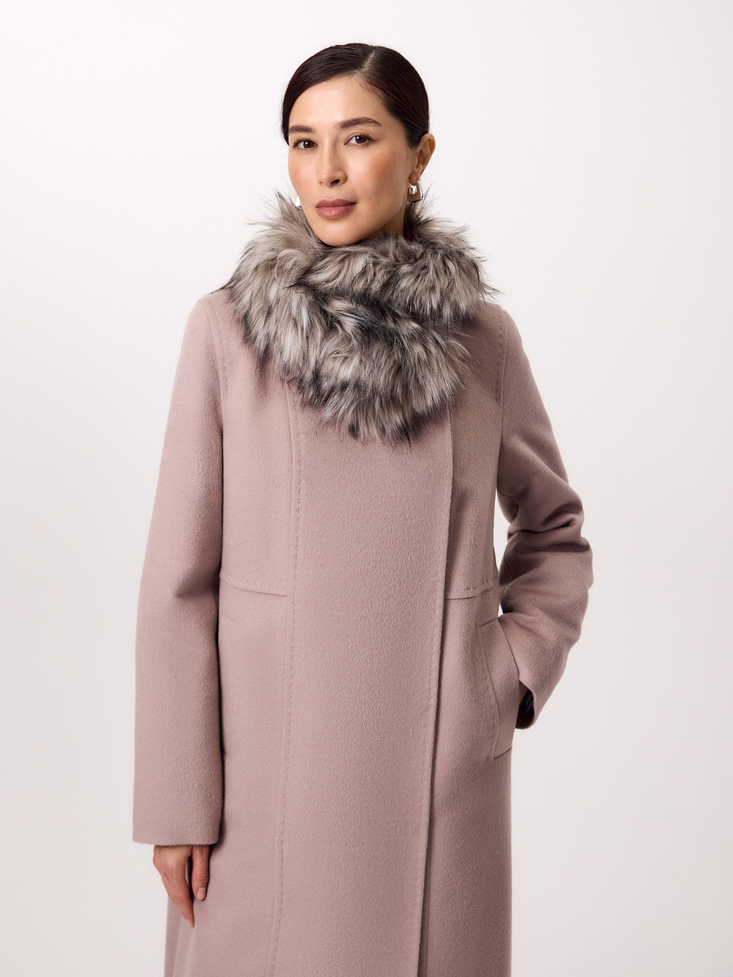 Пальто прямого силуэта из премиальной шерстяной ткани пепельно-розового цвета. Аккуратный втачной рукав, уютный воротник-стойка с отстёгивающимся воротником из искусственного енота, застёжка на пришивные кнопки. Пальто комфотрной длины ниже колена. Пальто декорировано тамбурной строчкой с имитацией ручного шва. Произведено с использованием запатентованных технологий в виде высокотехнологичной мембраны Raft Pro, надежно защищающей от дождя и ветра. Утеплитель DuPont Sorona. Произведено в Санкт-Петербурге.