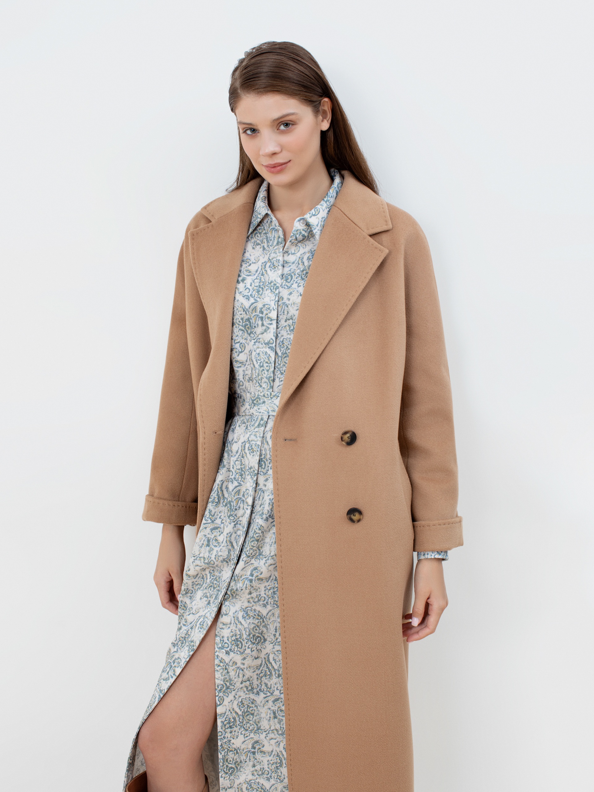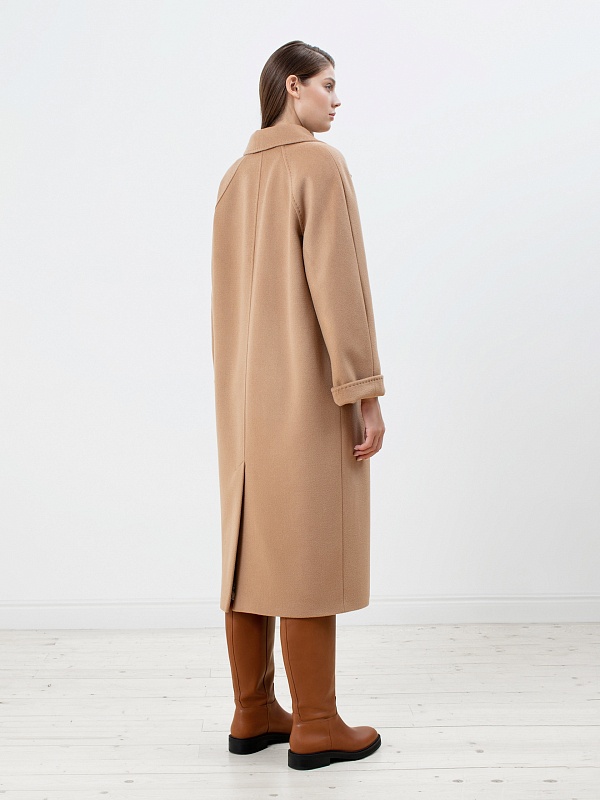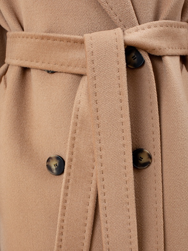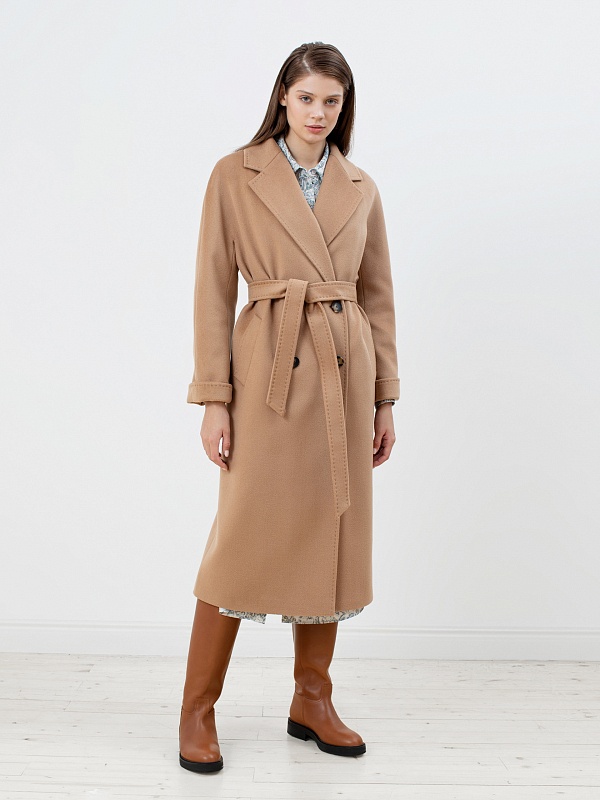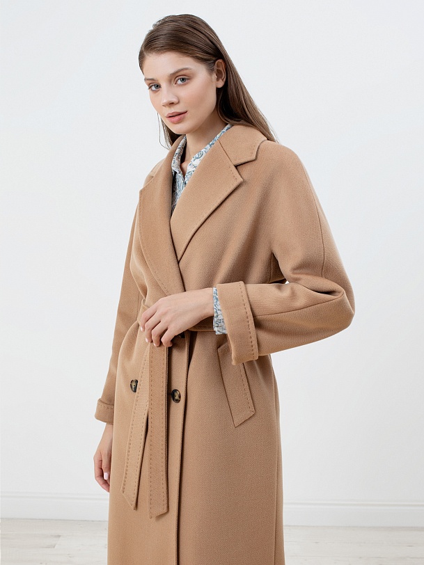 Двубортное пальто с поясом - незаменимая классика. Силуэт "удлиненный кокон", цельнокроеный рукав-кимоно, классический английский воротник с декоративной тамбурной строчкой, имитирующей ручной шов. Два глубоких кармана с листочками, два ряда крупных пуговиц под натуральный рог, съемный пояс из основной ткани для возможности приталивания изделия и придания ему более женственного силуэта. Пальто выполнено из премиальной ворсовой ткани с высоким содержанием шерсти в благородном цвете кэмел. Для наших пальто мы используем только качественные материалы и запатентованные технологии в виде мембраны Raft-Pro, которая позволит сохранить тепло, защитит от ветра и влаги в любую непогоду. Выполнено в технологии EW. Температурный режим пальто до -15 градусов. Выполнено в Санкт-Петербурге.