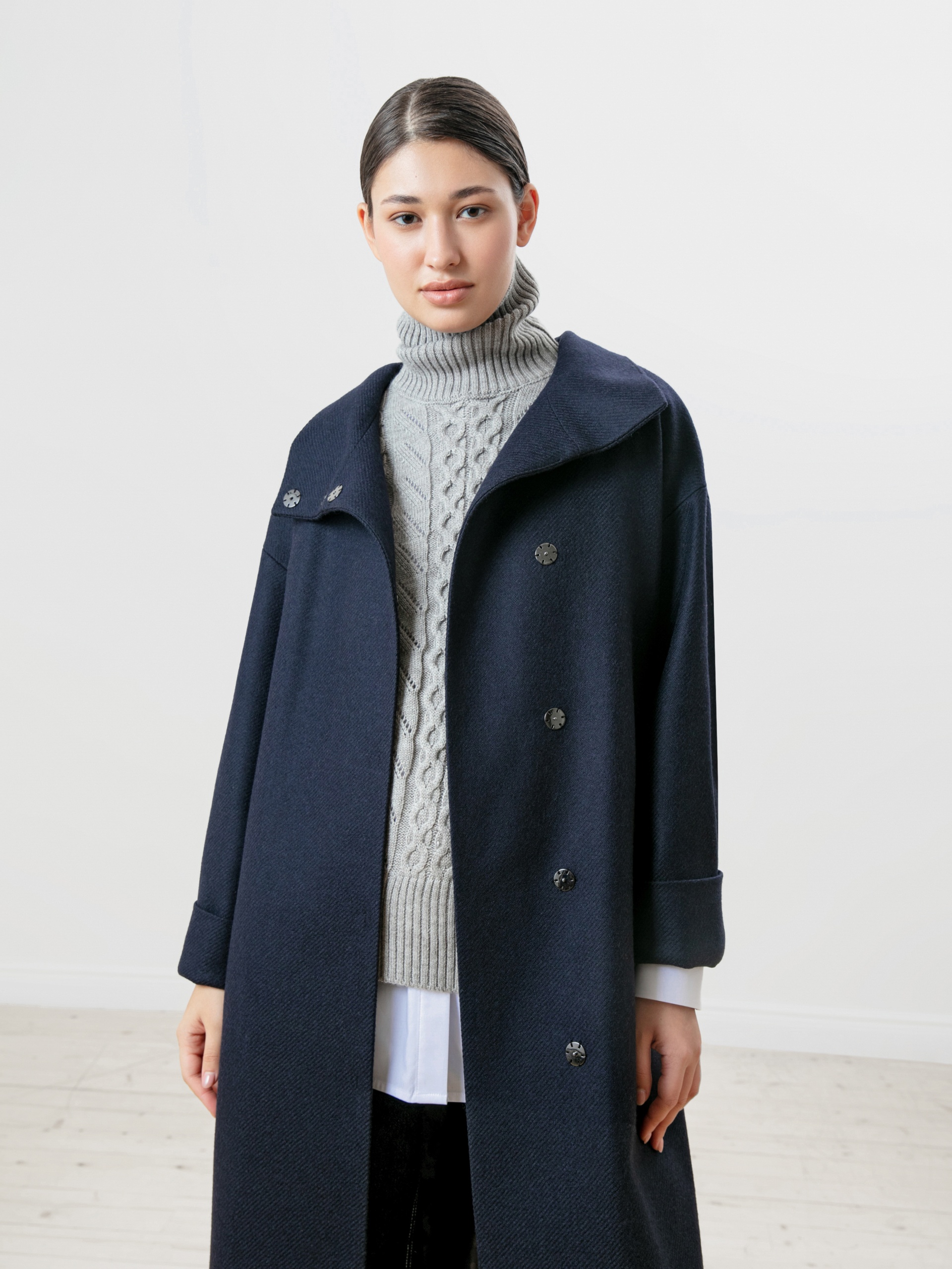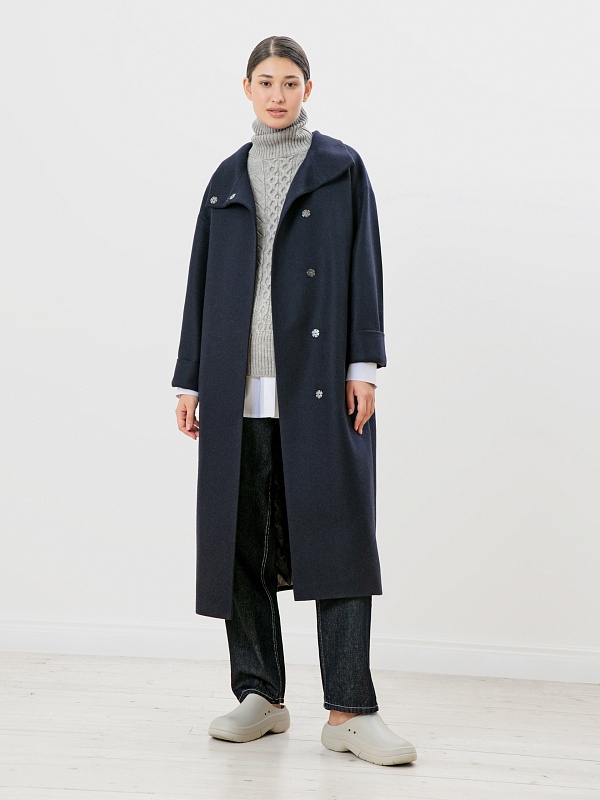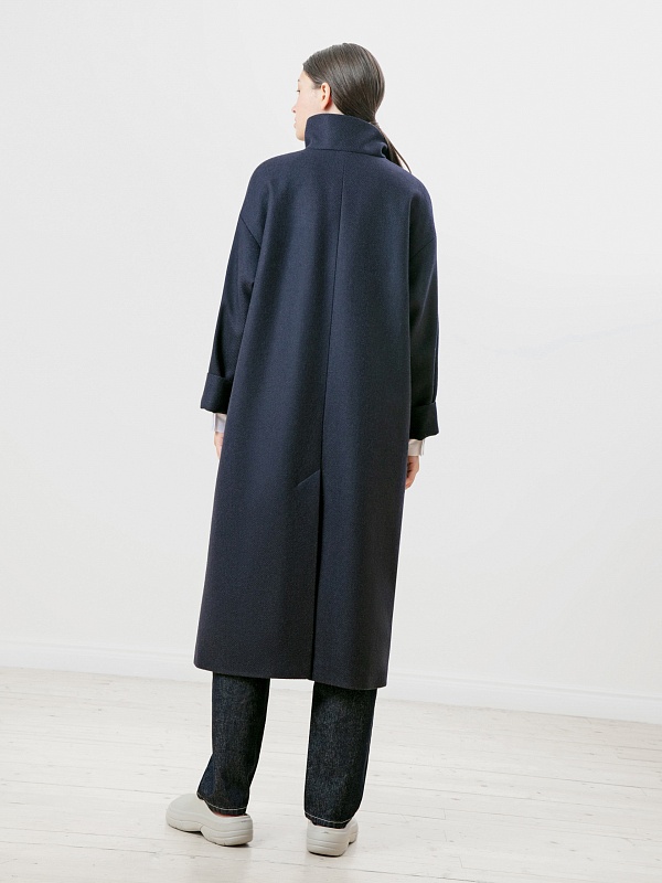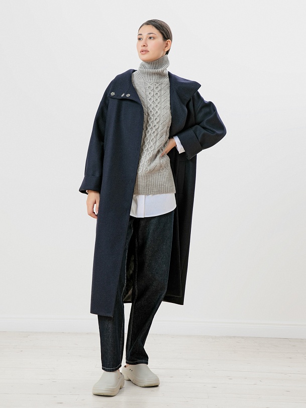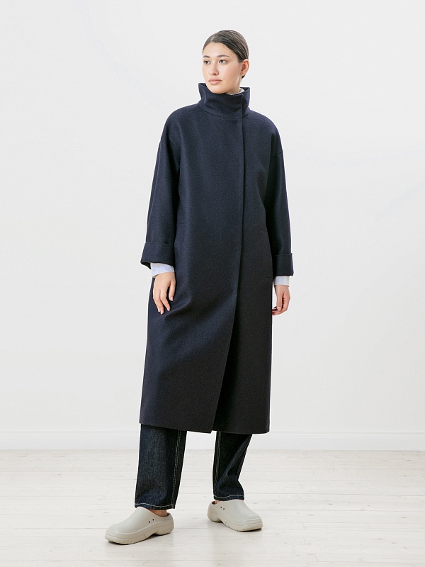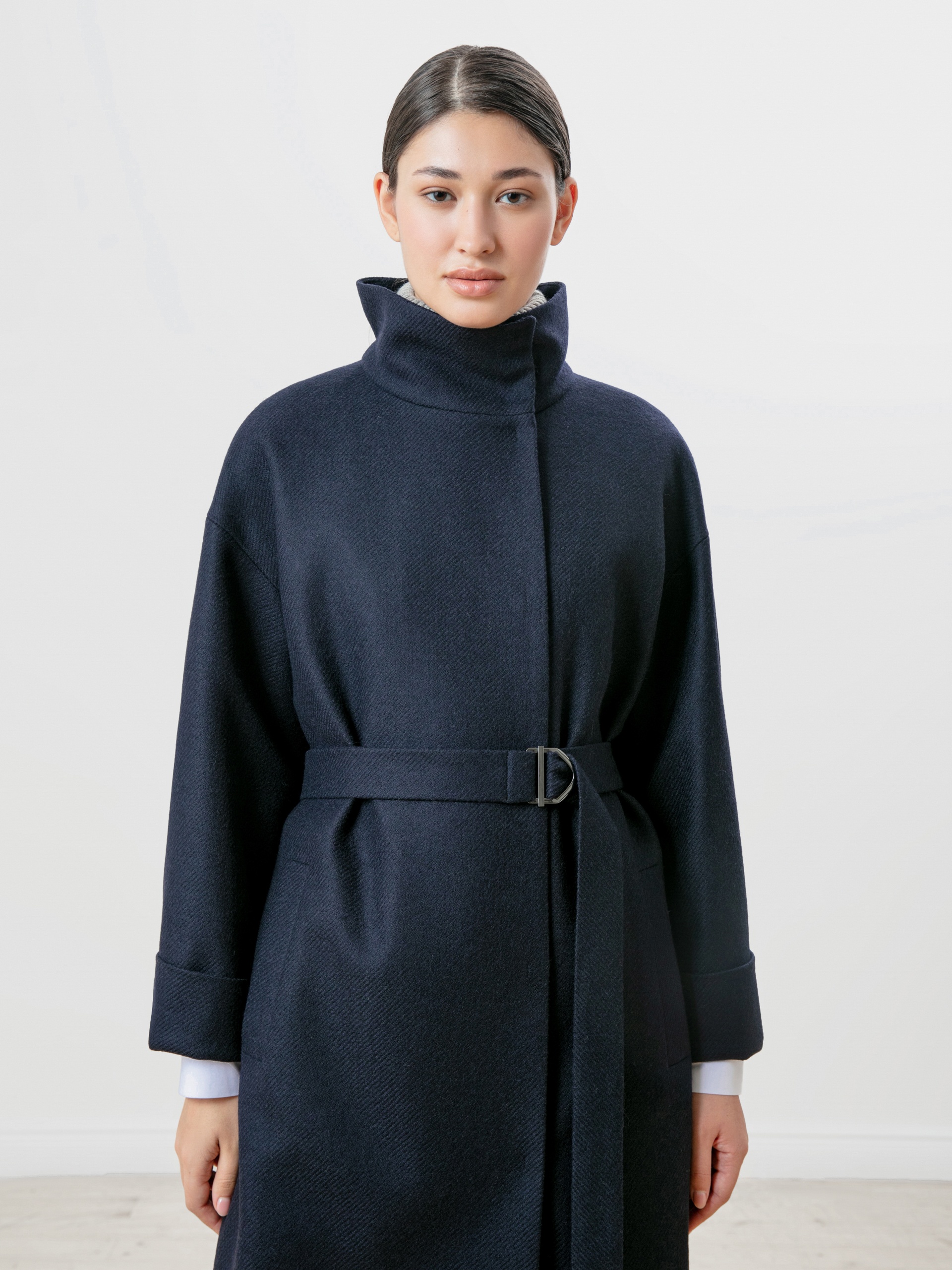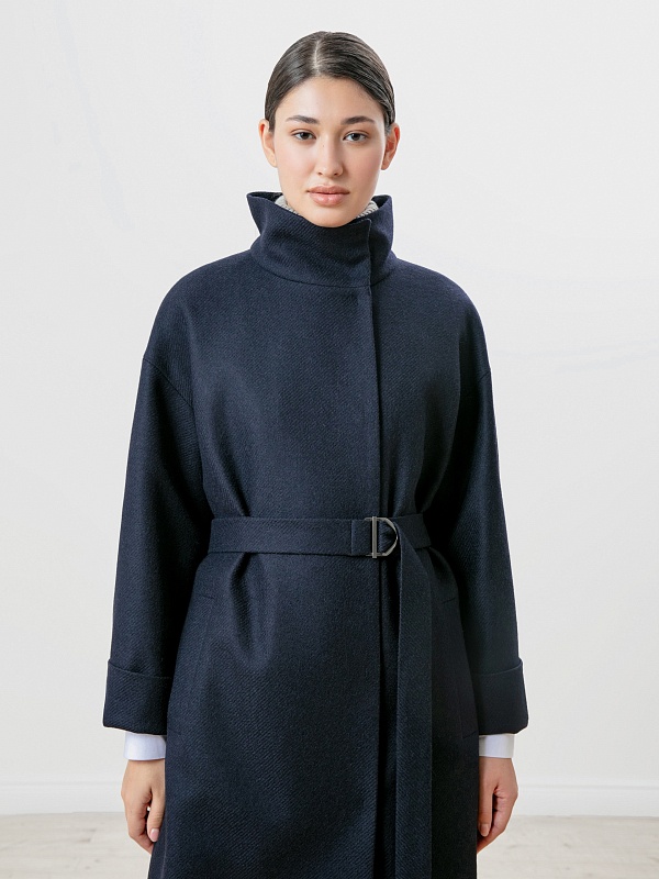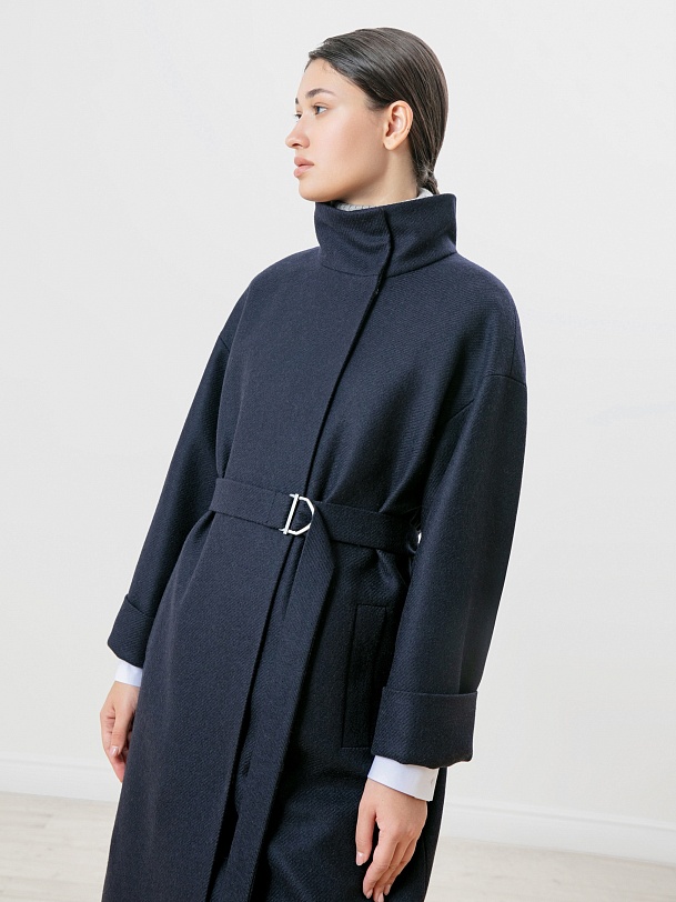 Пальто прямого силуэта из премиальной шерстяной ткани темно-синего цвета с эффектом twill. Длина пальто ниже колена, что позволяет носить его как с брюками, так и с юбками. Воротник-стойка, комфортный рубашечный рукав с возможностью отворота по низу. Застежка на ряд пришивных кнопок. В комплекте с пальто пояс из основной ткани с декоративной пряжкой в цвете темный никель. Пояс съемный, благодаря чему пальто можно ность как прямым, так и приталивать, придавая образу более женственный силуэт. Пальто выполнено с применением запатентованных технологий в виде высокотехнологичной мембраны Raft-Pro, которая надежно защитит от ветра и дождя, при этом не утяжеляя пальто. Произведено в Санкт-Петербурге.