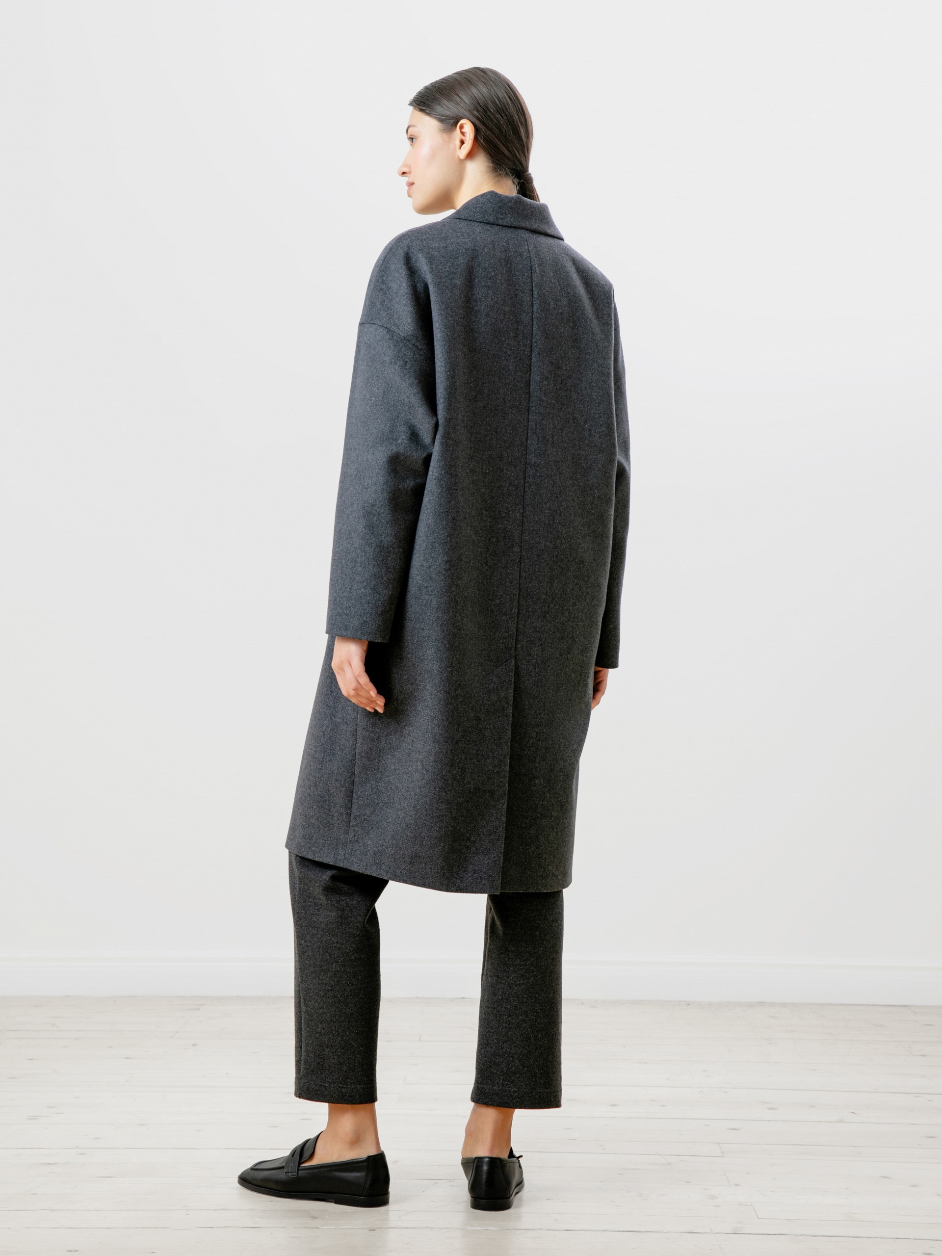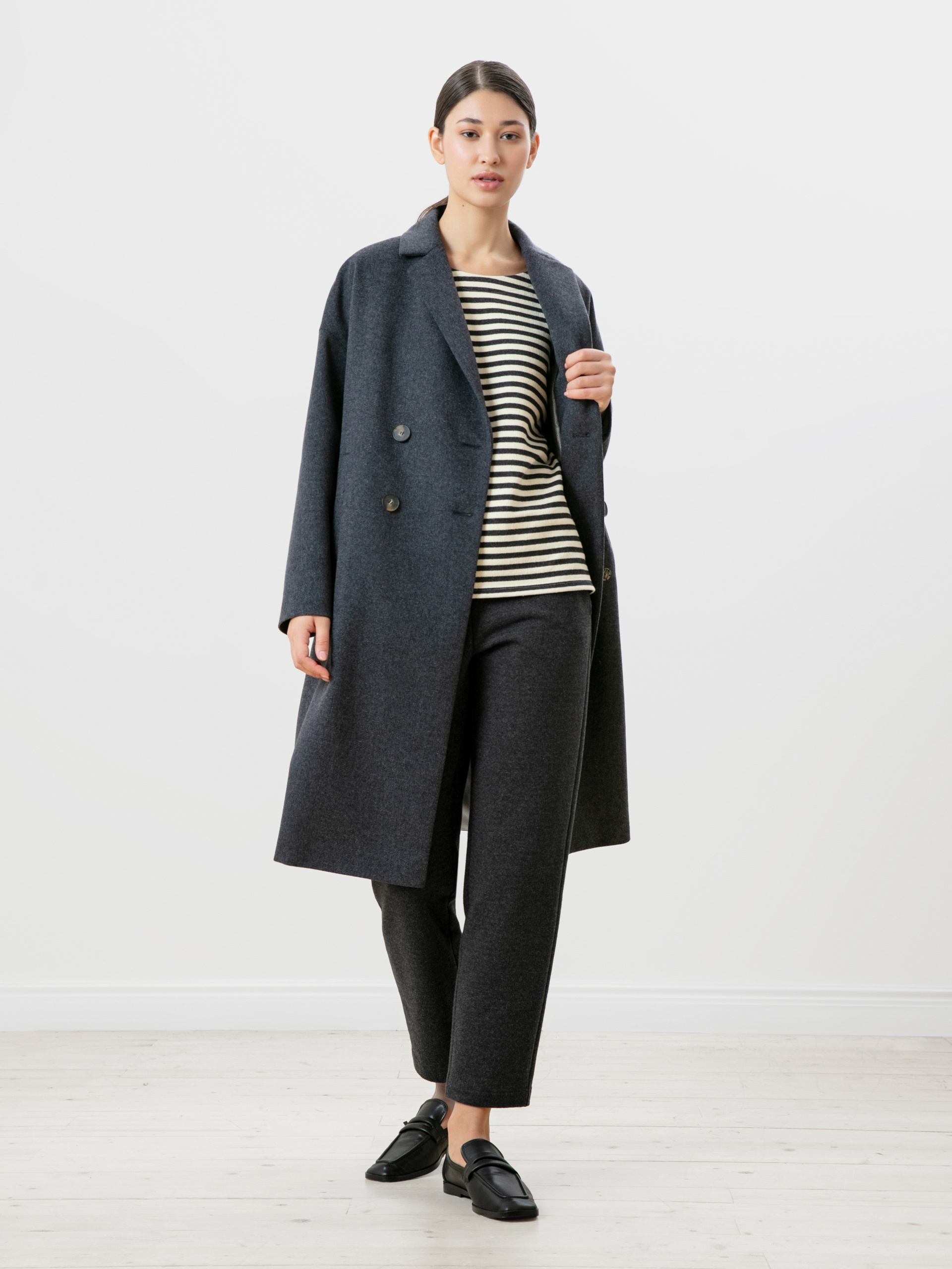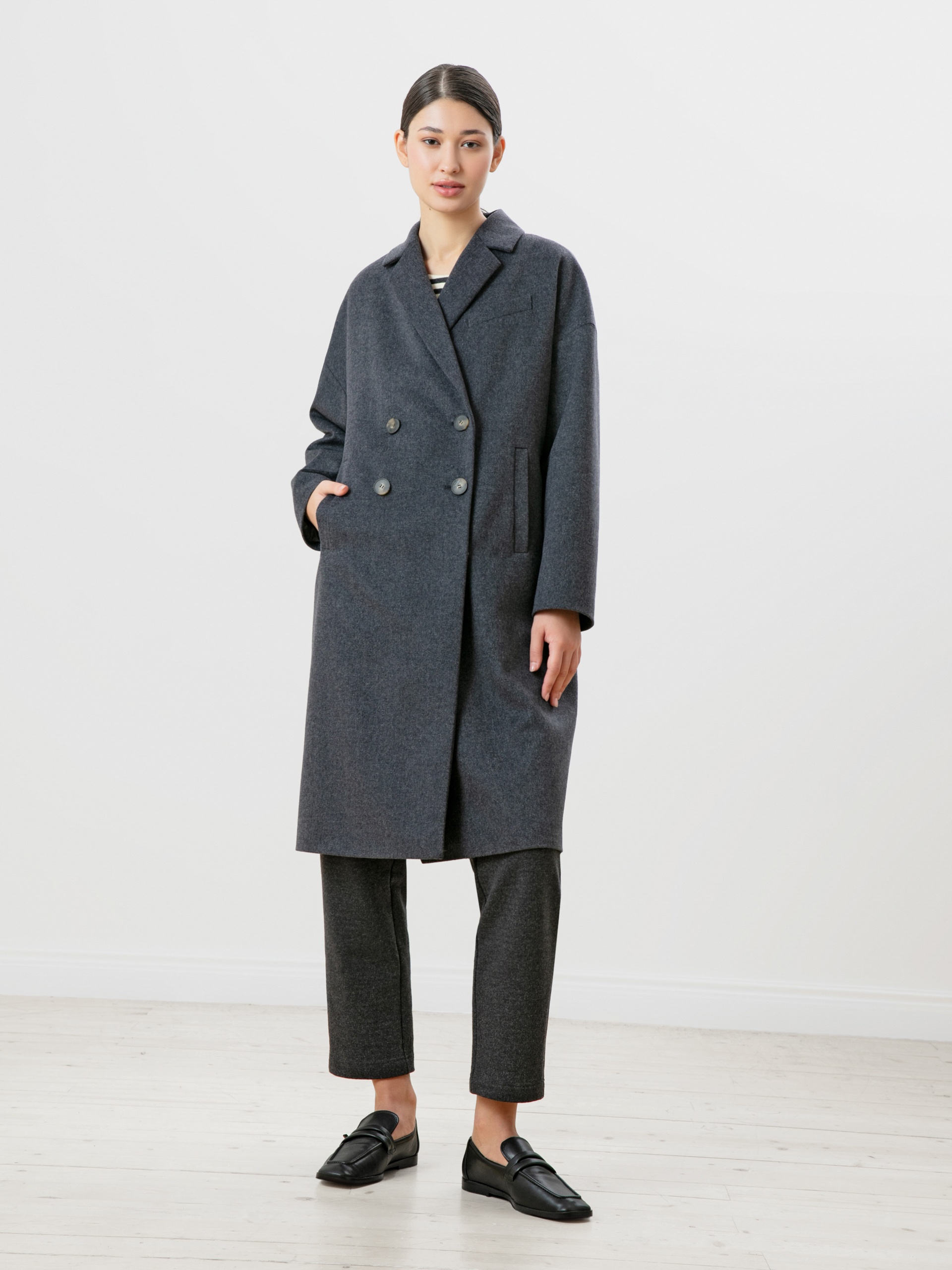 Двубортное пальто из премиальной ткани с высоким содержанием шерсти и эффектом twill в универсальном серо-синем цвете. Универсальная длина пальто закрывает колено и позволяет с легкостью комбинировать его с любым гардеробом. Рубашечный рукав дает возможность носить пальто даже на объемные вещи и при этом не стесняет движение, классический английский воротник придает элегантности, а карманы-листочки служат дополнительным декоративным элементом, как и застежка на два ряда крупных пуговиц под натуральный рог. Пальто изготовлено из шерстяной ткани с использованием запатентованных технологий в виде высокотехнологичной мембраны RaftPro, которая защищает даже от сильного ветра. Пальто выполнено в технологии EW - утеплитель по спинке. Произведено в Санкт-Петербурге.