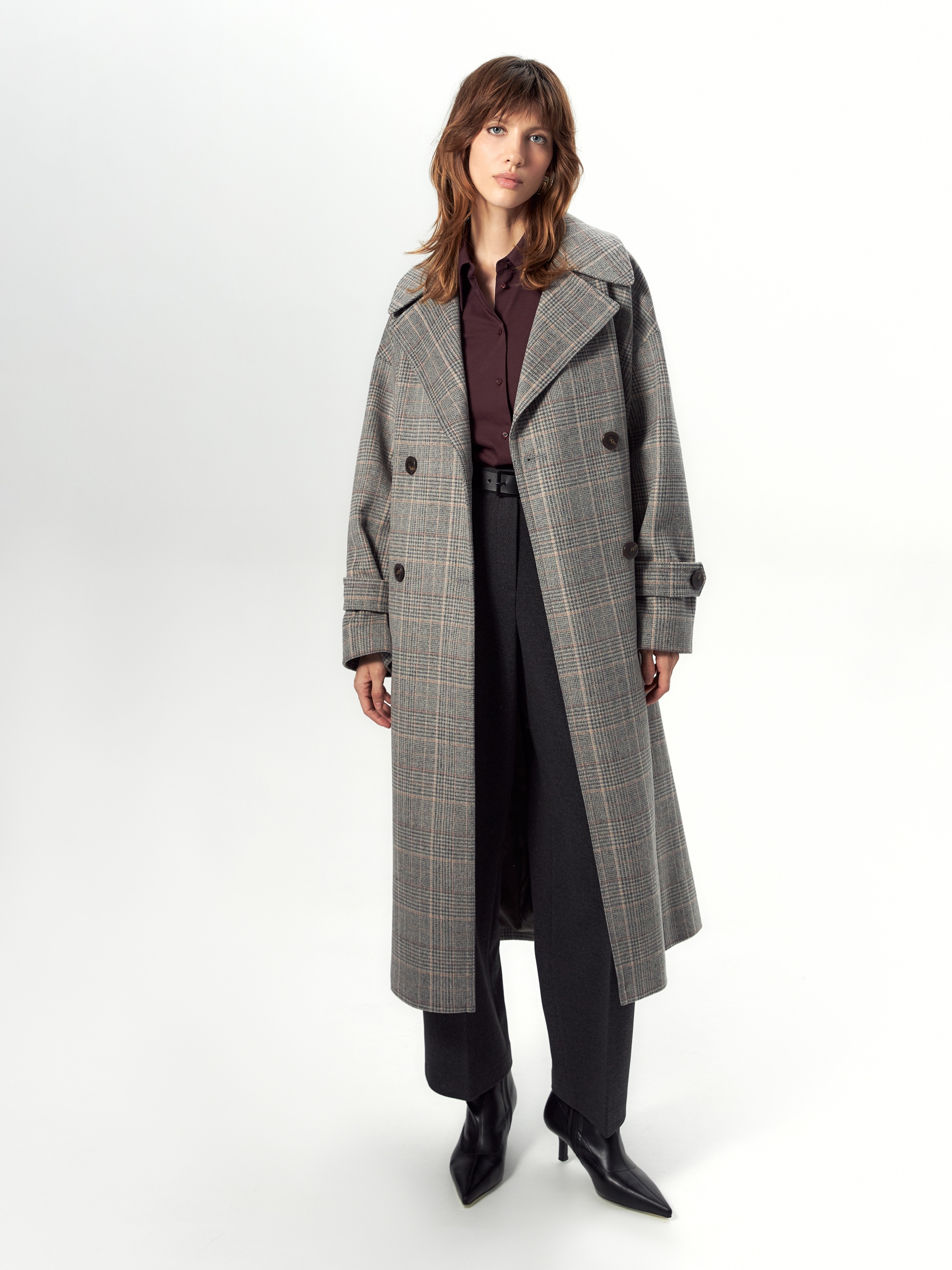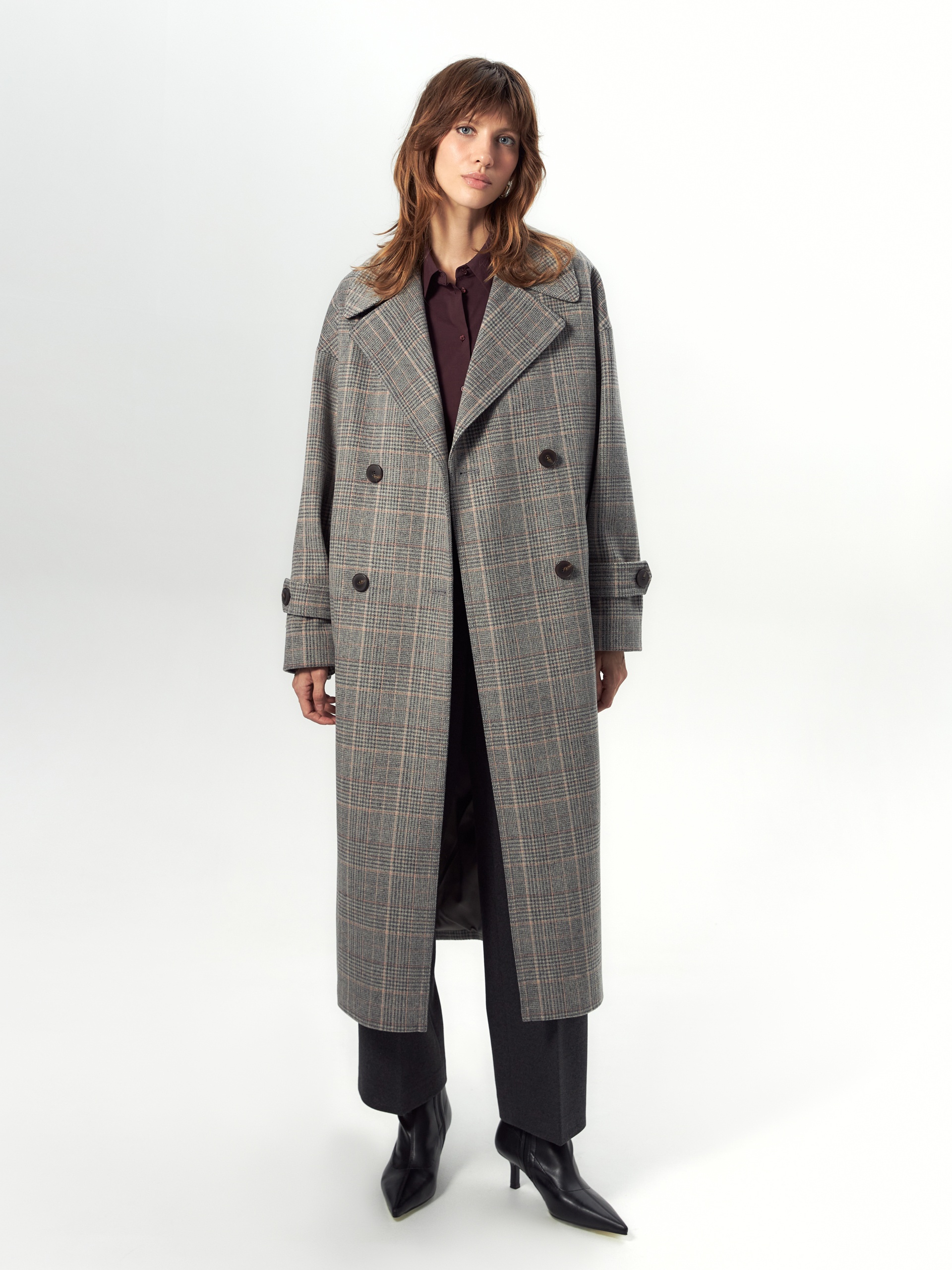 Двубортное пальто прямого силуэта - это всем полюбившаяся классика пальто, представленная в новом и современном видении. Пальто комфортной длины ниже колена, что расширяет возможности для формирования образов. Рукав рубашечный со спущеной линией плеча не только визуально деалает более уютный и расслабленный образ, но и создает дополнительный комфорт для Вас, ведь рукав такого типа не стесняет движение и позволяет надевать вниз даже объемные вещи. По низу рукава расположены декоративные паты с крупными пуговицами. Горловину пальто обрамляет классический английский воротник. Пальто имеет два глубоких кармана с листочками. Застегивается на два ряда стильных крупных пуговиц под натуральный рог. Дополняет образ съемный пояс из основной ткани, благодаря которому можно подчеркнуть утонченность талии и создать более женственный и хрупкий образ. Пальто изготовлено из премиальной ткани с высоким содержанием шерсти в серо-бежевую клетку. Произведено с использованием запатентованных технологий в виде высокотехнологичной мембраны Raft-Pro, которая служит надежной защитой от ветра и дождя. У пальто утеплена спинка. Температурный режим до -15. Произведено в Санкт-Петербурге.