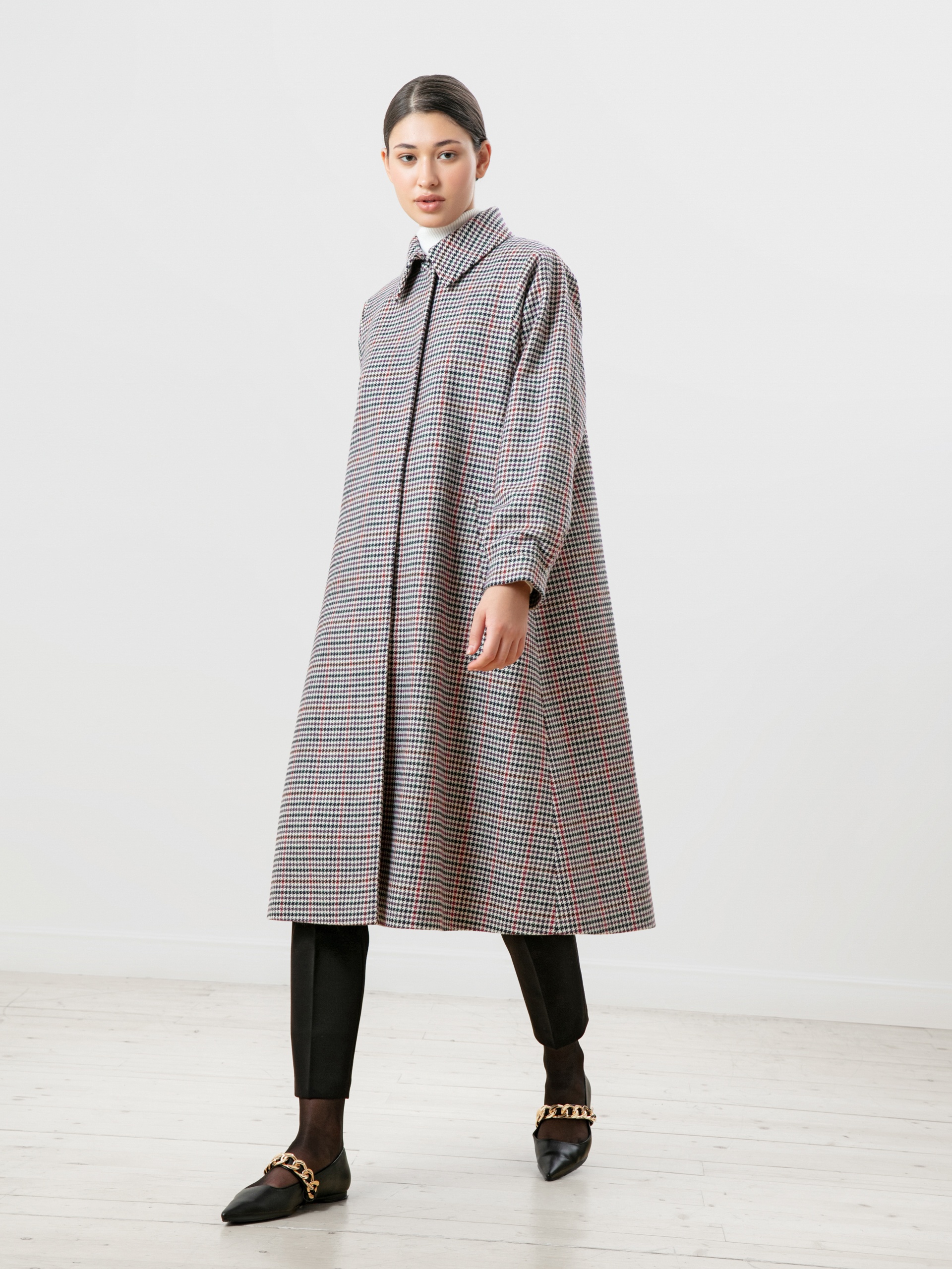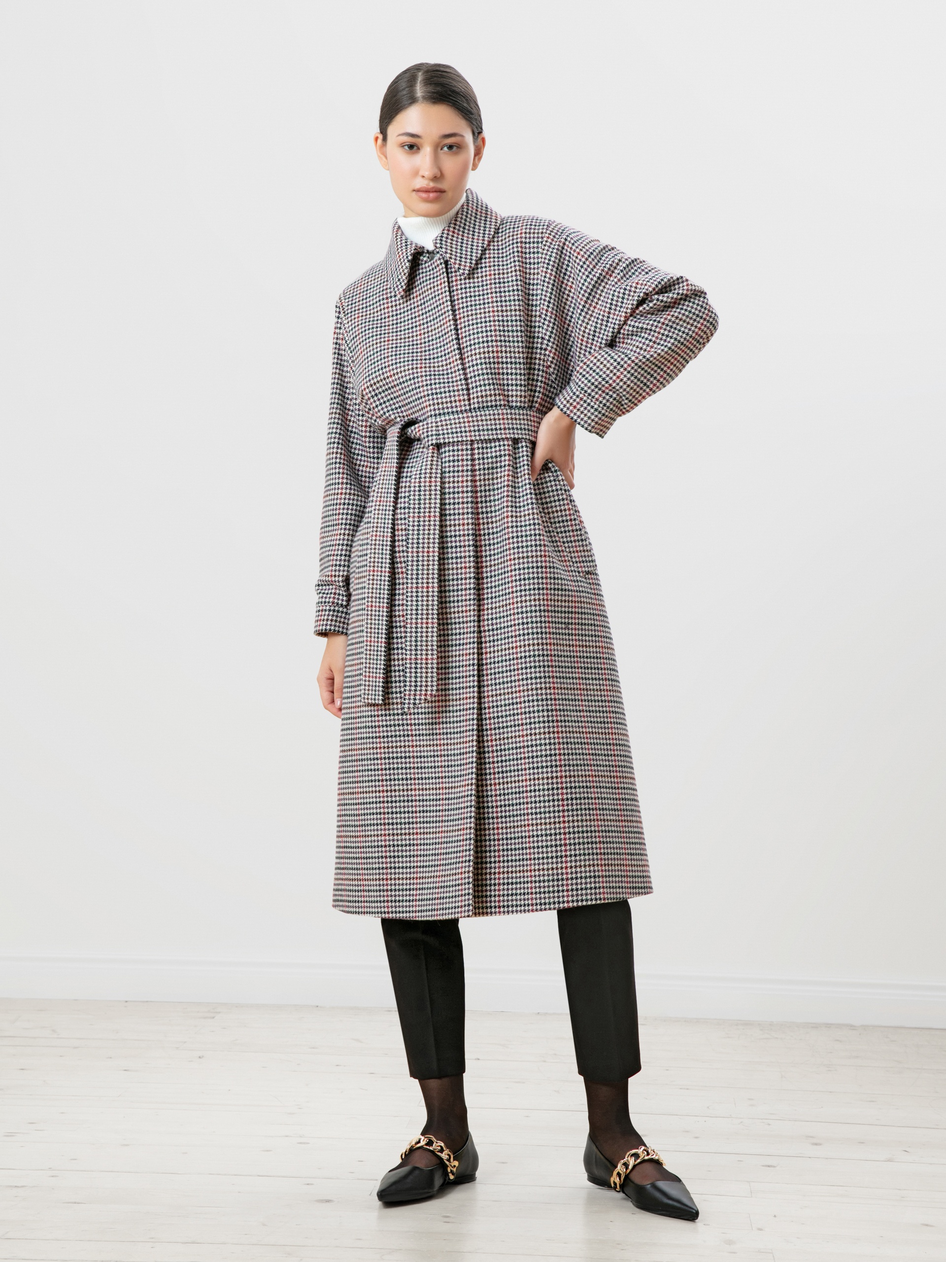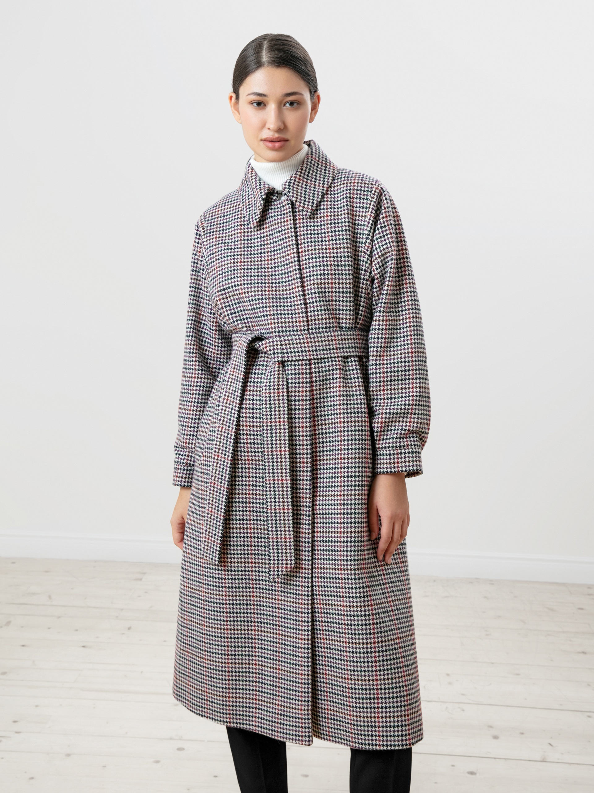 Пальто трапециевидного силуэта из шерстяной ткани в принт пье-де-пуль в нетипичном черно-фиолетовом цвете. Аккуратный отложной воротник с застежкой на крючок, что защитит зону декольте от ветра без использования дополнительных теплых аксессуаров. Отезной рукав-кимоно, как новое видение классического отрезного рукава, при этом рукав остается очень комфортным и не стесняет движение. Низ рукава со складкой для придания женственного объема рукаву и, при этом, обработан манжетой. Застежка на ряд пришивных кнопок. В комплекте к пальто идет съемный пояс из основной ткани, который с легкостью подчеркнет силуэт и сделает образ более женственным. Пальто выполнено с использованием запатентованных технологий в виде мембраны RaftPro, которая надежно защитит от ветра и дождя. Произведено в Санкт-Петербурге.