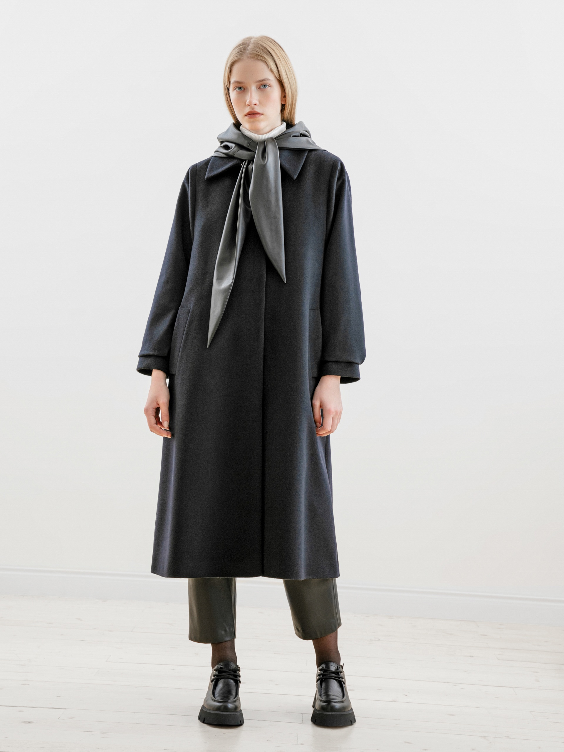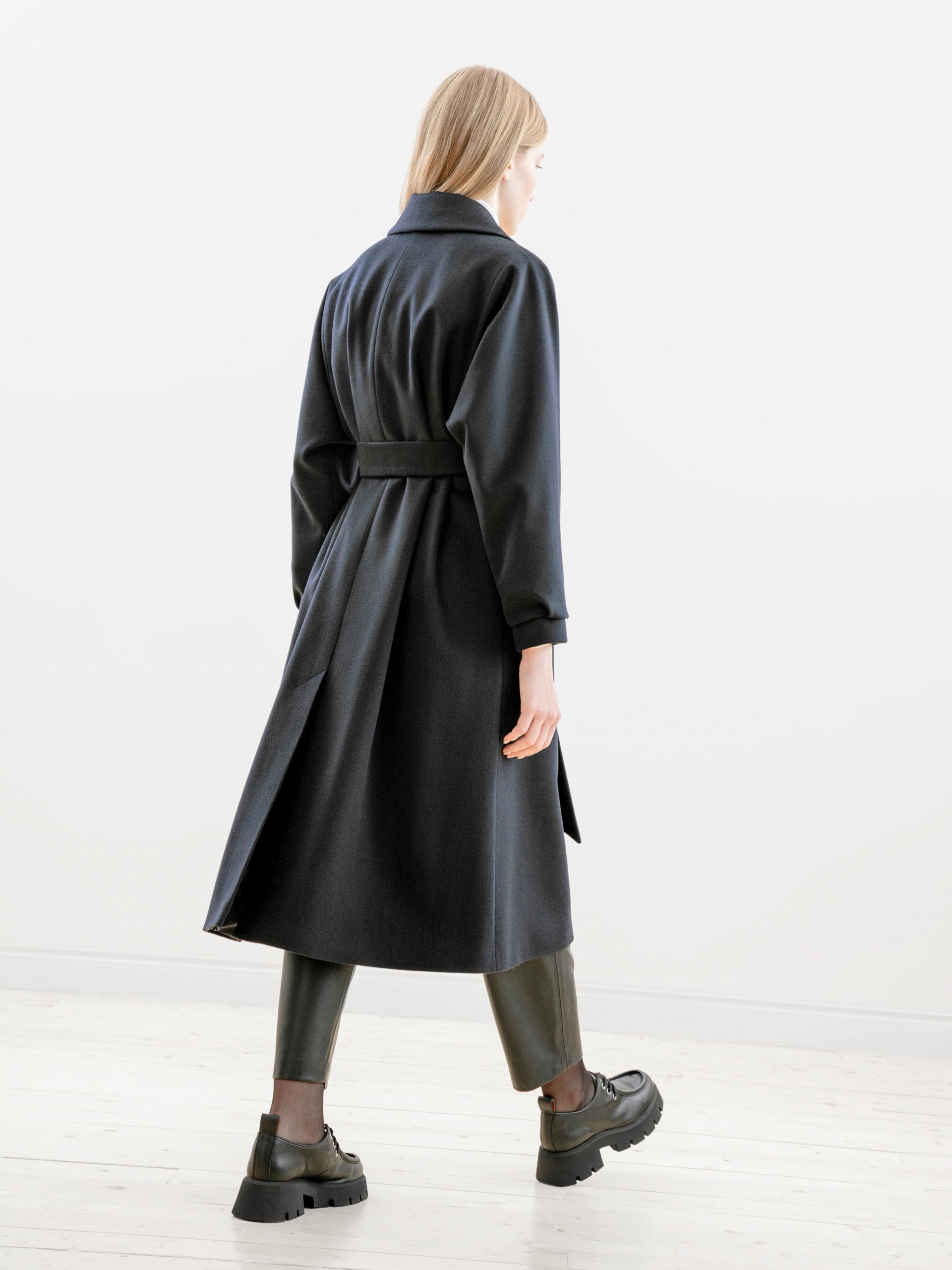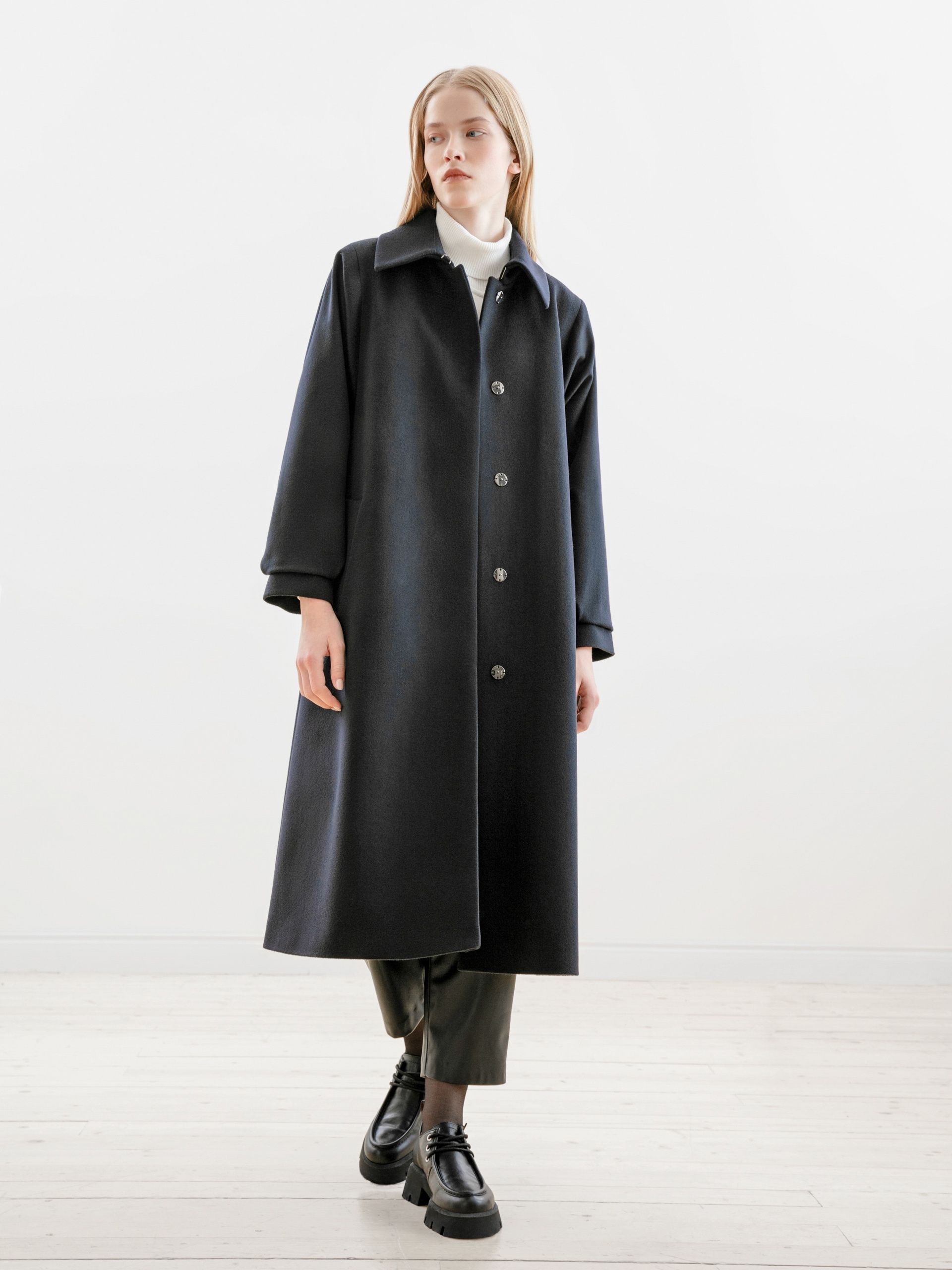 Пальто трапециевидного силуэта из премиальной ткани с 90% шерсти и 10% кашемира в классическом темно-синем цвете. Аккуратный отложной воротник с застежкой на крючок, это позволяет защитить зону декольте от ветра без использования дополнительных теплых аксессуаров. Отрезной рукав-кимоно как новое видение классического отрезного рукава, при этом рукав остается очень комфортным и не стесняет движений. Низ рукава со складкой для придания женственного объема рукаву и при этом обработан манжетой. Застежка на ряд пришивных кнопок. В комплекте к пальто идет съемный пояс, который с легкостью подчеркнет силуэт и сделает образ более женственным. Пальто выполнено с использованием запатентованных технологий. Между шерстяной и подкладочной тканью находится слой мембраны RaftPro, которая надежно защитит от ветра и холода. Произведено в Санкт-Петербурге.