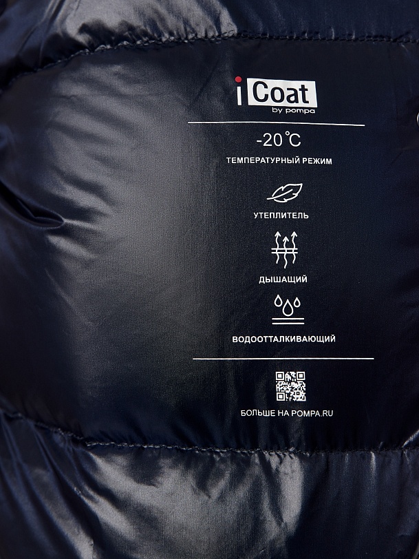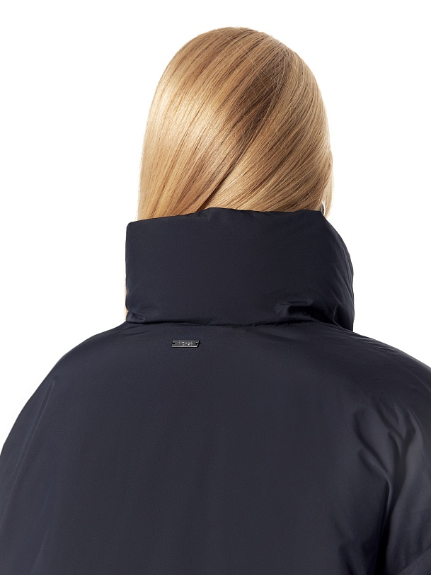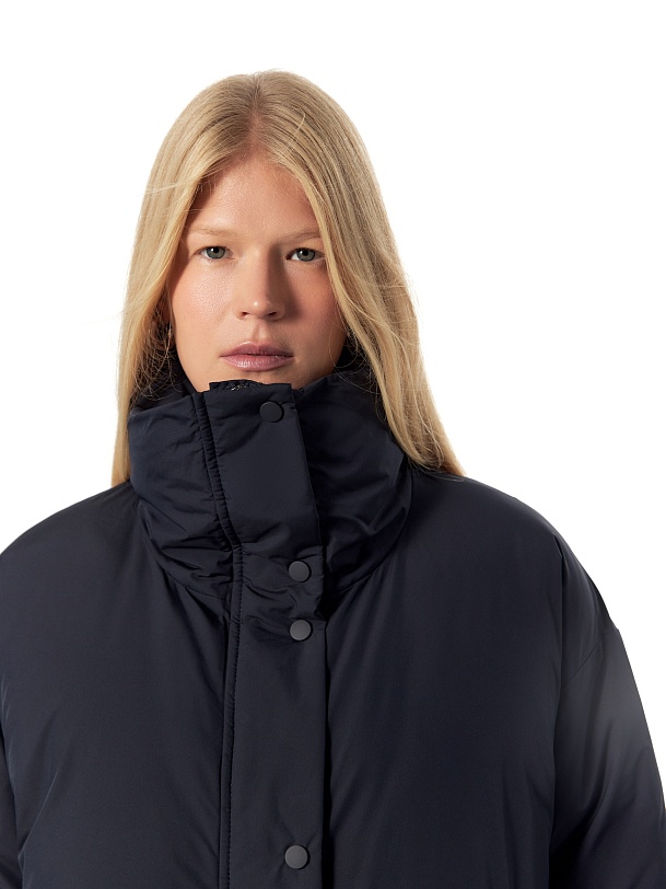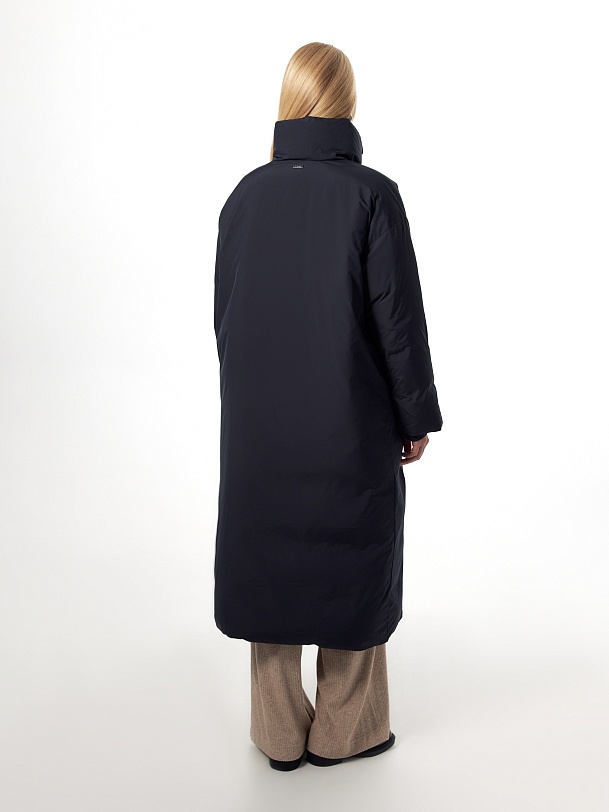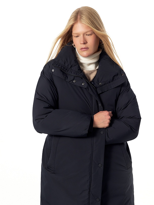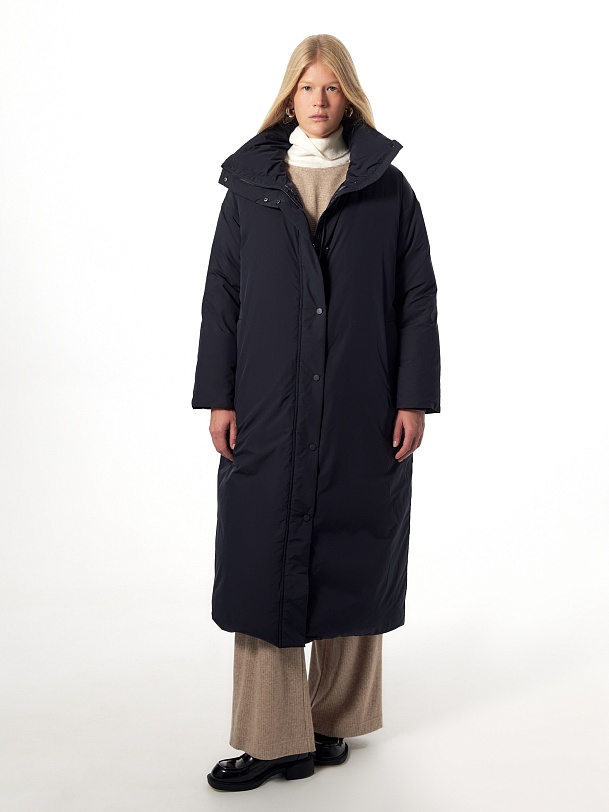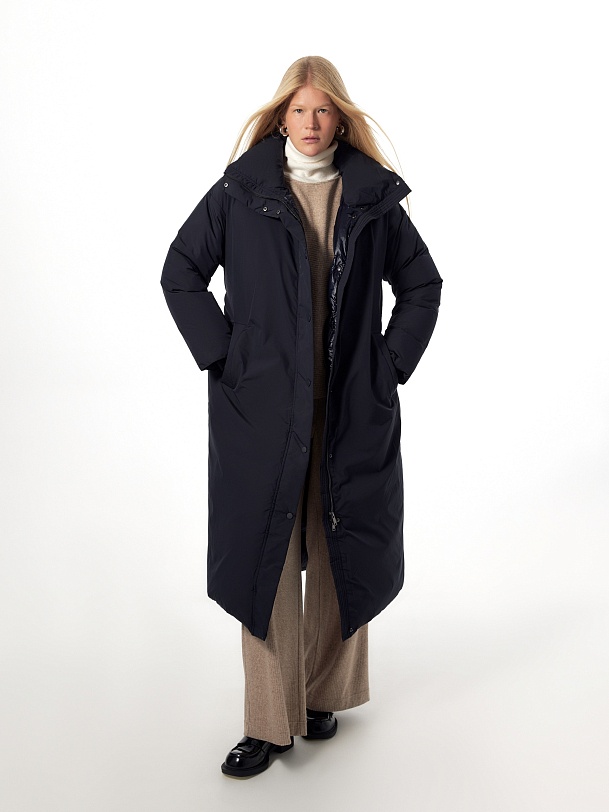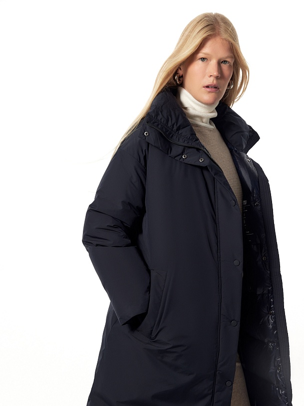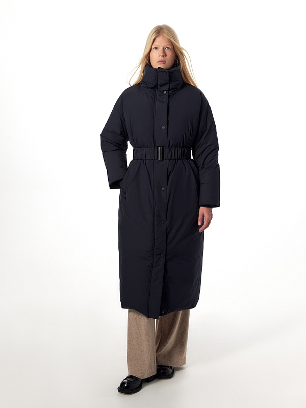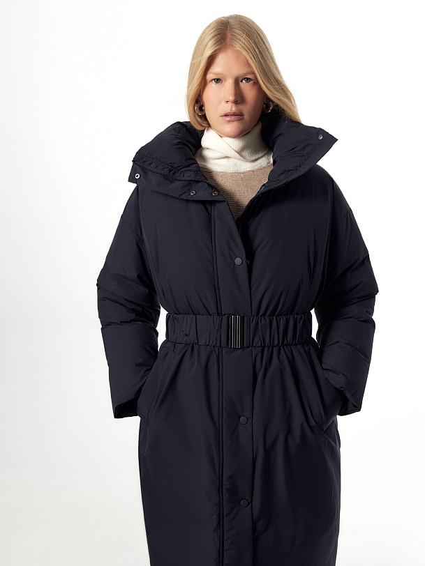 Утепленное пальто прямого силуэта из плащевой ткани темно-синего цвета. Пальто произведено из премиальной плащевой ткани. В качестве утеплителя 90% пух и 10% перо. Комфортный рубашечный рукав, высокий воротник-стойка, что позволяет не использовать дополнительные теплые аксессуары, и при этом надежно сохраняет тепло. По низу рукава вязаная манжета в цвет основной ткани для дополнительного тепла. Длина пальто миди. Застежка на молнию и ряд потайных кнопок. В качестве дополнительного декора пояс-резинка на стильную металлическую пряжку, который дает возможность подчеркнуть силуэт. Внутренняя сторона пальто со стильной стежкой, которая переходит на лицевую сторону.