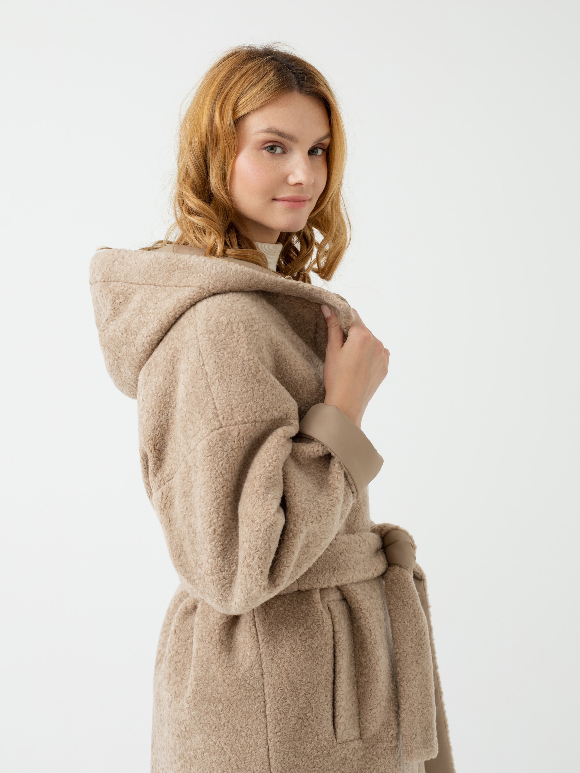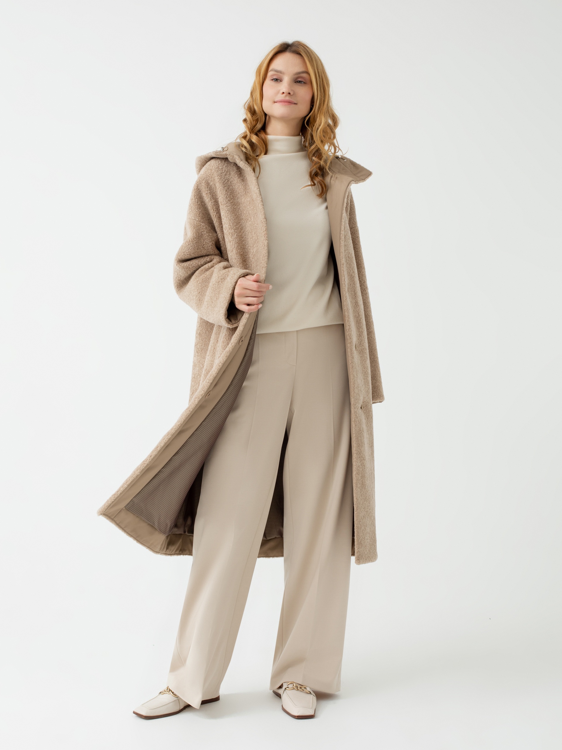 Зимняя шуба прямого силуэта из искусственного меха в благородном цвете "кэмел". Длина шубы закрывает колено, воротник-стойка переходит в теплый глубокий капюшон. Спущенный рубашечный рукав позволяет надевать свободные вещи и не стесняет движений. Внутренняя отделка низа рукавов позволяет при необходимости подвернуть рукава. Глубокие и при этом незаметные карманы. Съёмный пояс подчеркнет талию и дополнительно защитит от ветра. Шуба выполнена с использованием запатентованных технологий в виде высокотехнологичной мембраны RaftPro, надежно защищающей от ветра, и современного утеплителя. Произведено в Санкт-Петербурге.