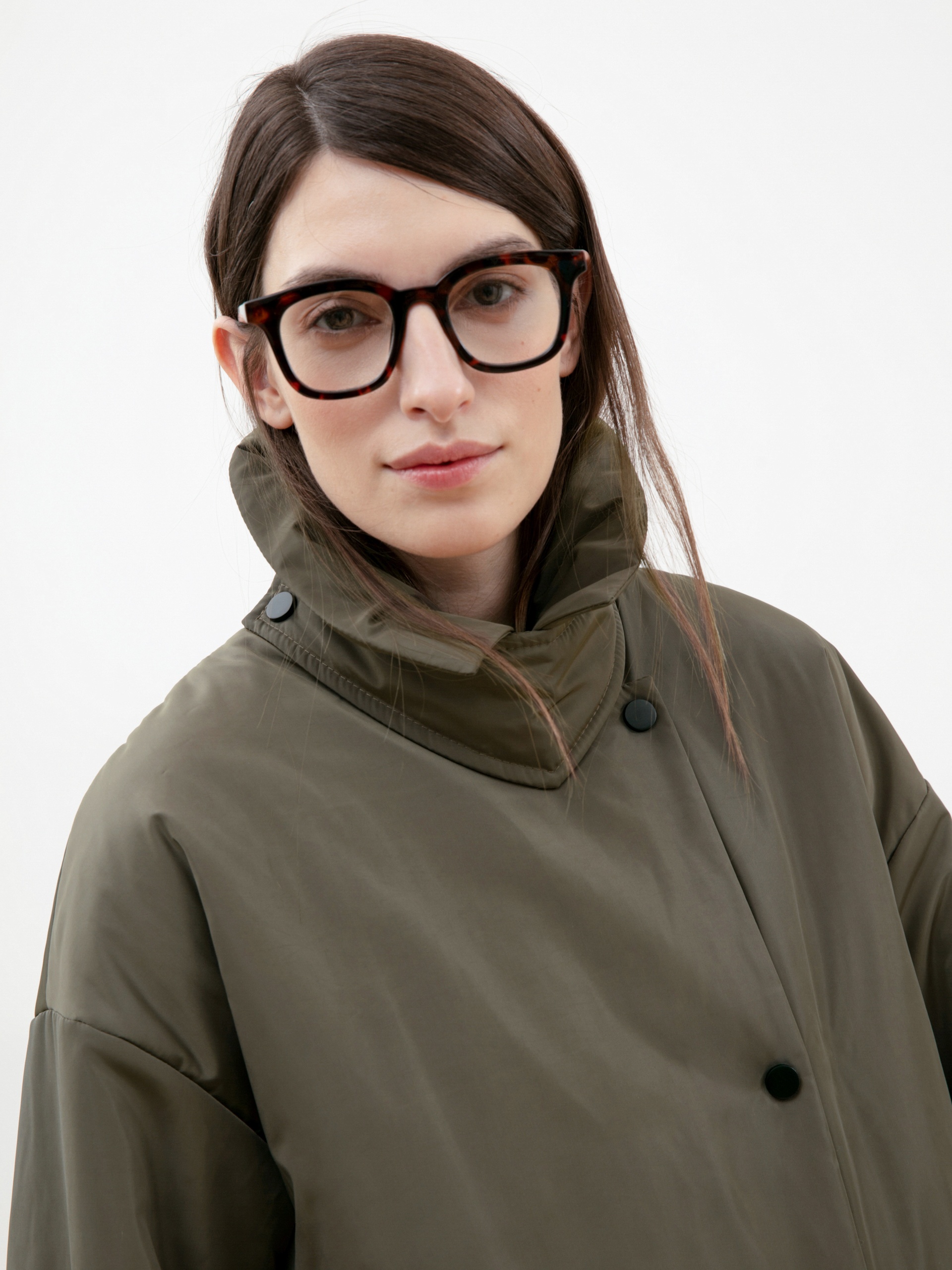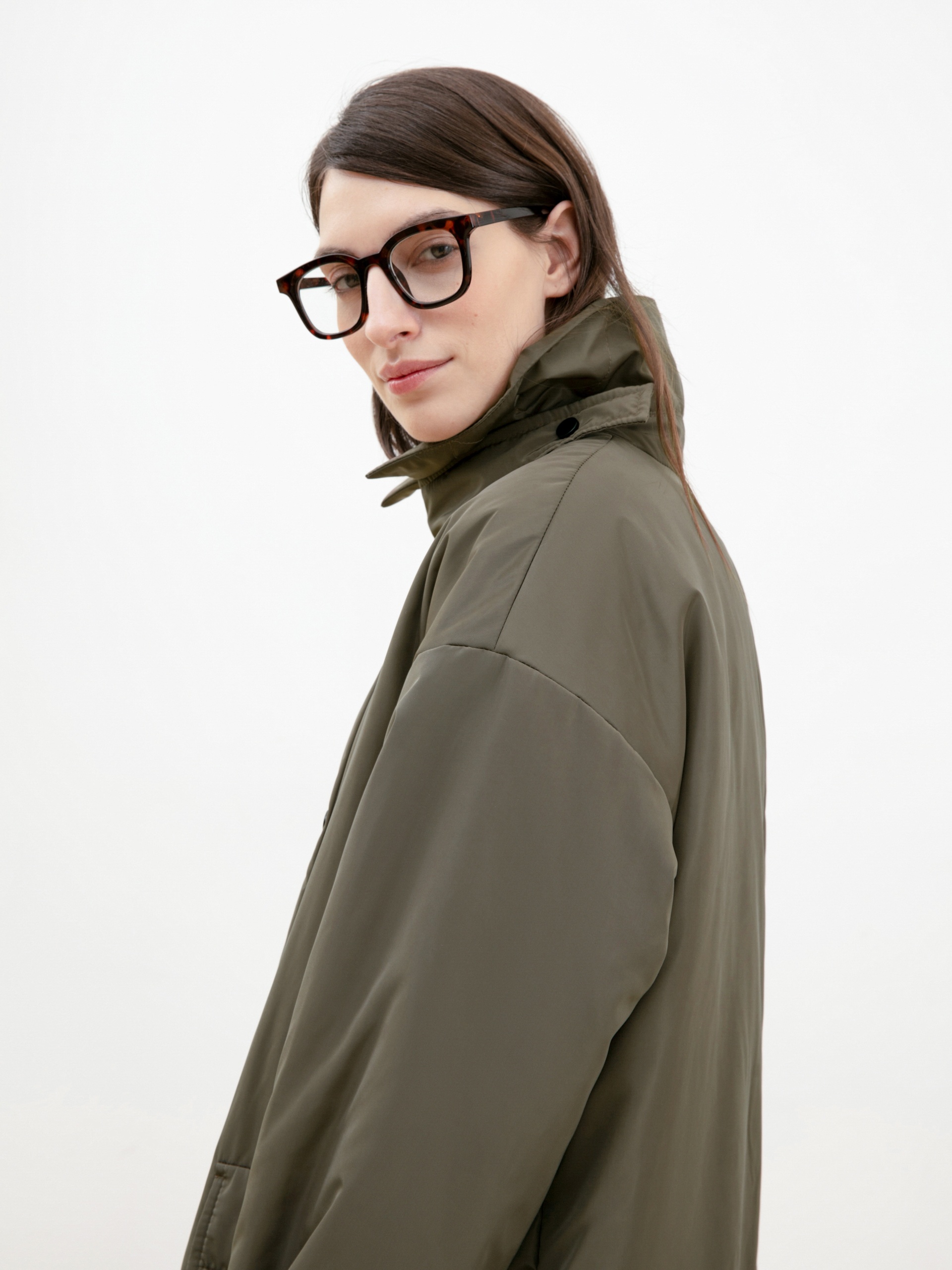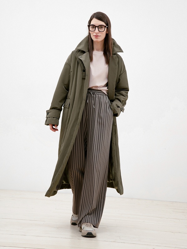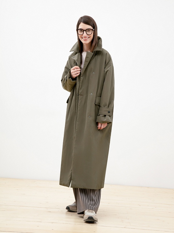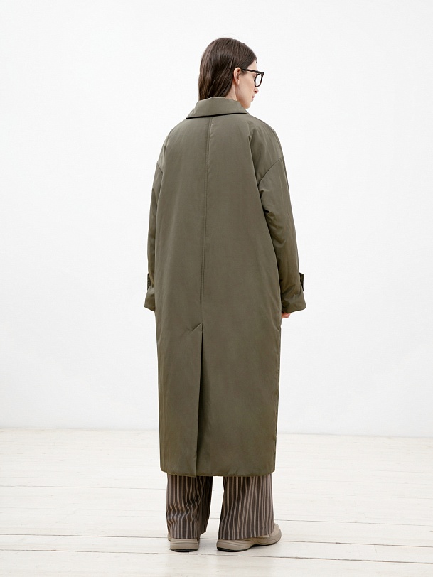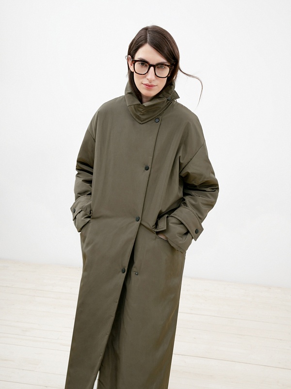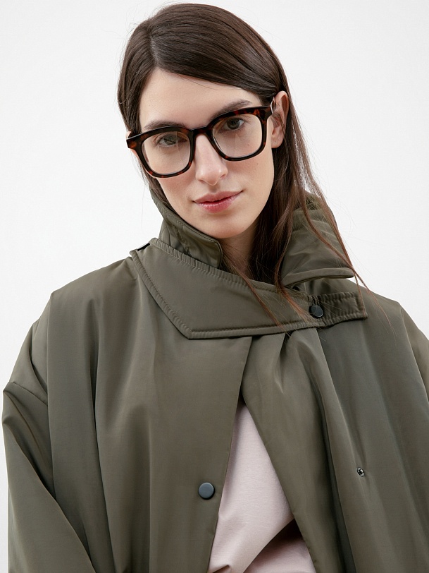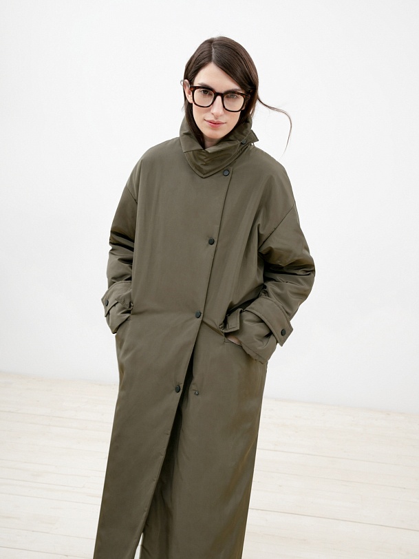 Объемное ультрамодное пальто прямого силуэта из плащевой ткани цвета хаки. Длина изделия ниже колена, что сохранит тепло и сделает ваше нахождение в пальто очень комфортным в любую погоду, а запатентованная технология в виде мембраны Raft-Pro надежнео защитит от ветра и влаги. Отложной воротник с геометричной деталью не только служит декоративным элементом, но и обеспечит фиксацию воротника для наибольшего сохранения тепла. Рукав рубашечный со спущеной линией плеча позволяет надевать под низ как жакеты, так и объемные вязаные вещи, не затрудняя при этом движение. Функциональные карманы с декоративными клапанами очень вместительные и при этом очень гармонично вписываются в стилистику пальто. Выполнено пальто из премиальной плащевой ткани с использованием запатентованных технологий в виде высокотехнологичной мембраны Raft-Pro. Произведдено в Санкт-Петербурге.