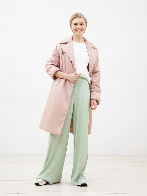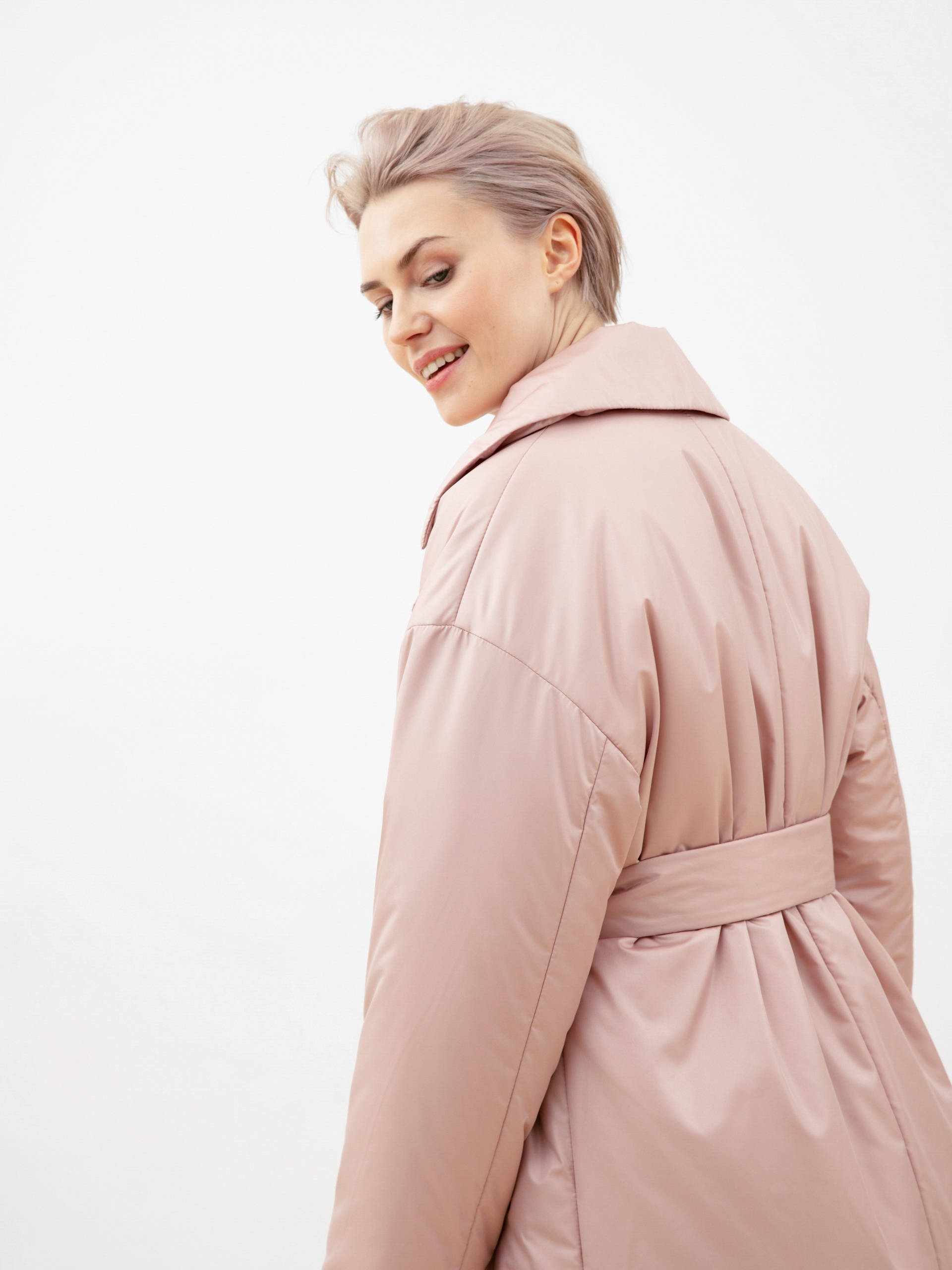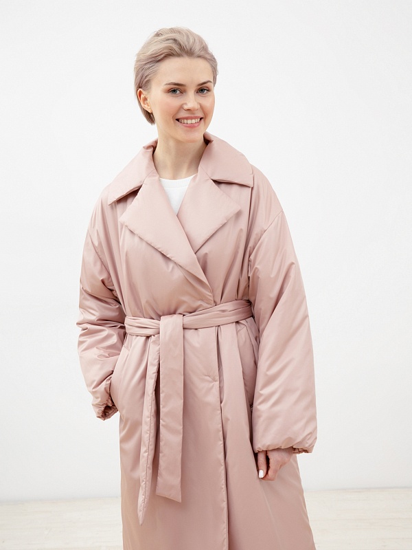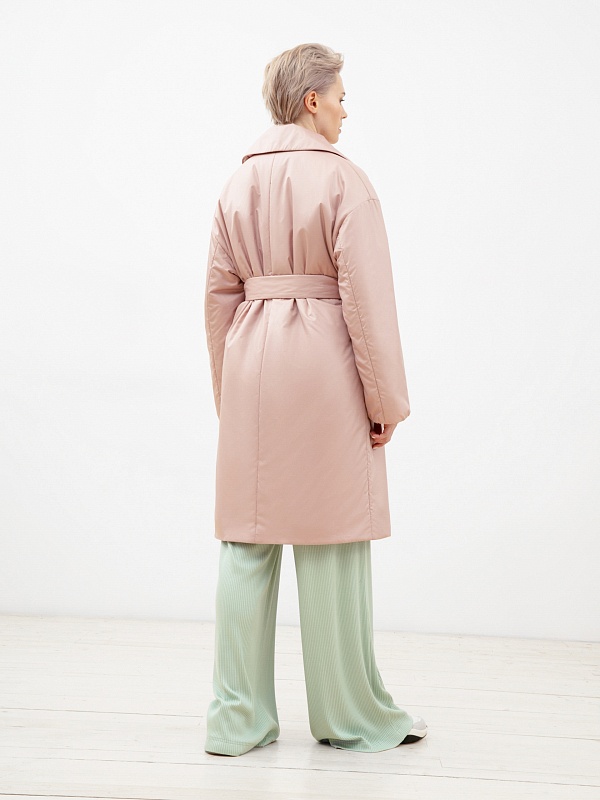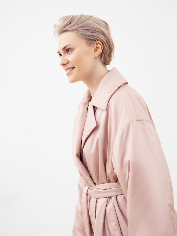 Пальто прямого силуэта из плащевой ткани пудрового цвета. Длина пальто ниже колена, что создает дополнительное тепло, позволяя полностью укутаться в пальто и не думать о погоде. Горловина пальто обрамлена классическим английским воротником. Рубашечный рукав создает дополнительный комфорт во время нахождения в пальто, а пояс из основной ткани подчеркнет талию и сделает силуэт более женственным. Выполнено пальто из премиальной плащевой ткани с использованием запатентованных технологий в виде высокотехнологичной мембраны Raft-Pro, которая создает дополнительную надежную защиту от дождя и ветра в любую непогоду. Произведено в Санкт-Петербурге.
