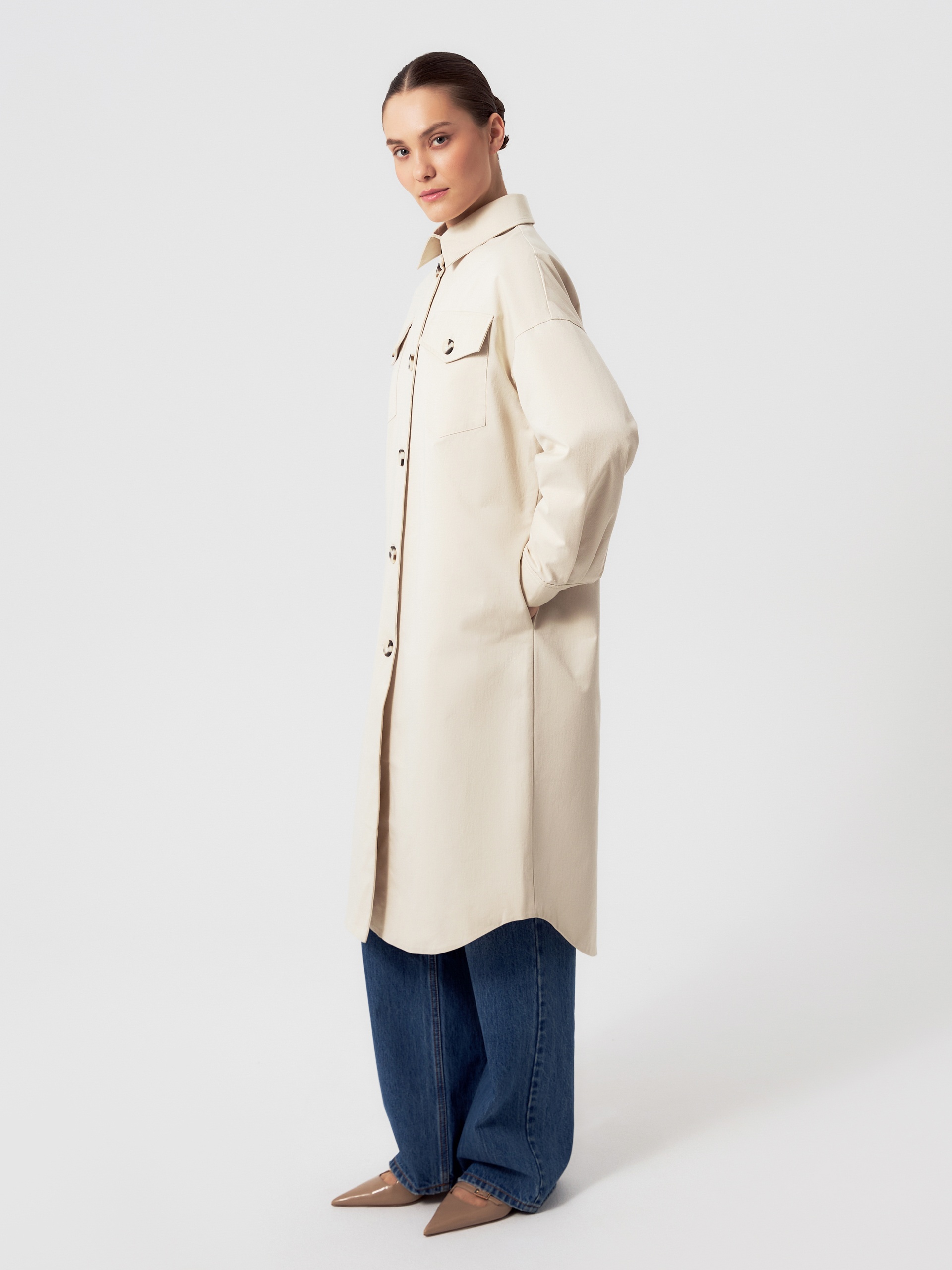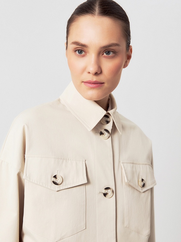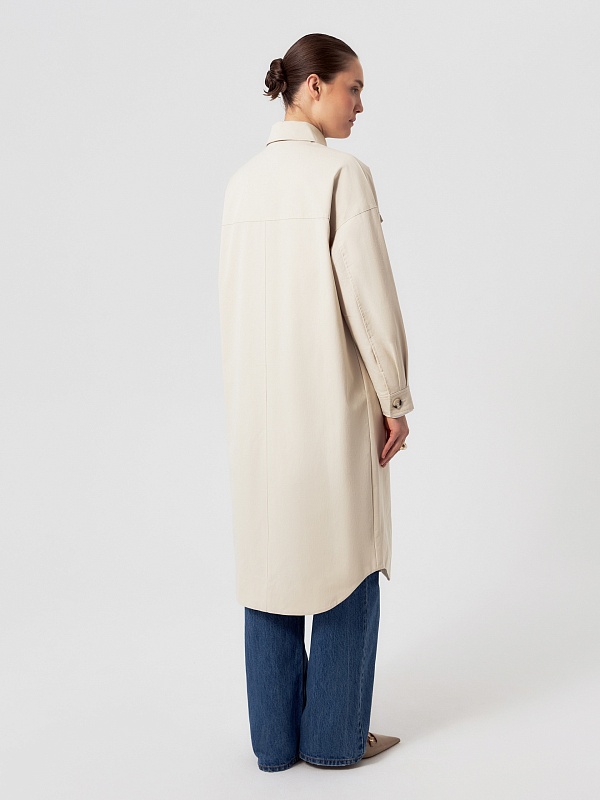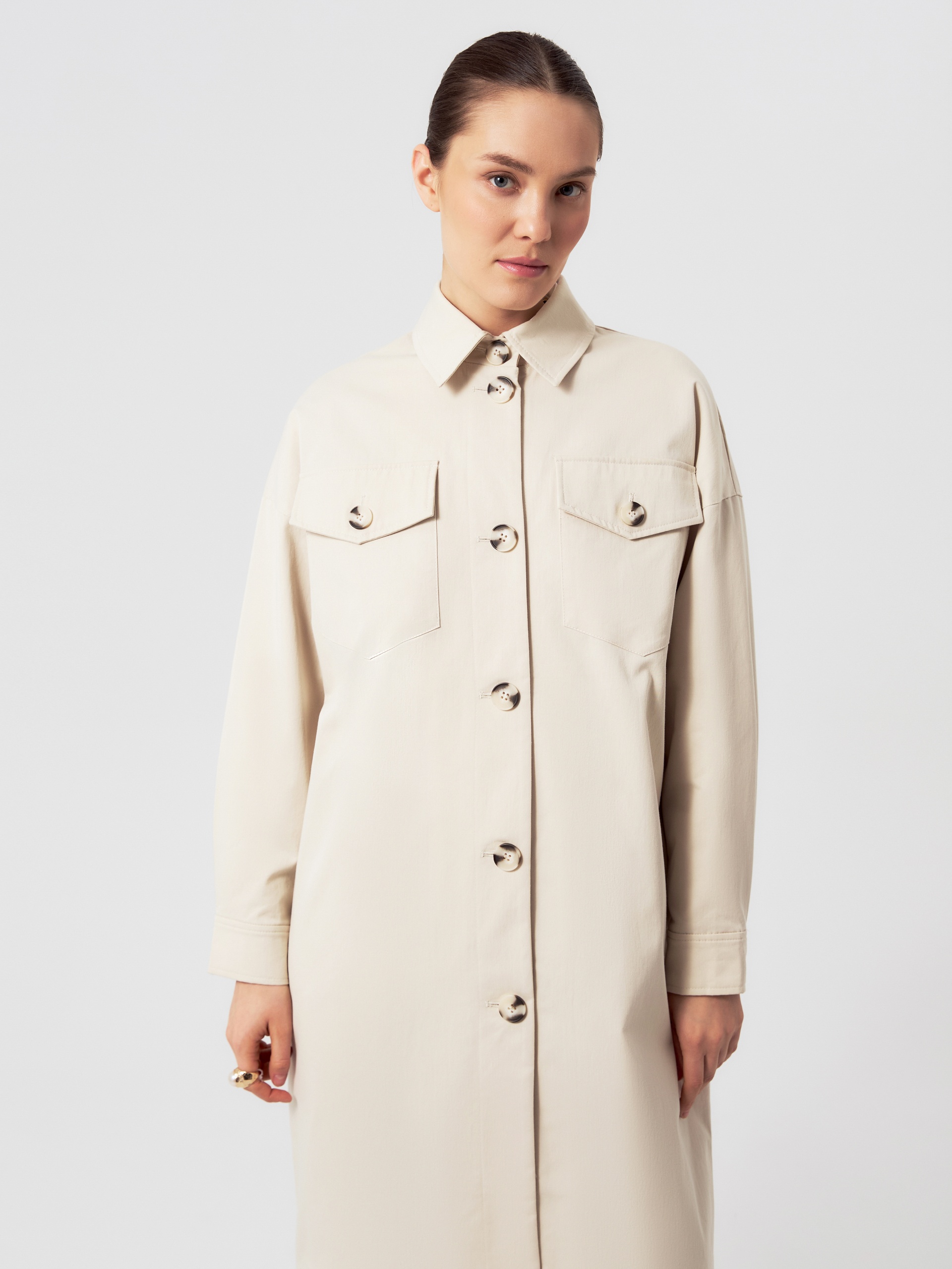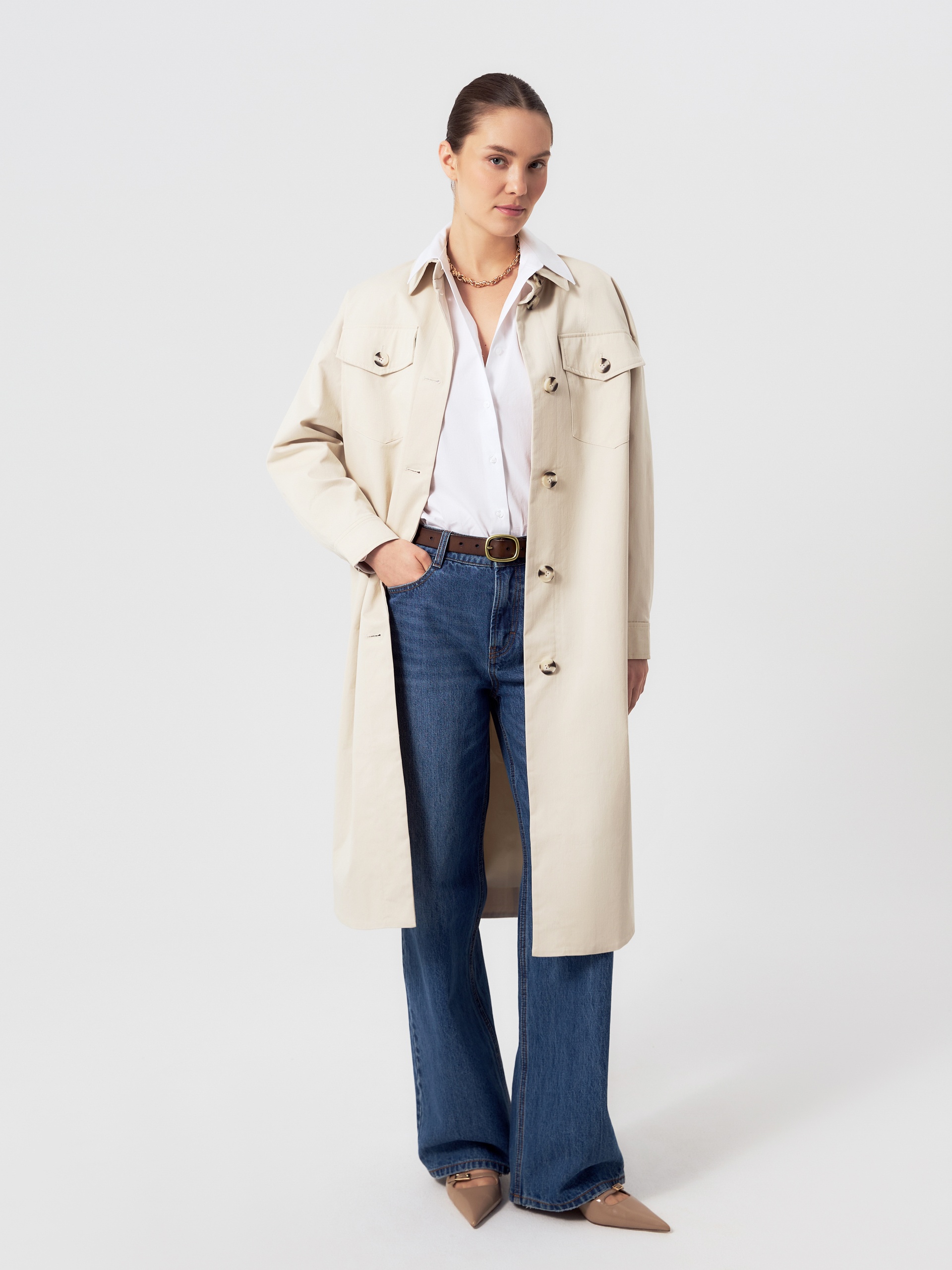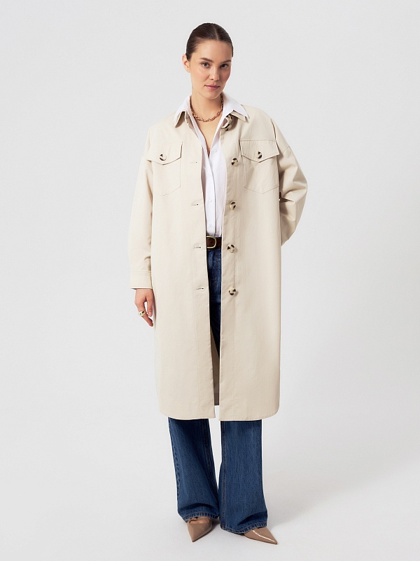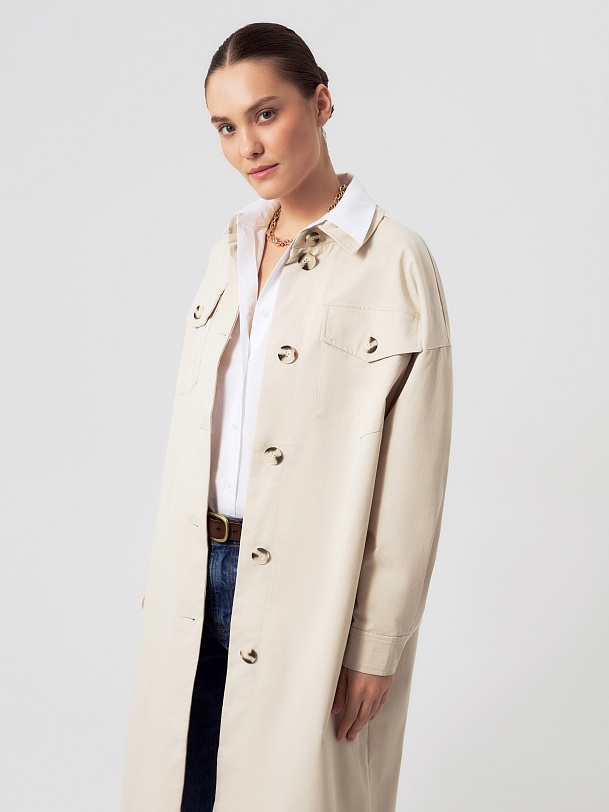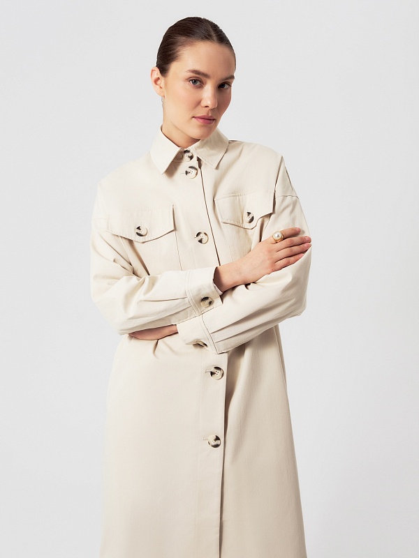 Тренч-рубашка прямого силуэта из плащевой ткани бежевого цвета. Воротник отложной, рукав рубашечный со спущеной линией плеча, низ рукава обработан манжетой с застежкой на стильную пуговицу. Тренч имеет два крупных функциональных накладных кармана. Застегивается на ряд современных пуговиц под натуральный рог. Длина тренча ниже колена. Тренч обработан легкой водоотталкивающей пропиткой, которая не утяжеляет ткань, при этом защищает от дождя. Выполнено из премиальной плащевой ткани с 60% содержания хлопка. Произведено в Санкт-Петербурге.