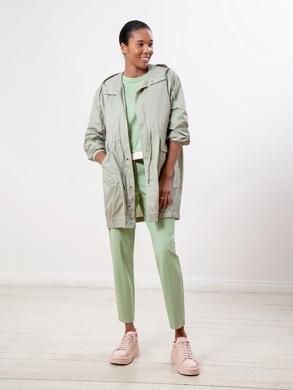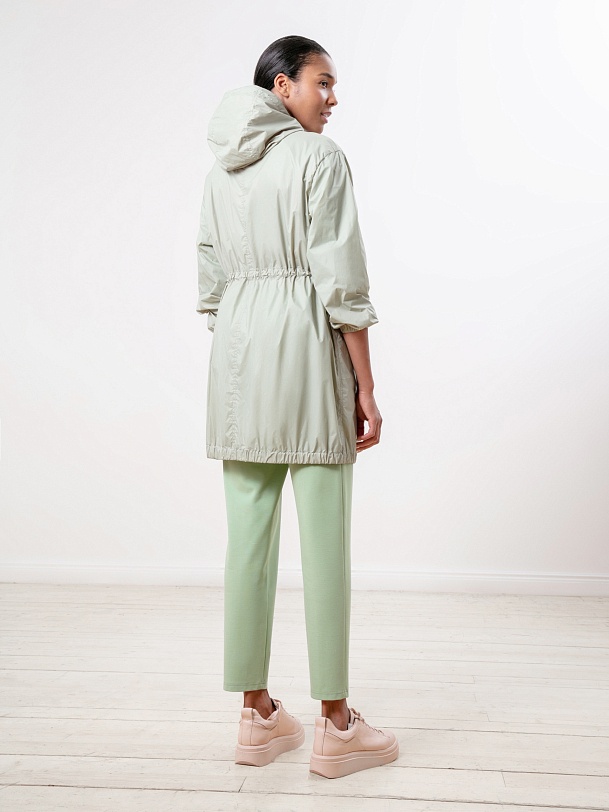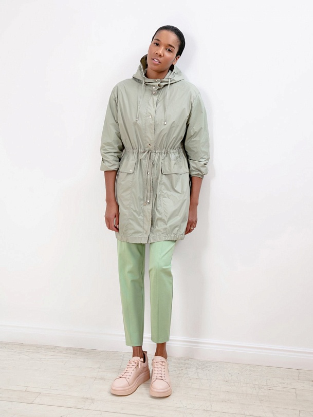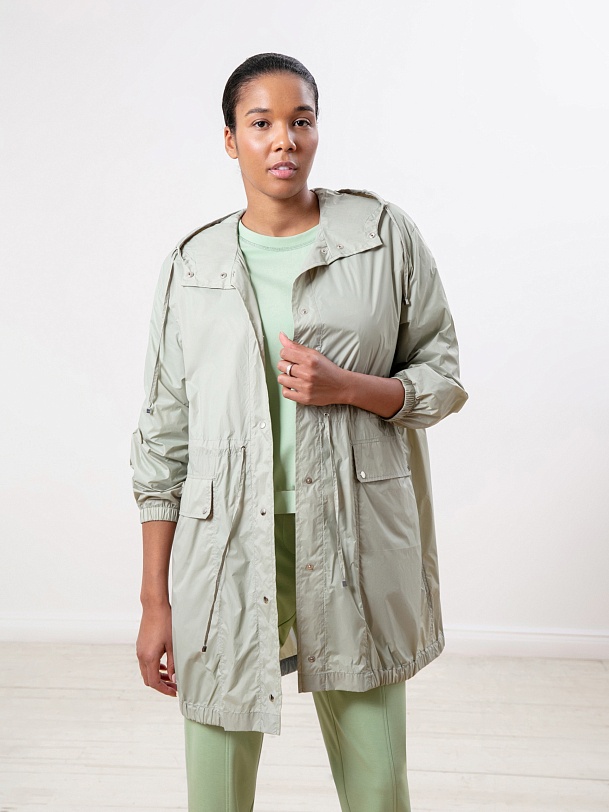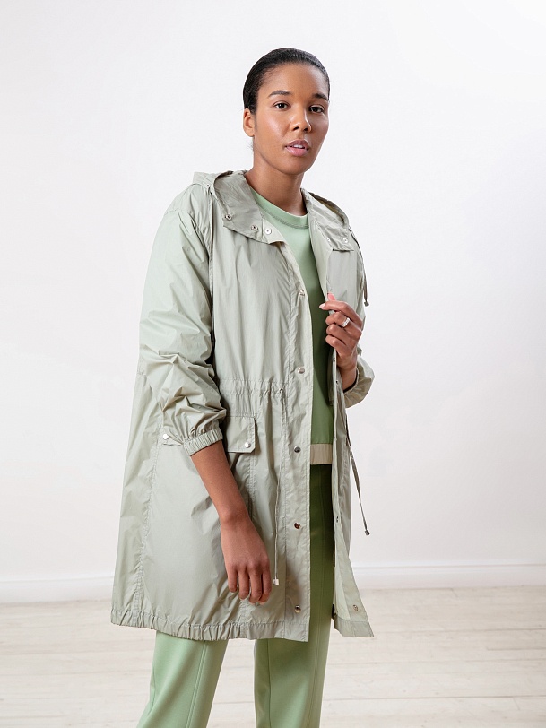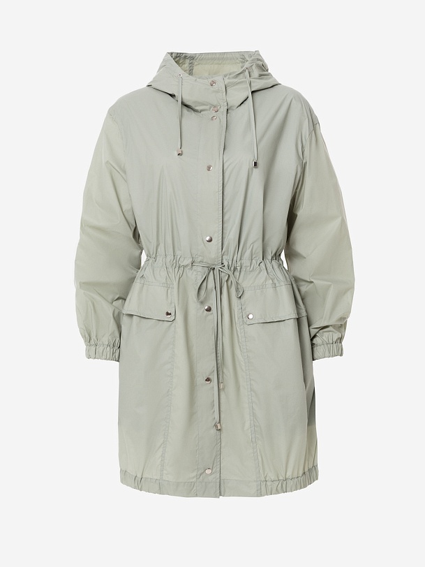 Облегченная ветровка-плащ А-силуэта с накладными карманами. Изготовлена из плащевой ткани, которая защищает от ветра и легкого дождя. Куртка застегивается на кнопки, имеет глубокий капюшон, два кармана на листочках-клапанах. На талии застежка-кулиска, позволяющая регулировать объем.