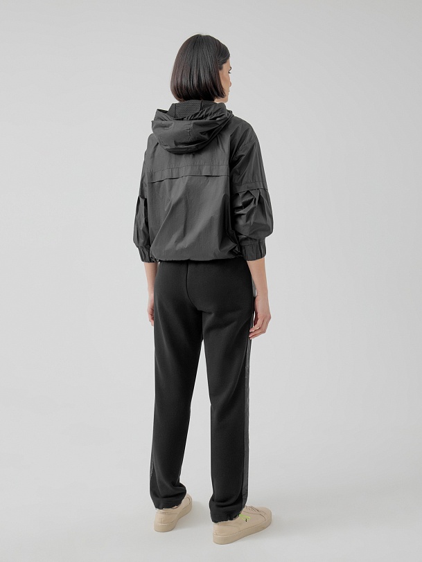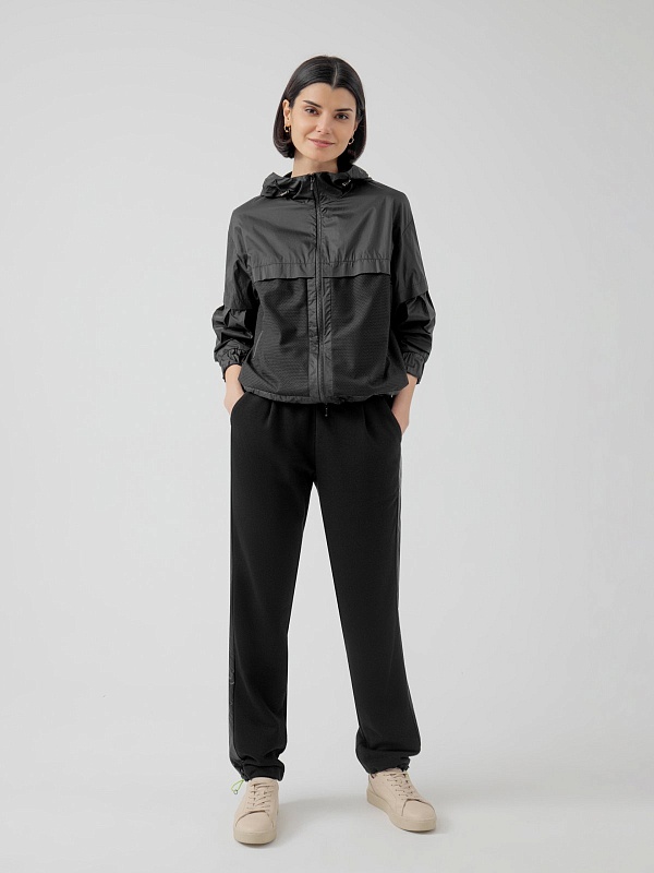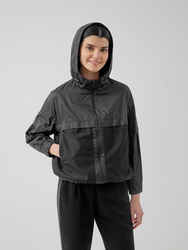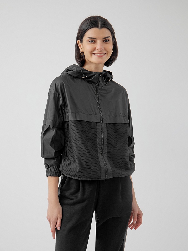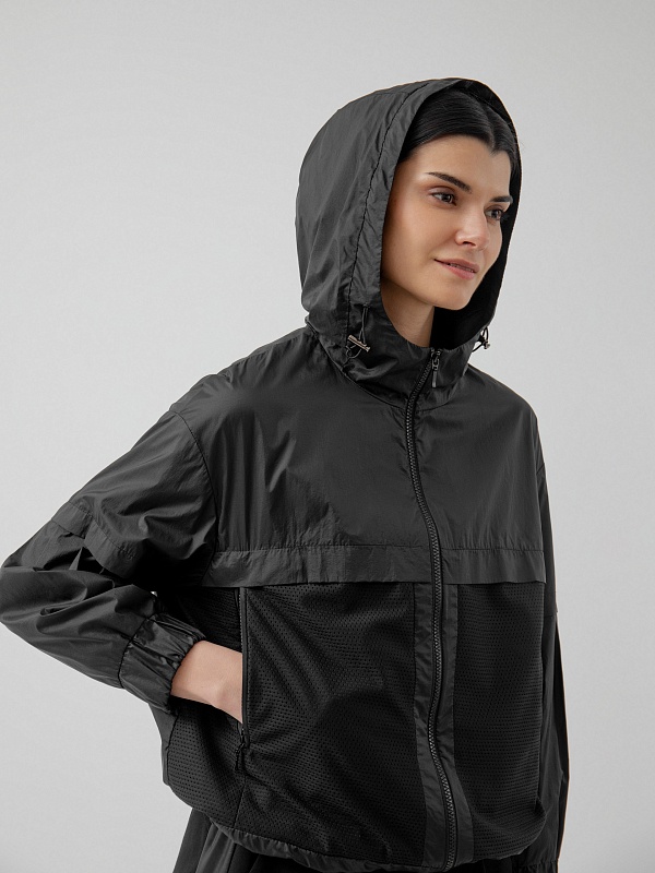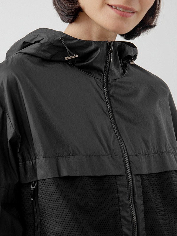 Куртка-ветровка черного цвета полуприлегающего спортивного фасона из комбинации плащевой ткани и перфорированной. Воротник-стойка, переходящий в капюшон, который при желании легко утягивается и защищает голову от ветра. Манжеты на удобной регулируемой резинке. Куртка имеет боковые и скрытые нагрудные карманы.