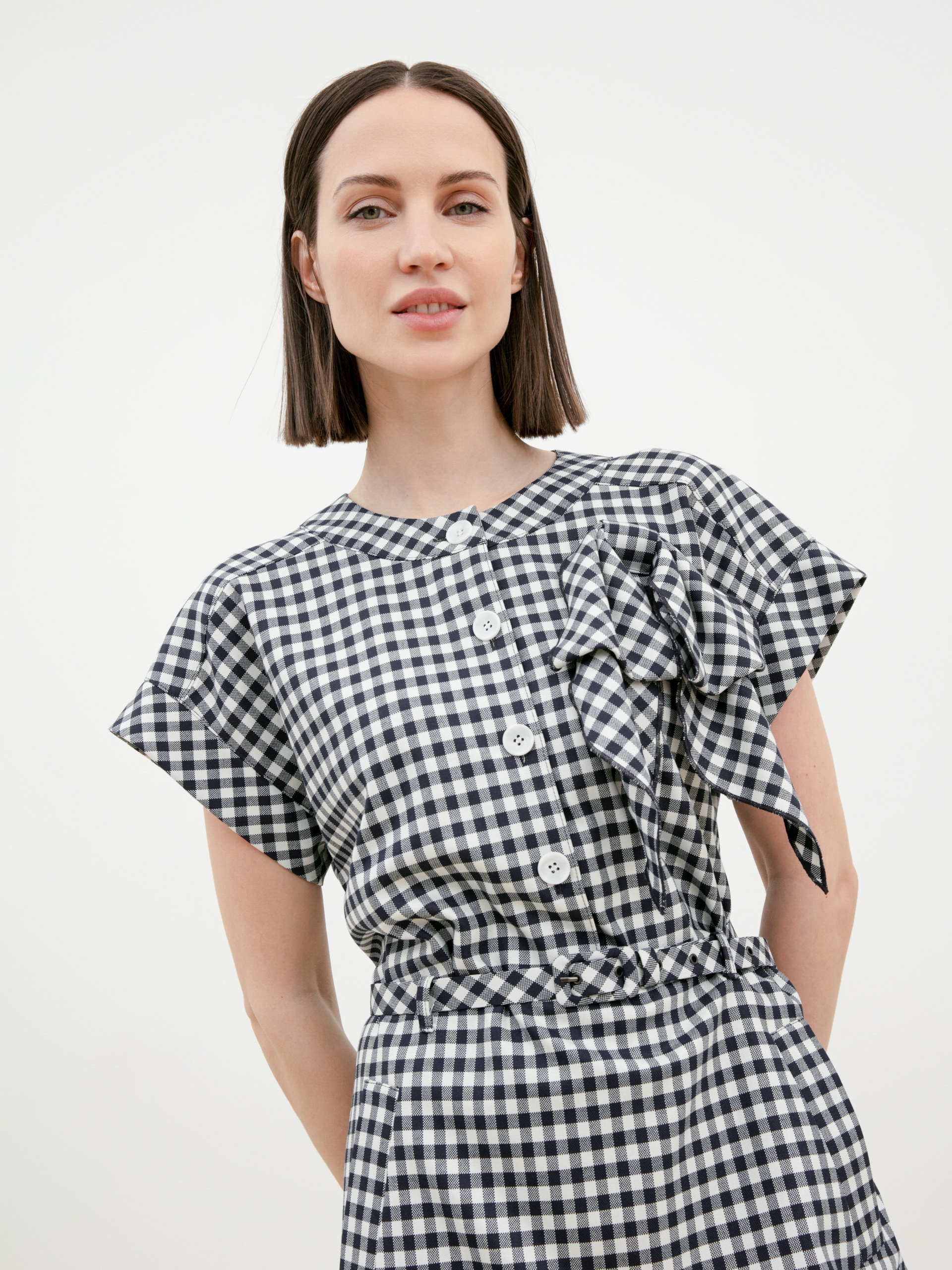 Платье полуприлегающего силуэта в стиле smart casual с коротким рукавом кимоно и горловиной лодочка. Спереди потайная застёжка на пуговицы и прорезные карманы. На талии съемный пояс из ткани с пряжкой.