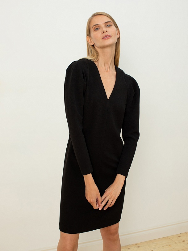 Трендовое платье из костюмной ткани, прямого силуэта без воротника. Рукав со сборкой, зауженный к низу .