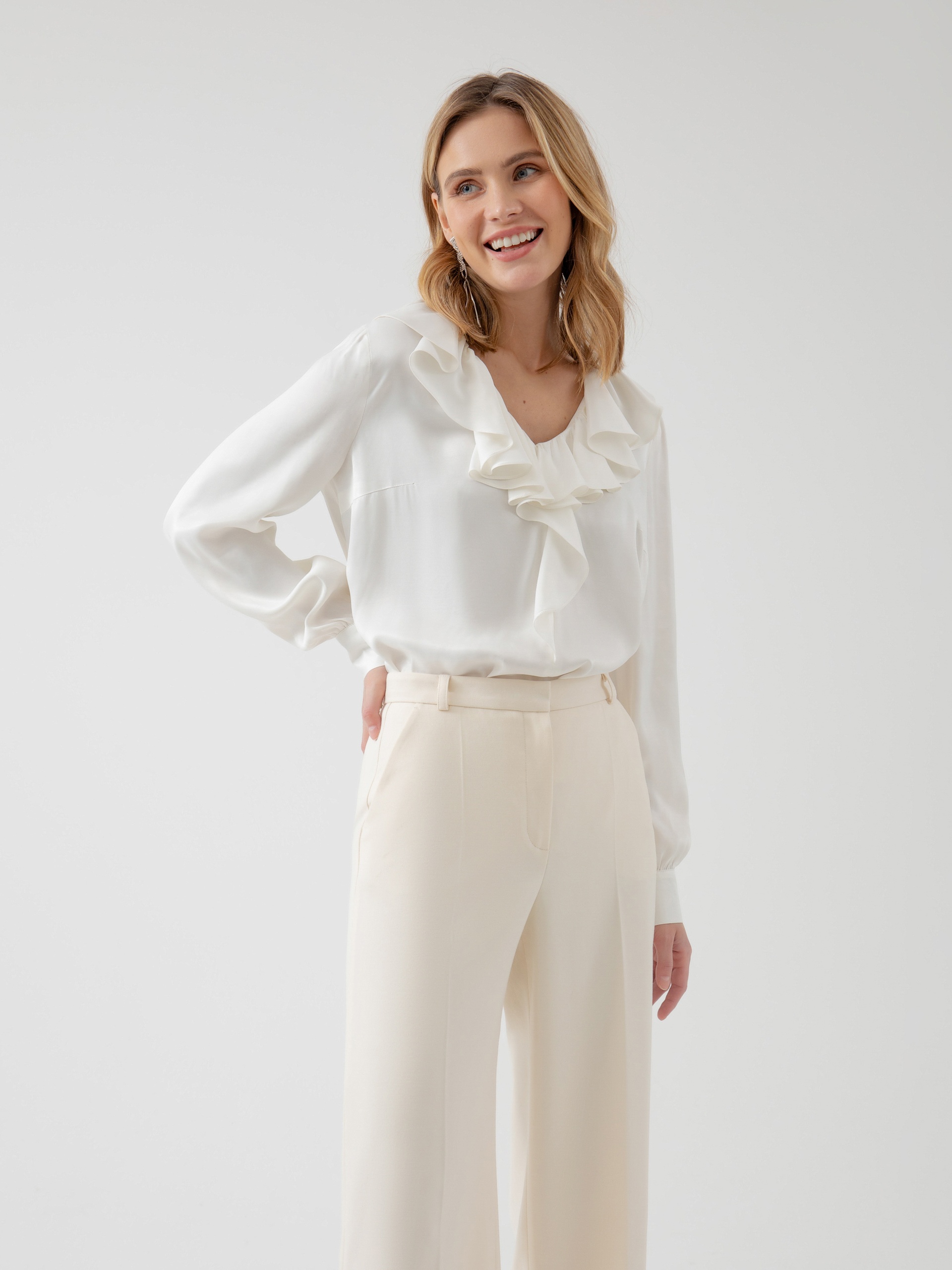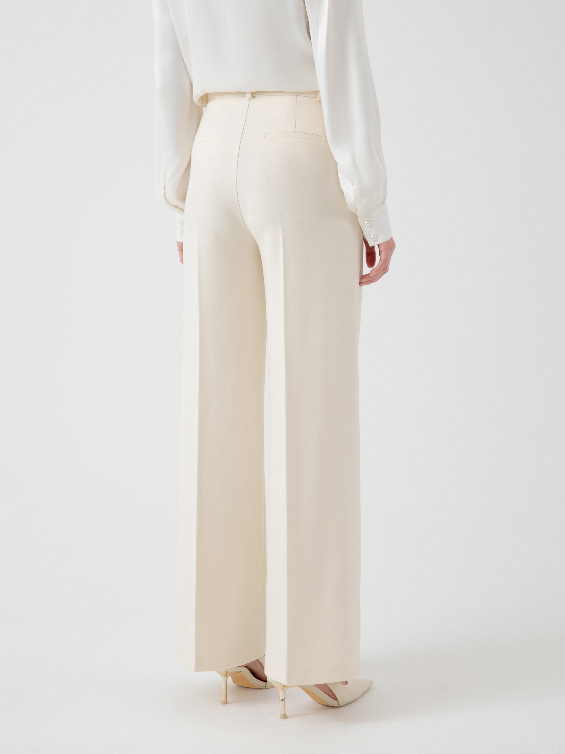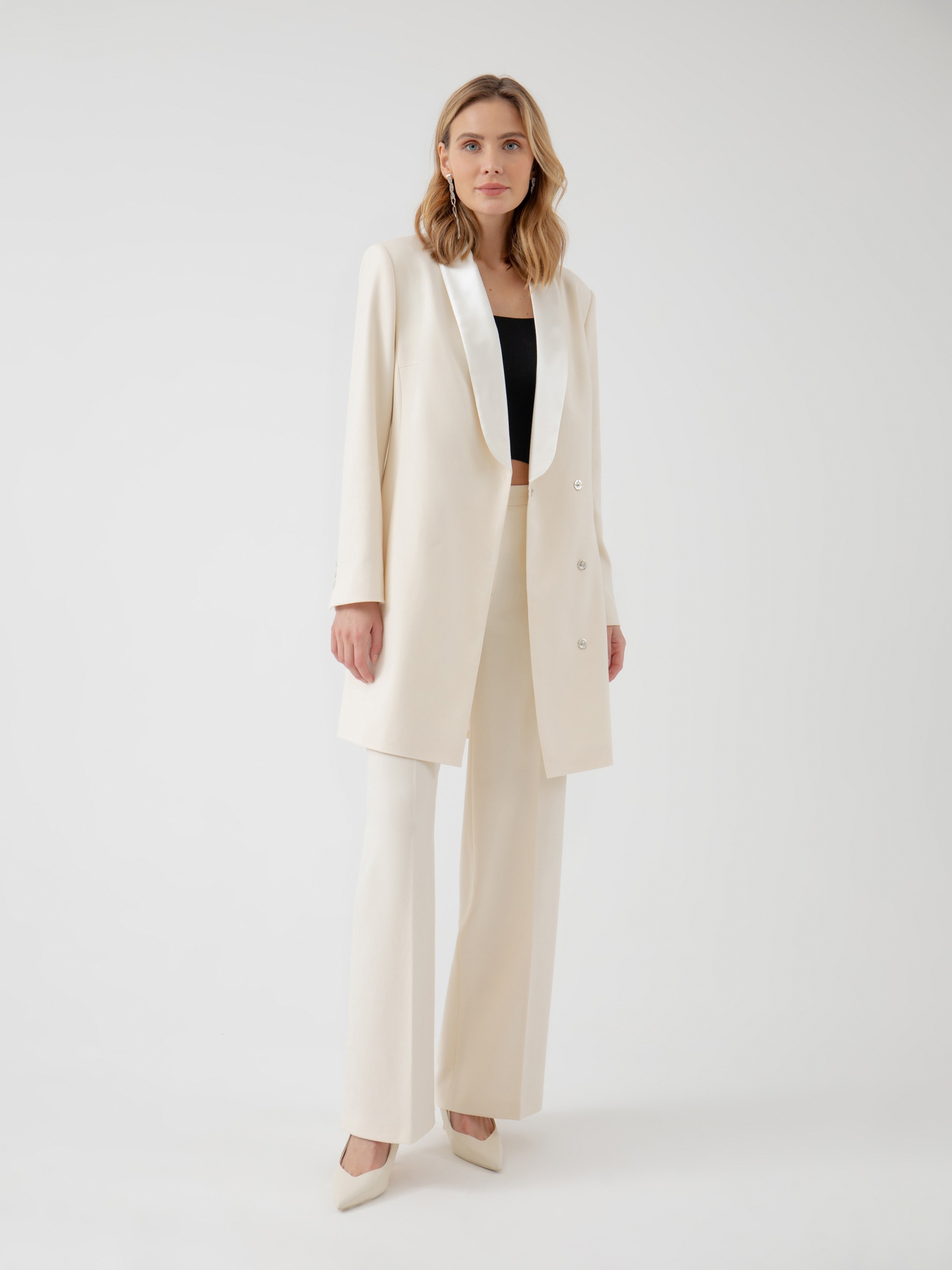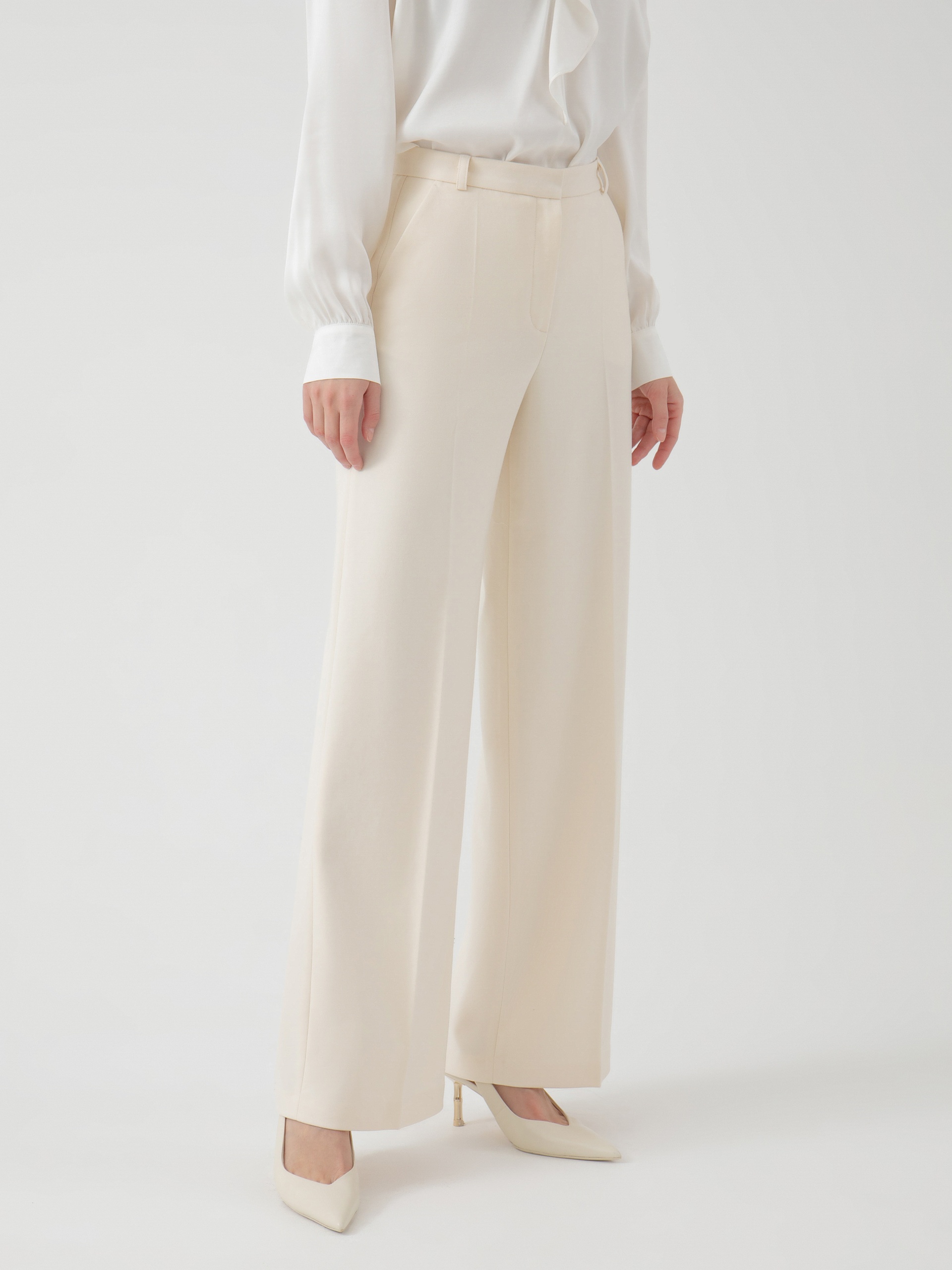 Брюки со стрелками прямого силуэта полной длины из костюмной ткани в кремовом цвете. Имеют два функциональных прорезных кармана по бокам и два прорезных кармана сзади. Брюки можно сочетать с платьем-жакетом из одной ткани.