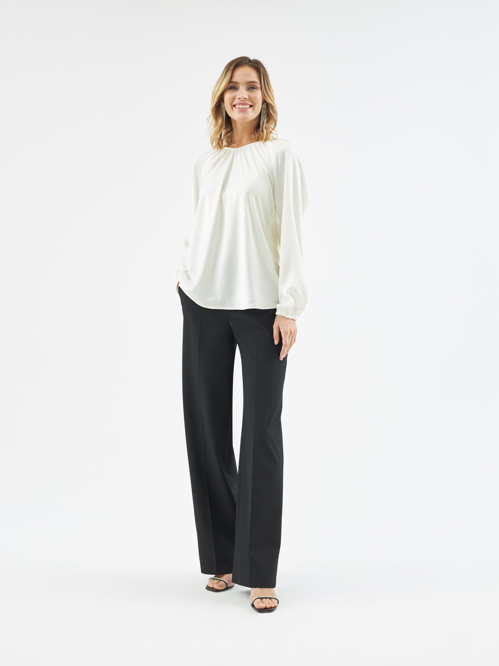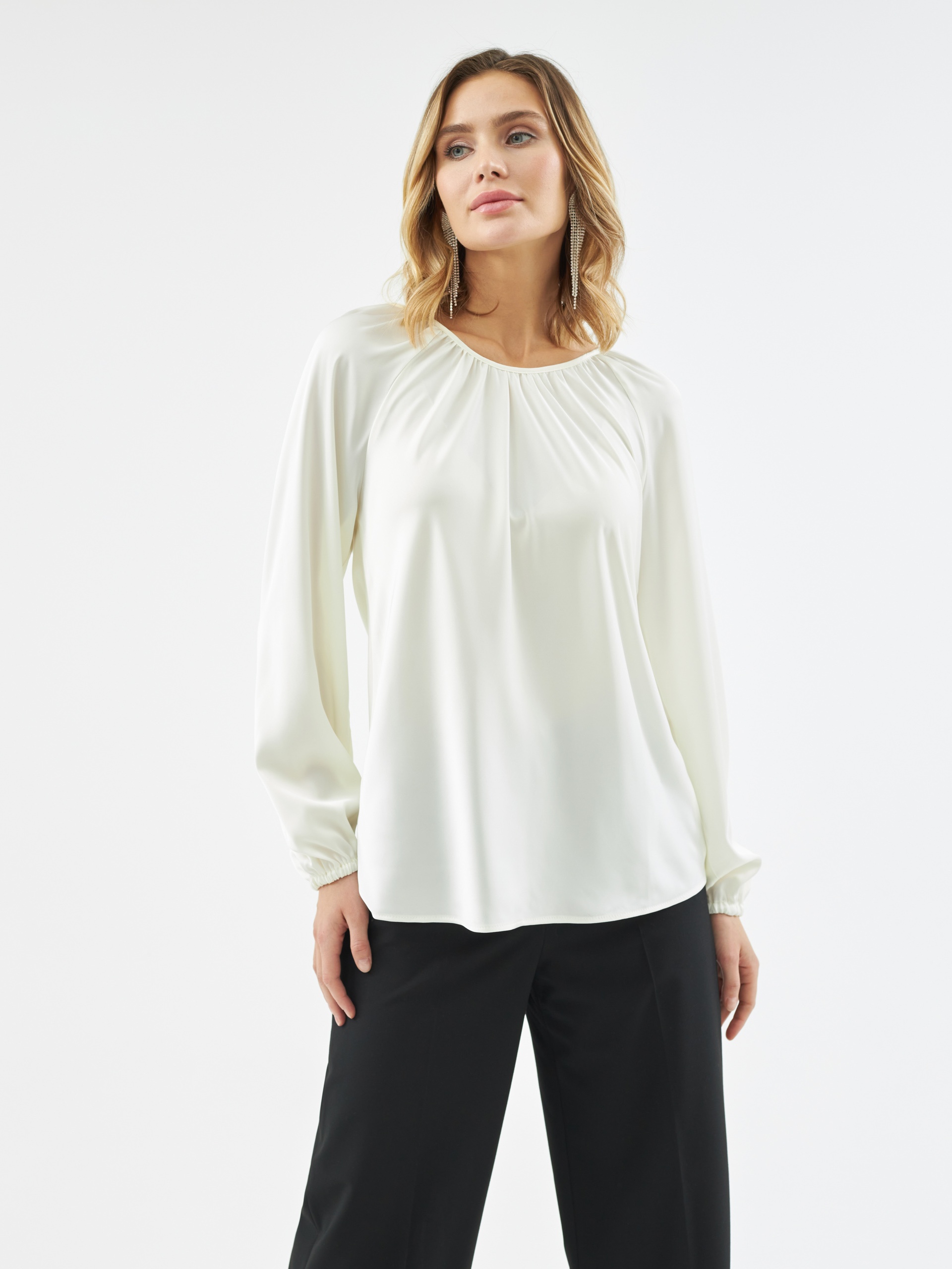 Блуза из атласной ткани кремового цвета прямого силуэта с круглой горловиной на кулиске, фигурная линия низа, втачной рукав со спущенным плечом на манжете с обтяжной пуговицей. Спинка блузы с глубоким вырезом. Атласная блуза в комплекте с широкими брюками станет эффектной заменой платью.
