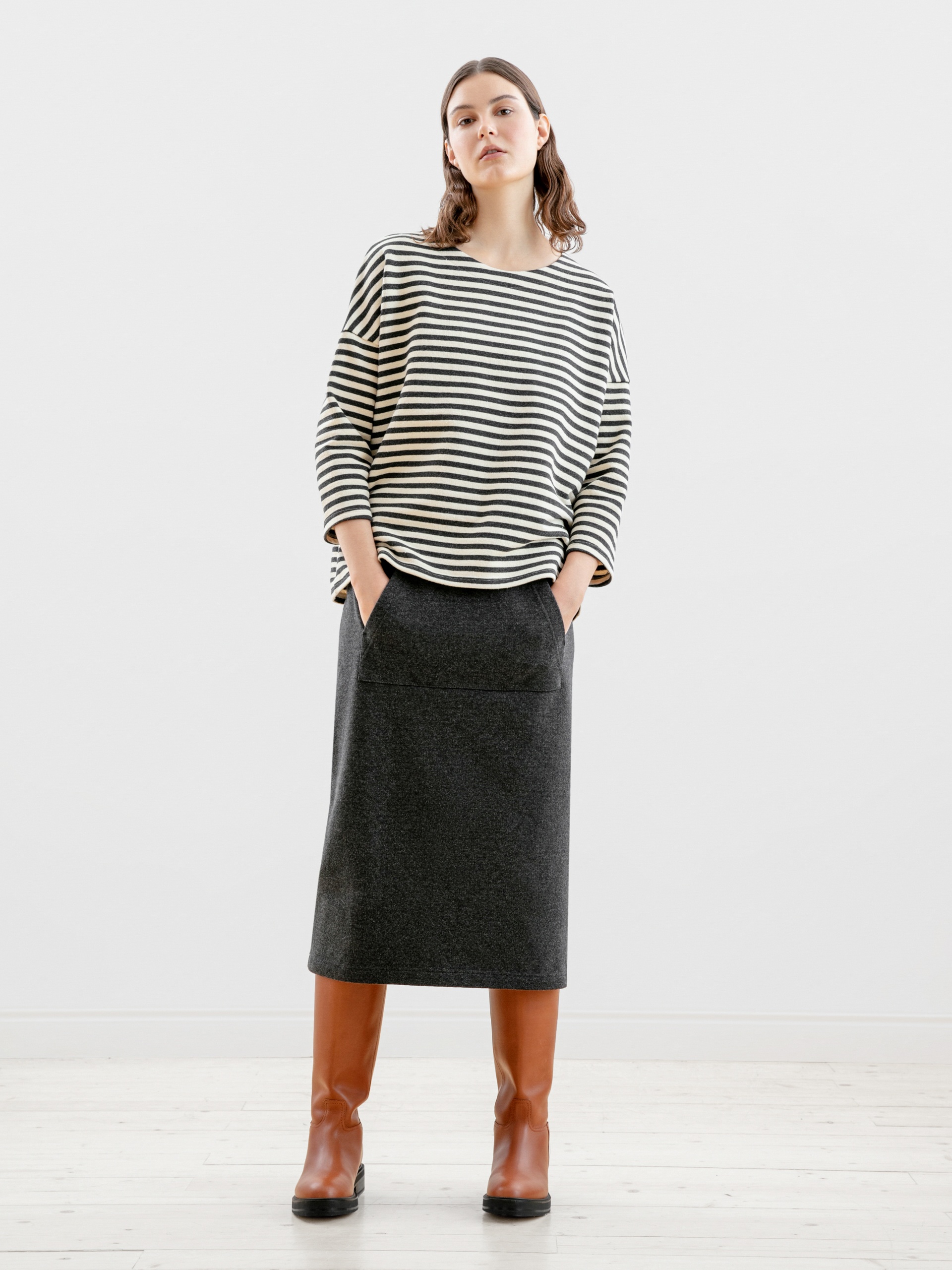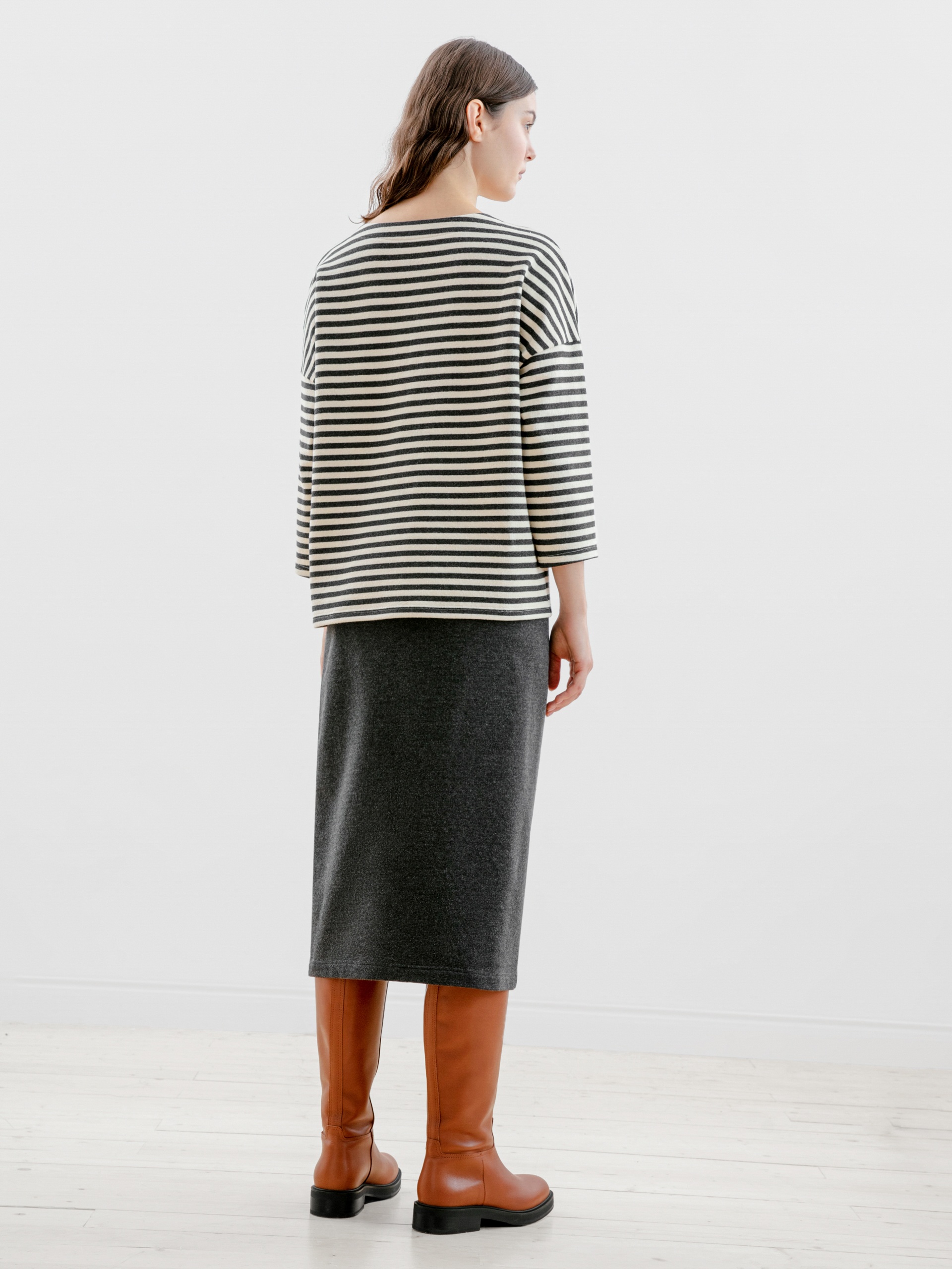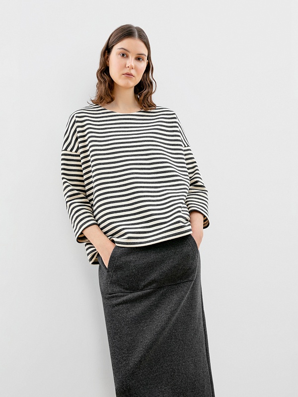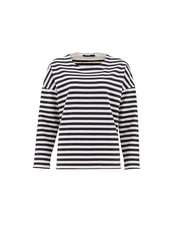 Толстовка прямого силуэта из трикотажного полотна в бежево-синюю полоску. Имеет удобный круглый вырез горловины, спущенную линию плеча и втачной рукав полной длины, что добавляет образу расслабленности. В такой модели не нужно думать о внешнем виде, ведь базовая тельняшка всегда смотрится актуально и эффектно.