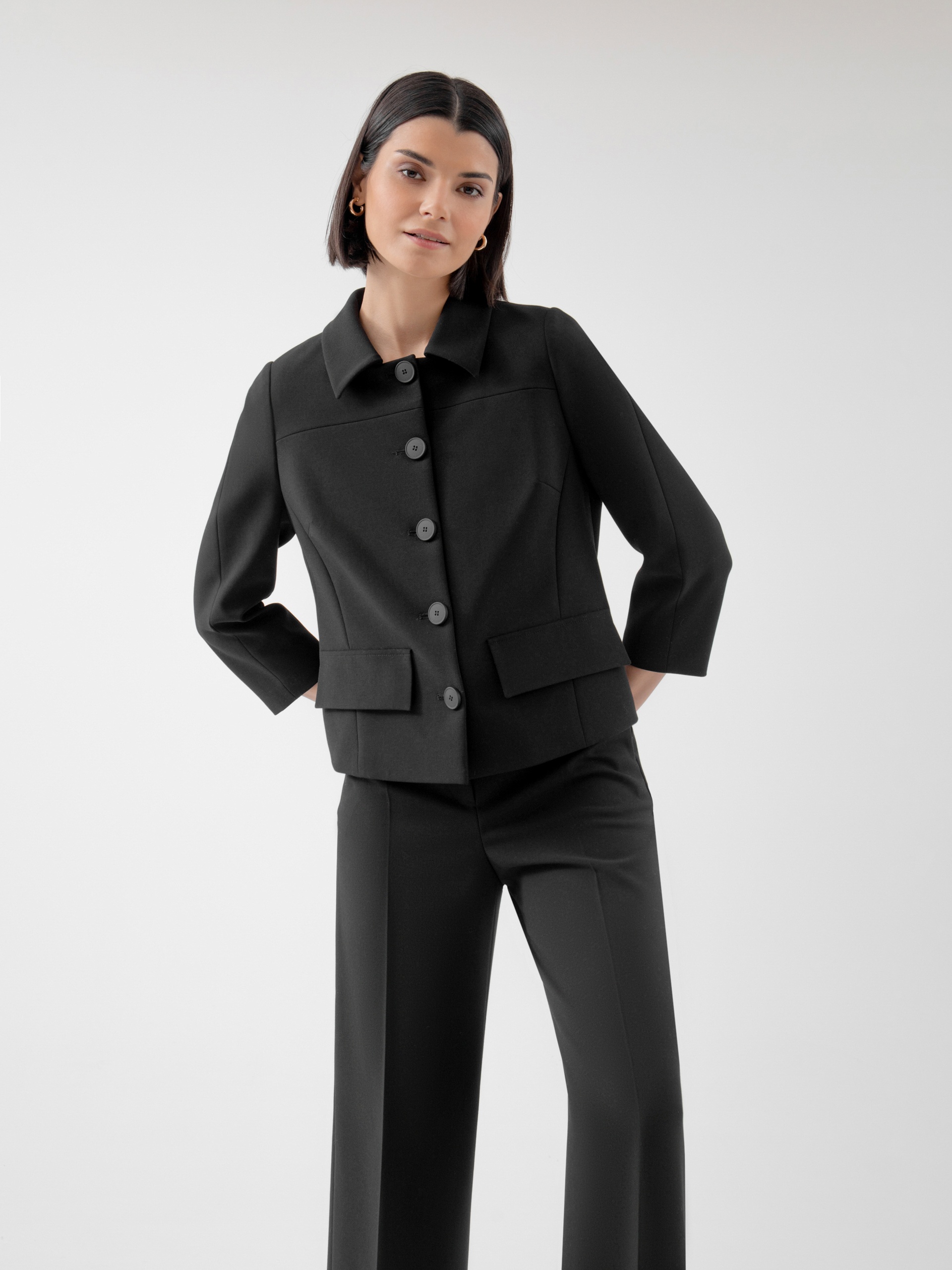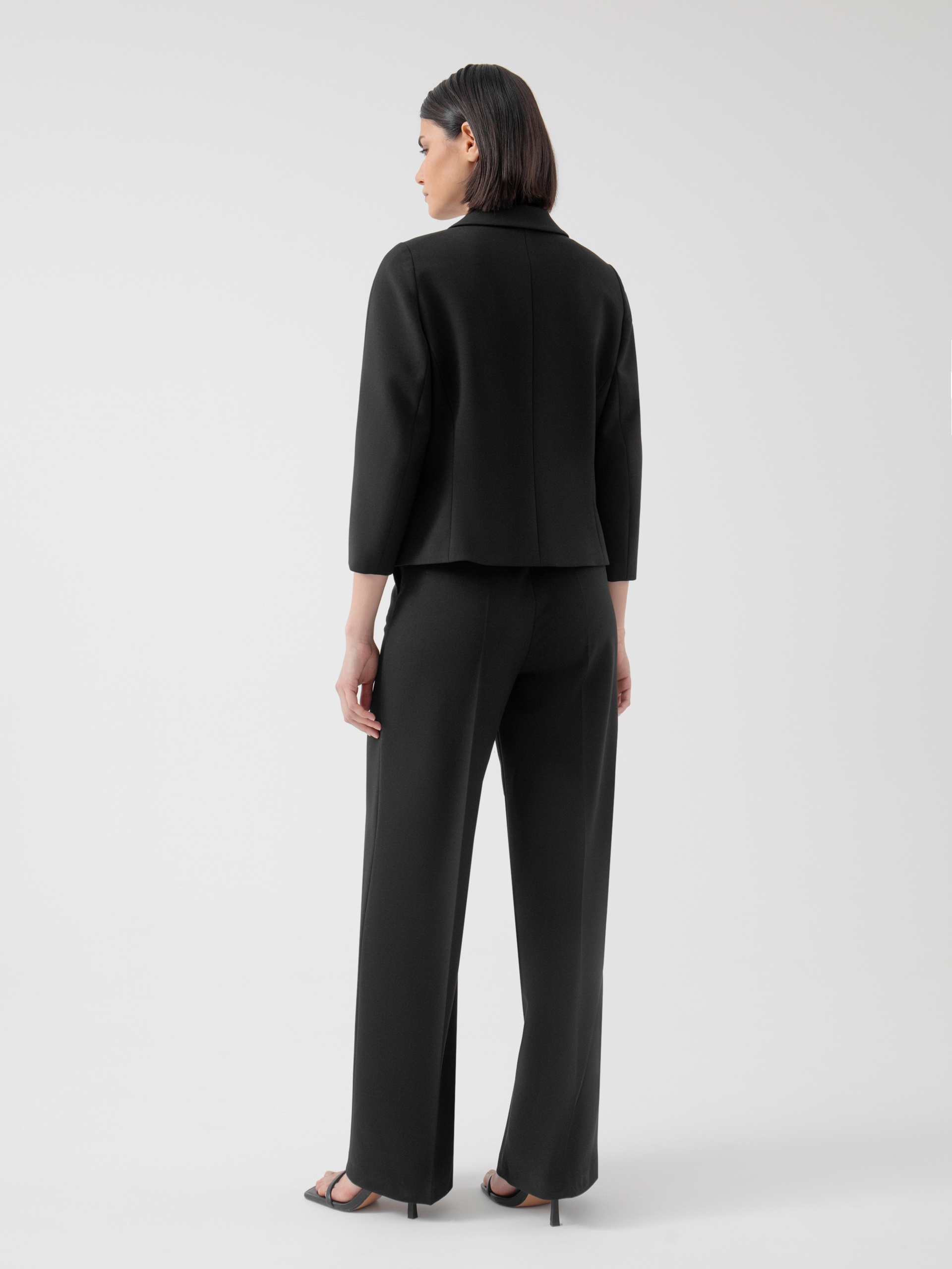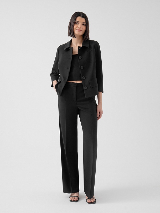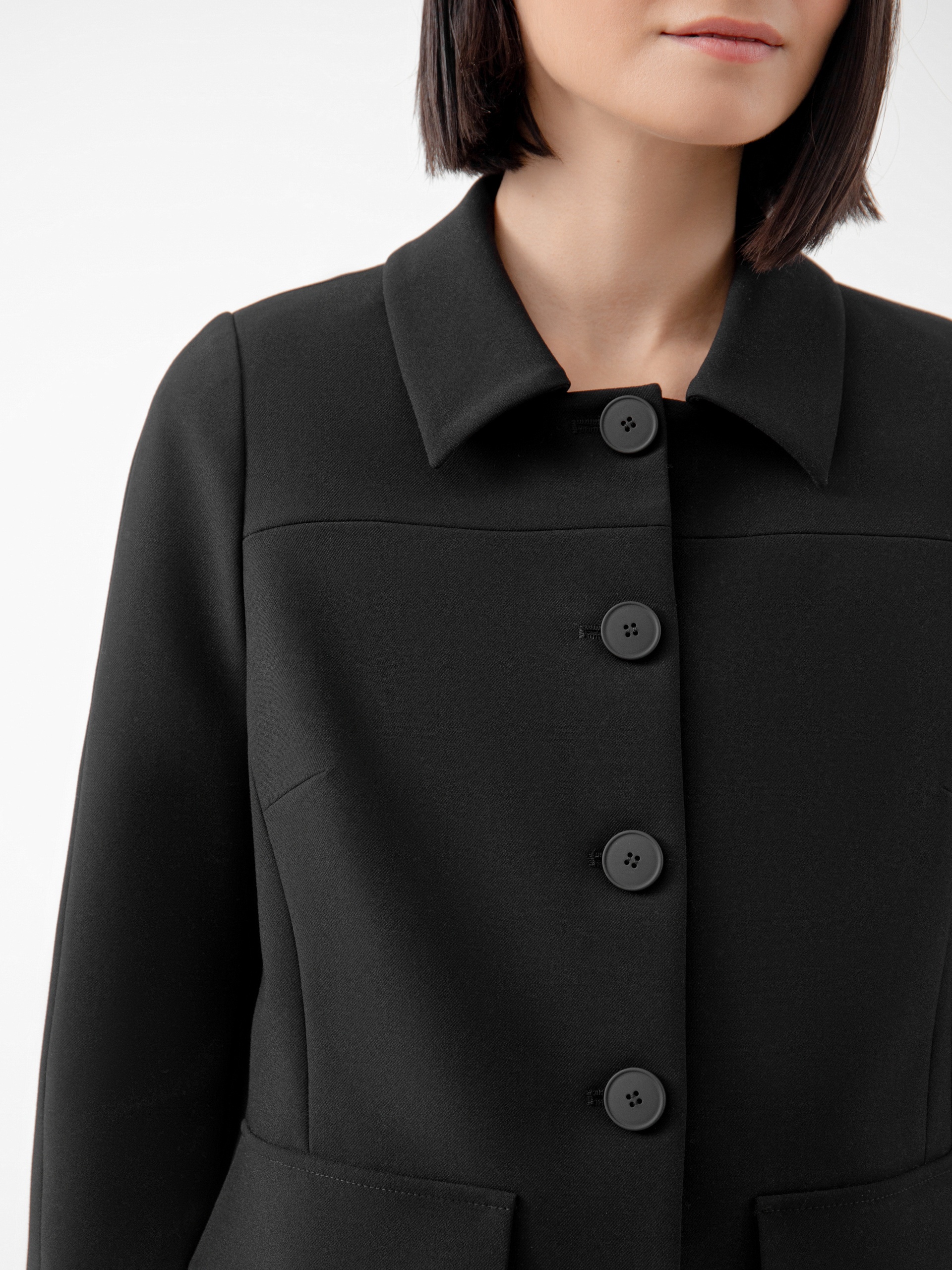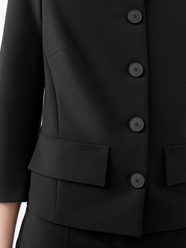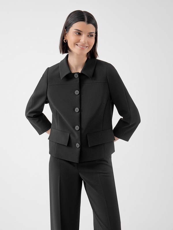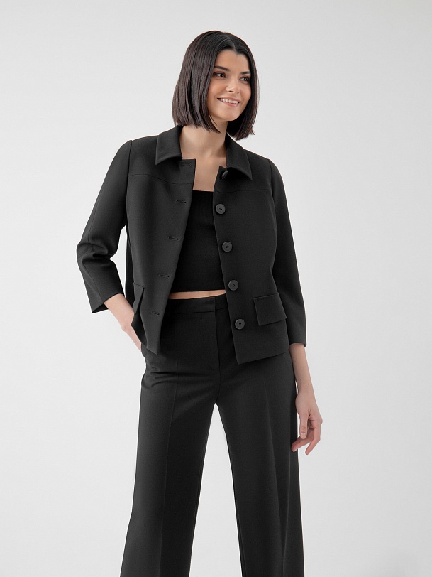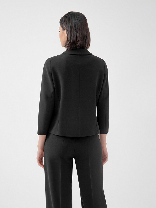 Укороченный жакет в стиле 60-х приталенного силуэта из костюмной ткани. Жакет выполнен из костюмной ткани с добавлением вискозы в чёрном цвете, отличается укороченным силуэтом с однобортной застежкой, рукавом 7/8 и клапанами на талии. Изделие можно носить с мини-юбкой для создания завершенного образа в современном изысканном стиле.