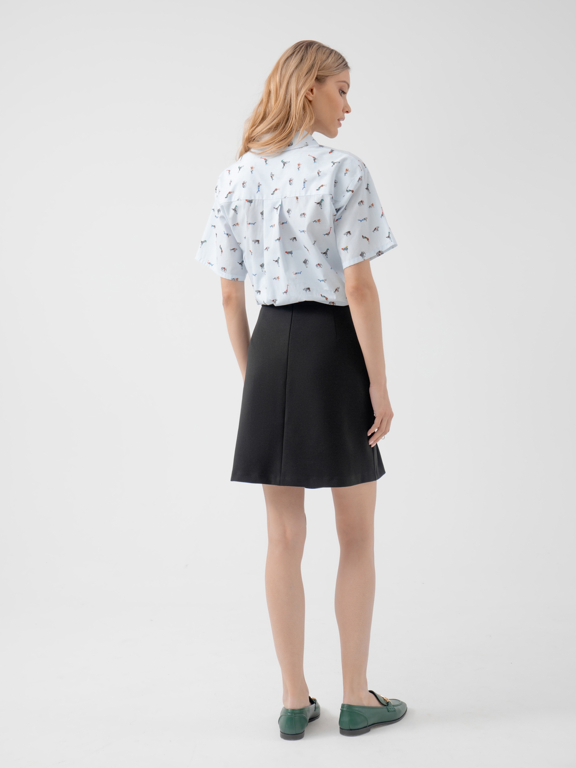 Мини-юбка из костюмной ткани с добавлением вискозы в черном цвете отличается элегантным, слегка расклешенным силуэтом. Мини-юбку можно носить с жакетом в тон для создания яркого завершенного образа в стиле 60-х.