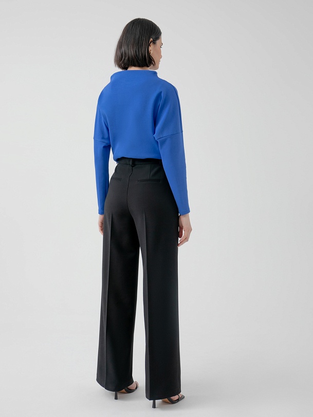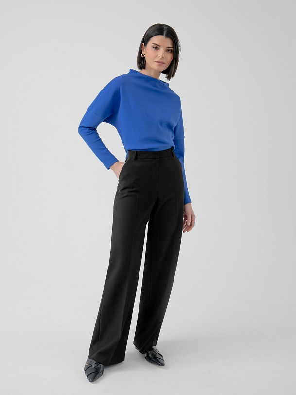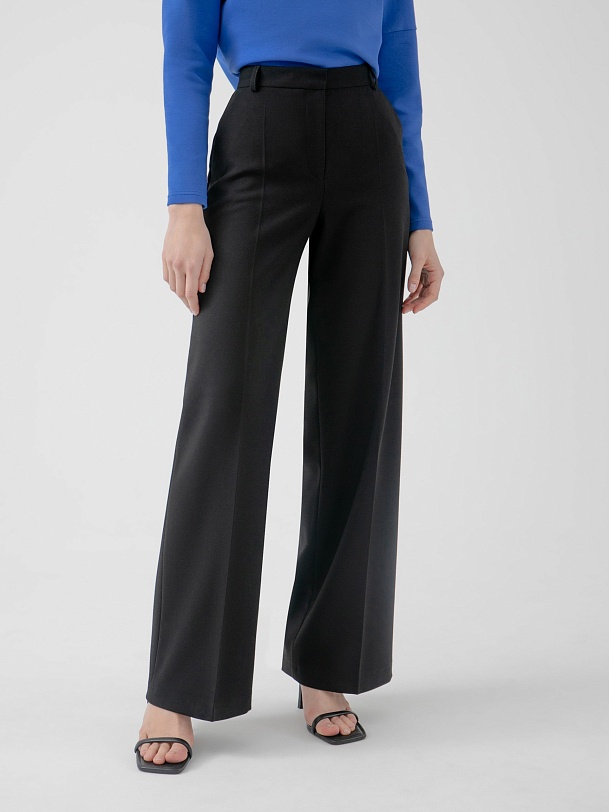 Прямые брюки свободного силуэта из костюмной ткани с добавлением вискозы в черном цвете. Имеют два функциональных прорезных кармана по бокам и два прорезных кармана сзади. Брюки идеально сочетаются с жакетом из данного блока.