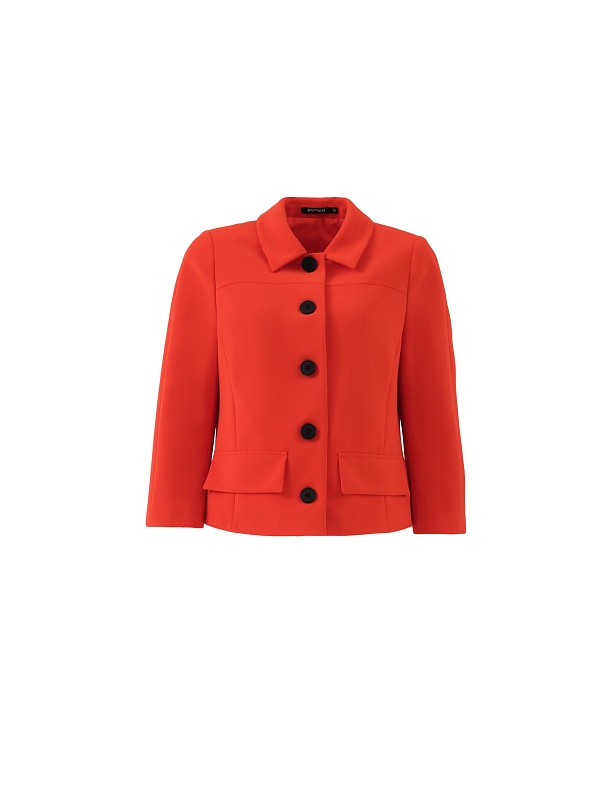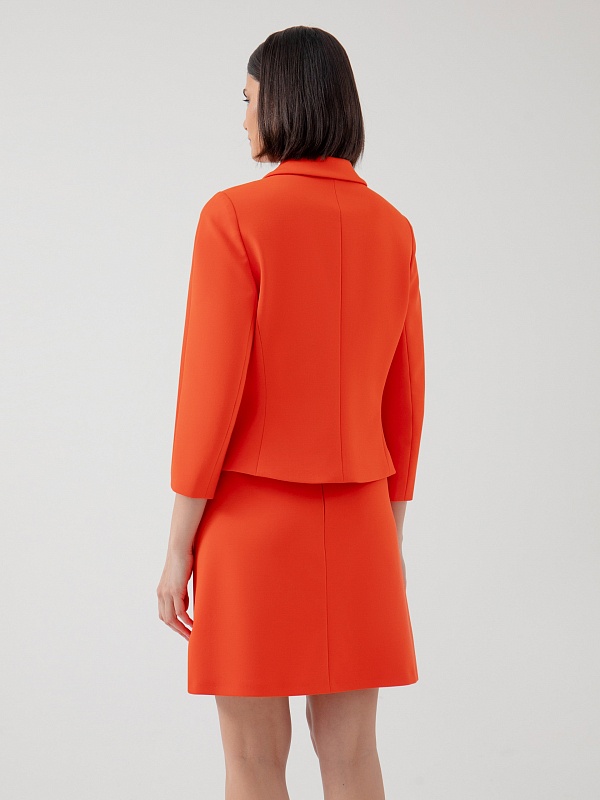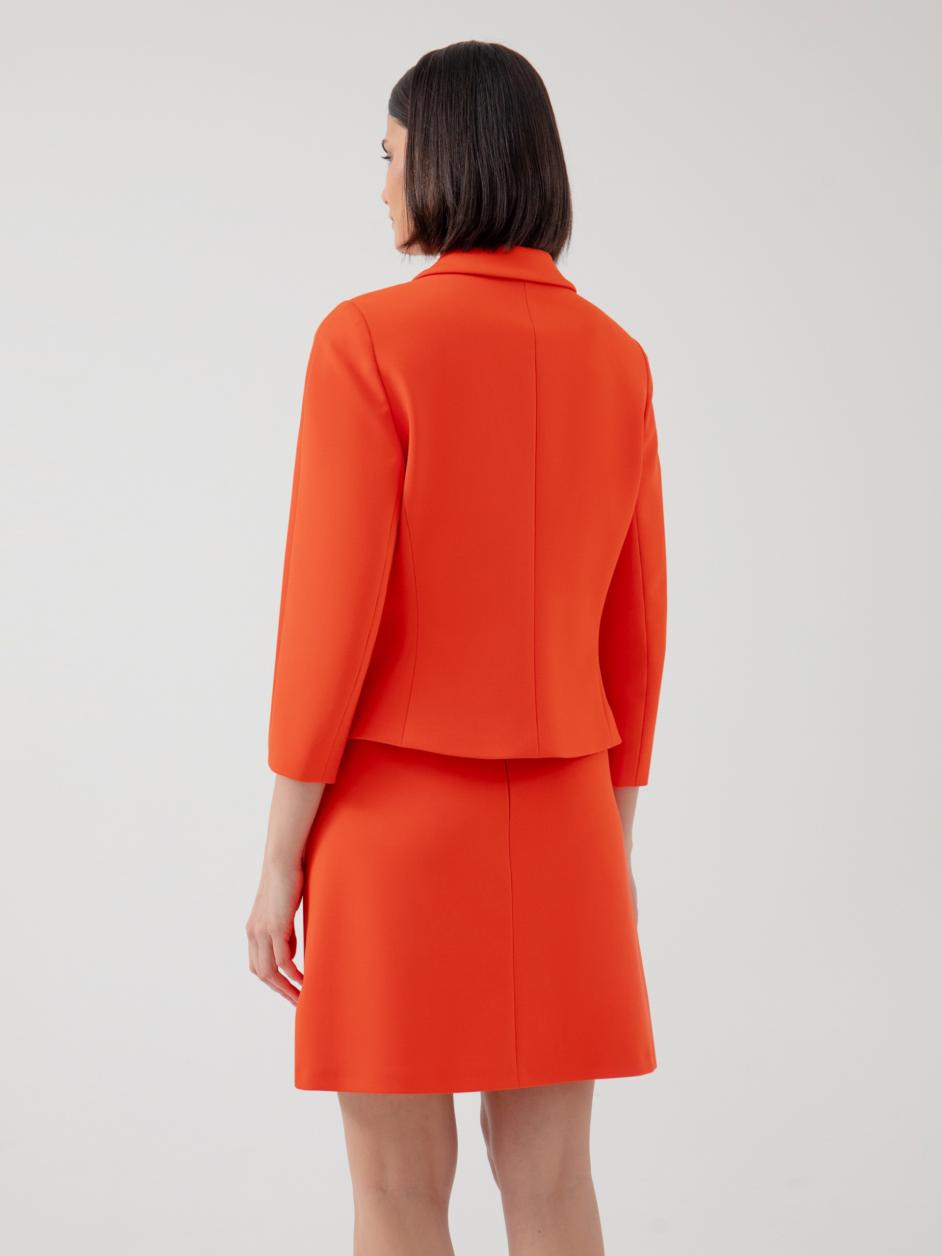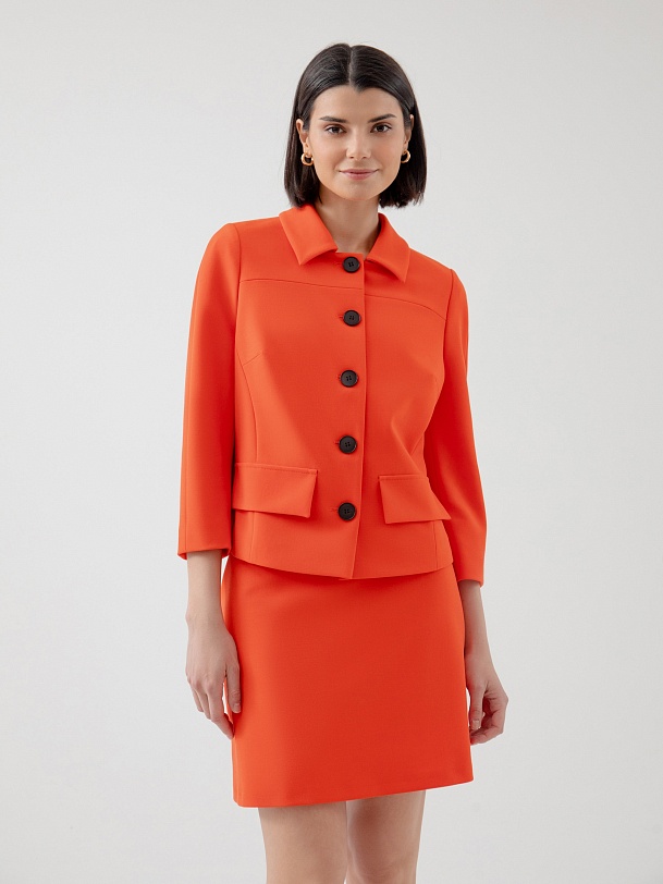 Укороченный жакет в стиле 60-х приталенного силуэта. Жакет выполнен из костюмной ткани с добавлением вискозы в ярком весеннем цвете "грейпфрут", отличается укороченным силуэтом с однобортной застежкой, рукавом 7/8 длины и клапанами на талии. Изделие можно носить с мини-юбкой для создания яркого образа.