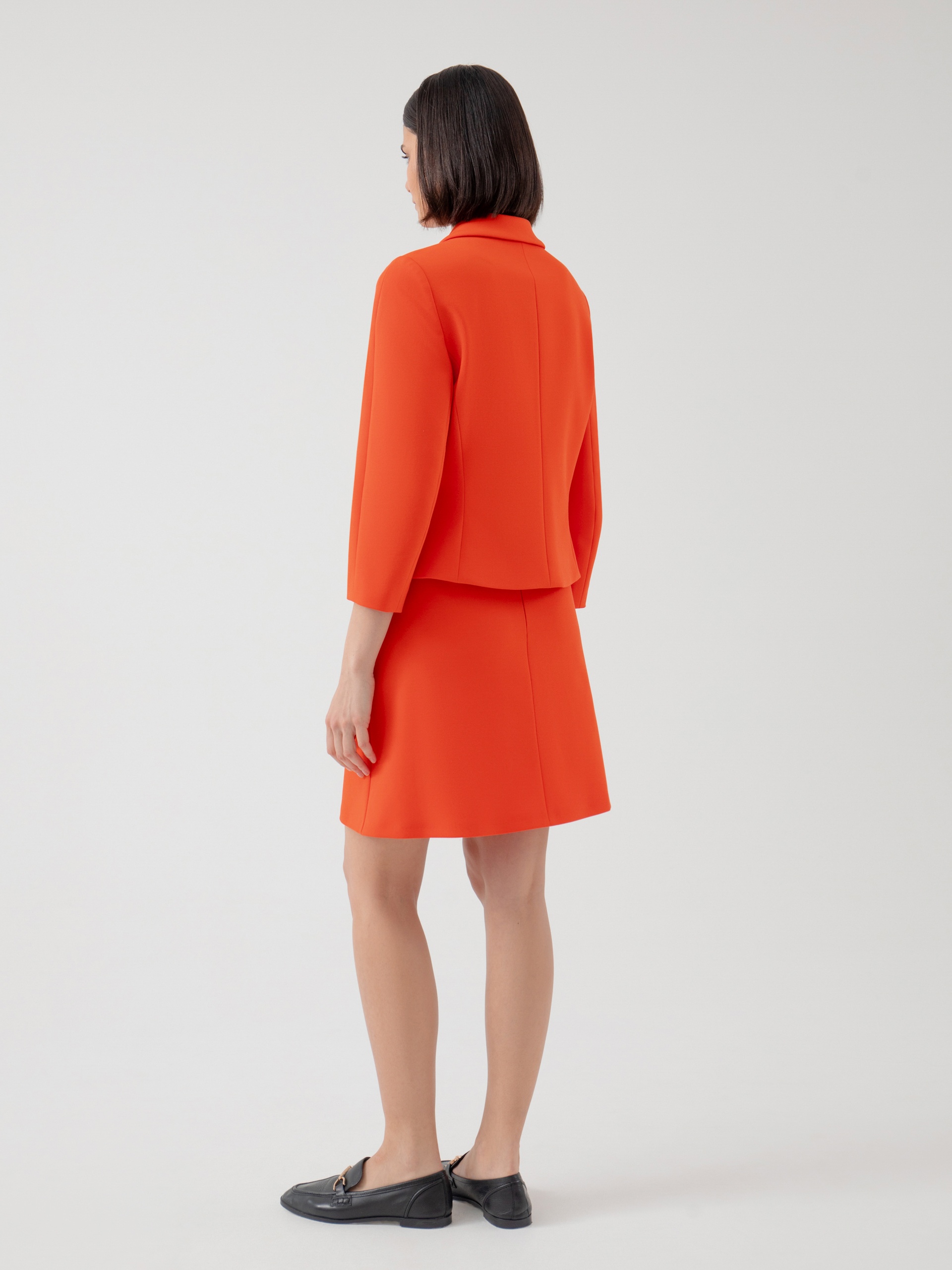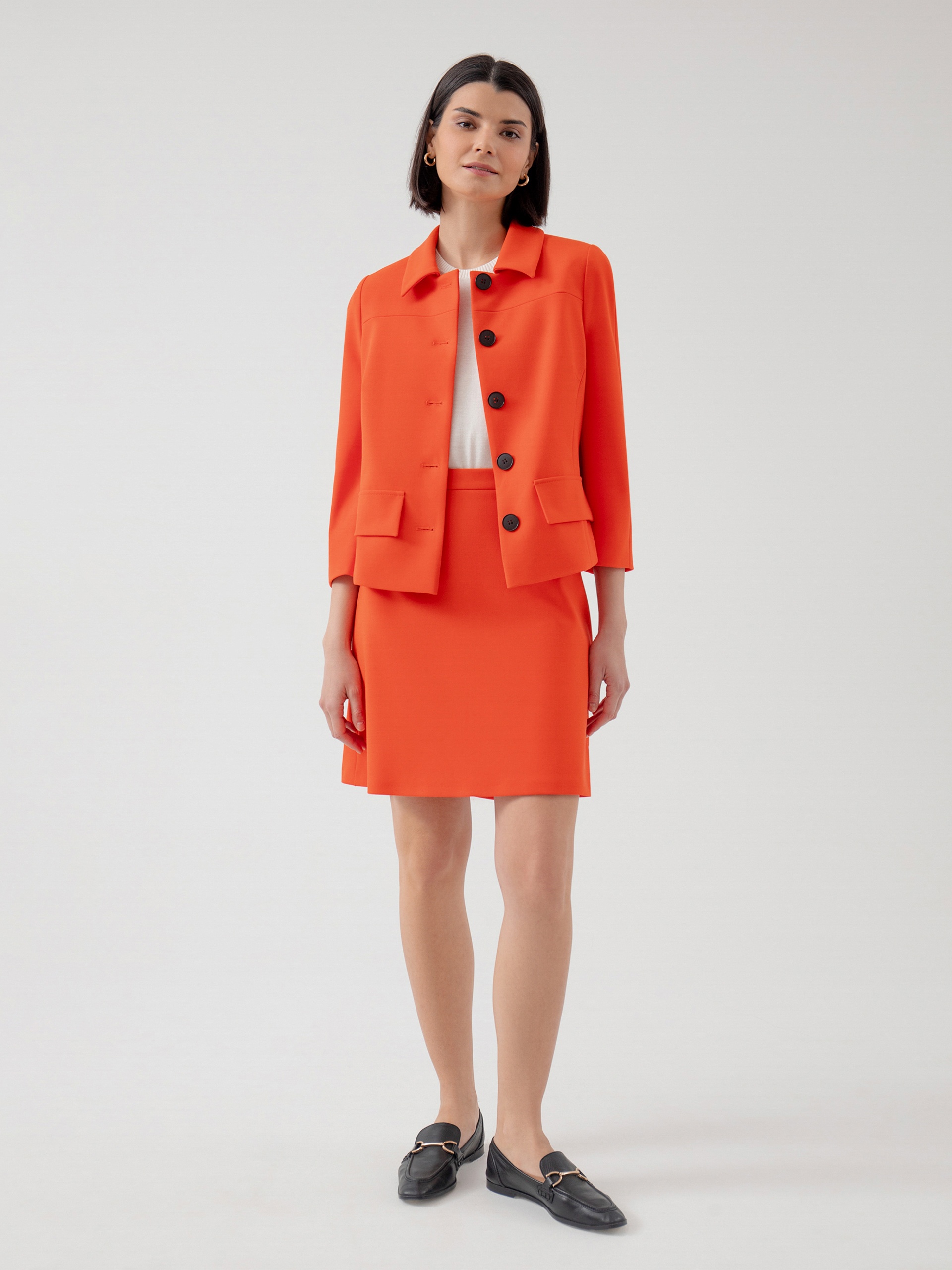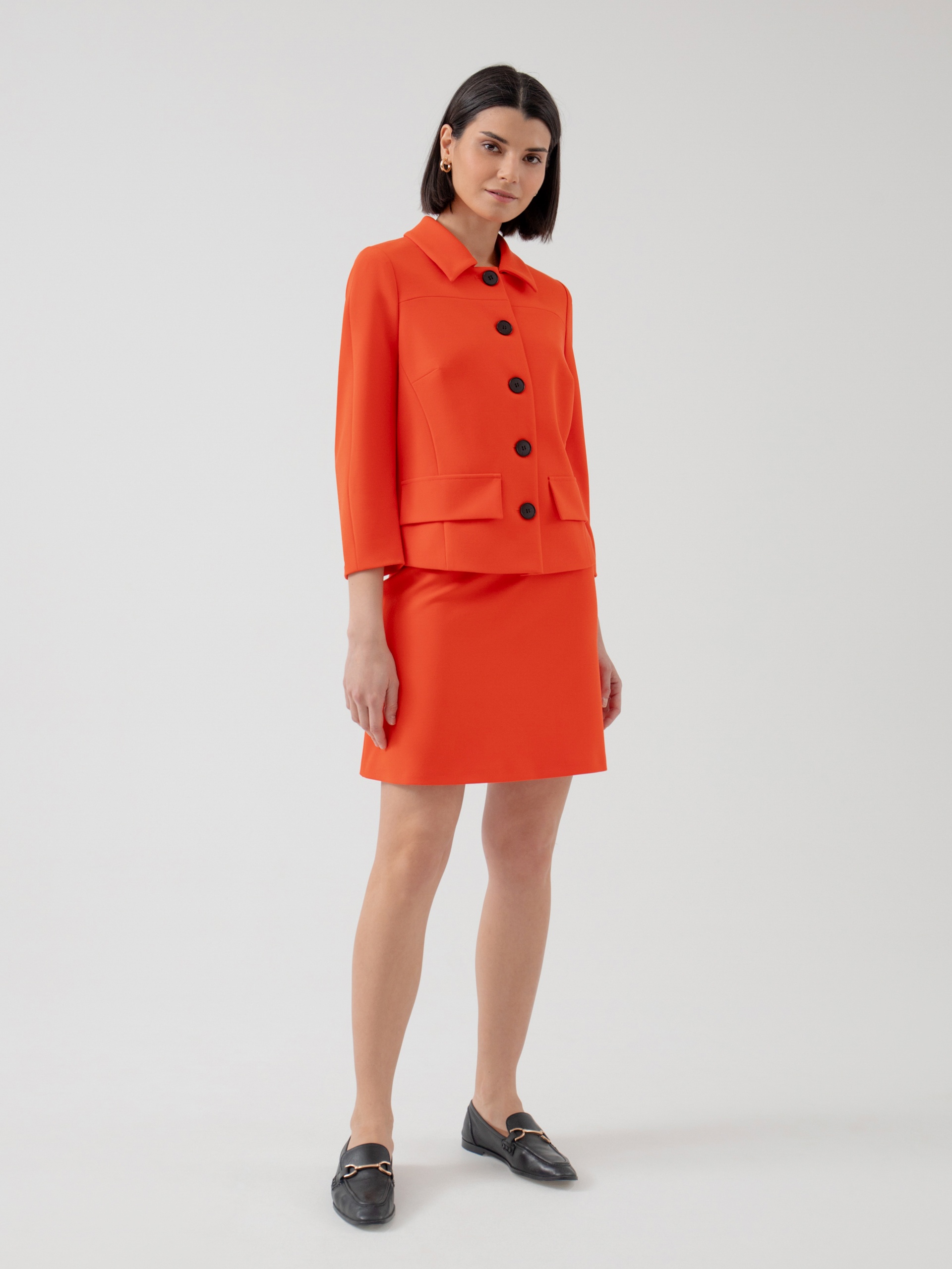 Укороченный жакет в стиле 60-х приталенного силуэта. Жакет выполнен из костюмной ткани с добавлением вискозы в ярком весеннем цвете "грейпфрут", отличается укороченным силуэтом с однобортной застежкой, рукавом 7/8 длины и клапанами на талии. Изделие можно носить с мини-юбкой для создания яркого образа.
