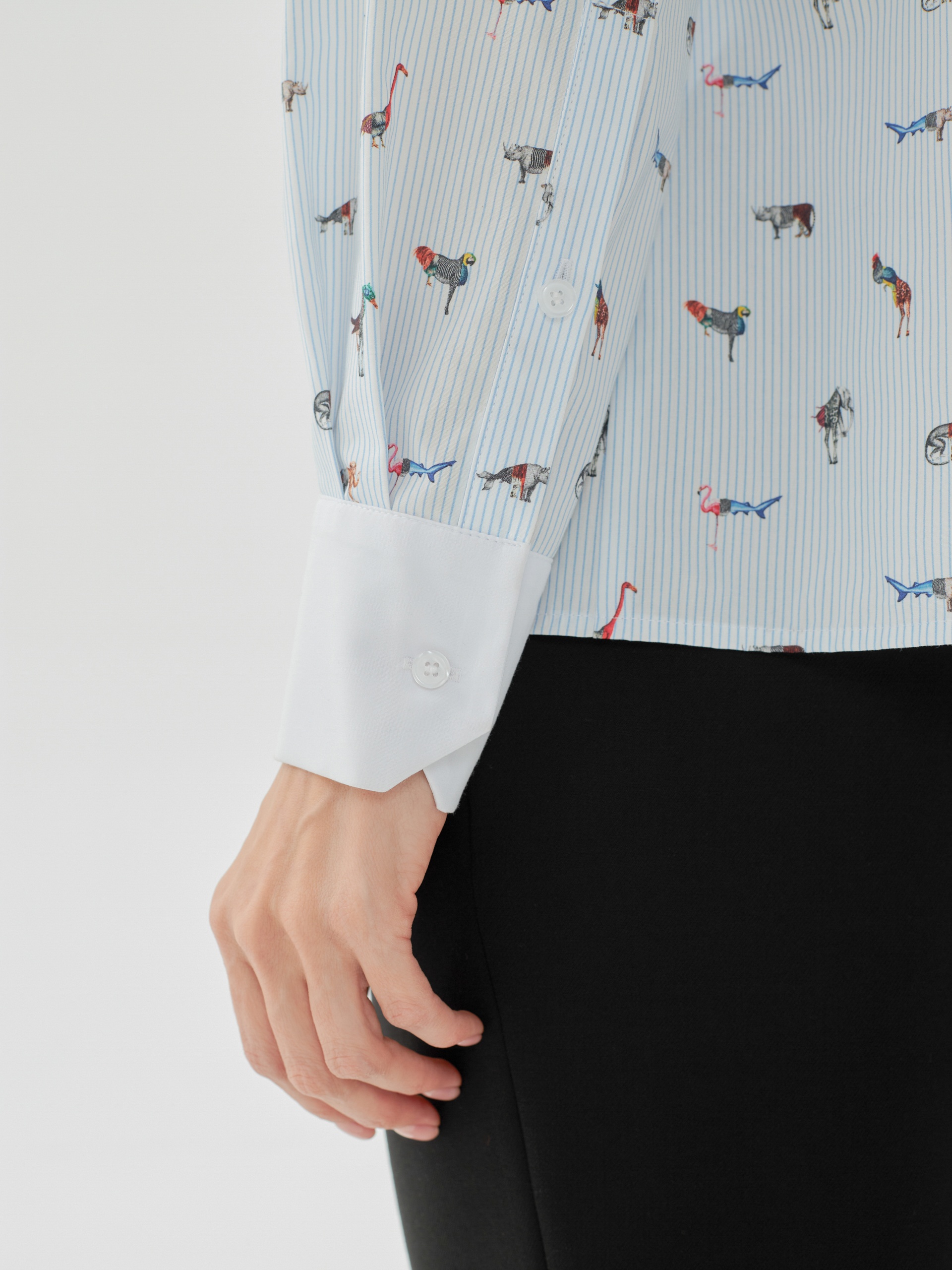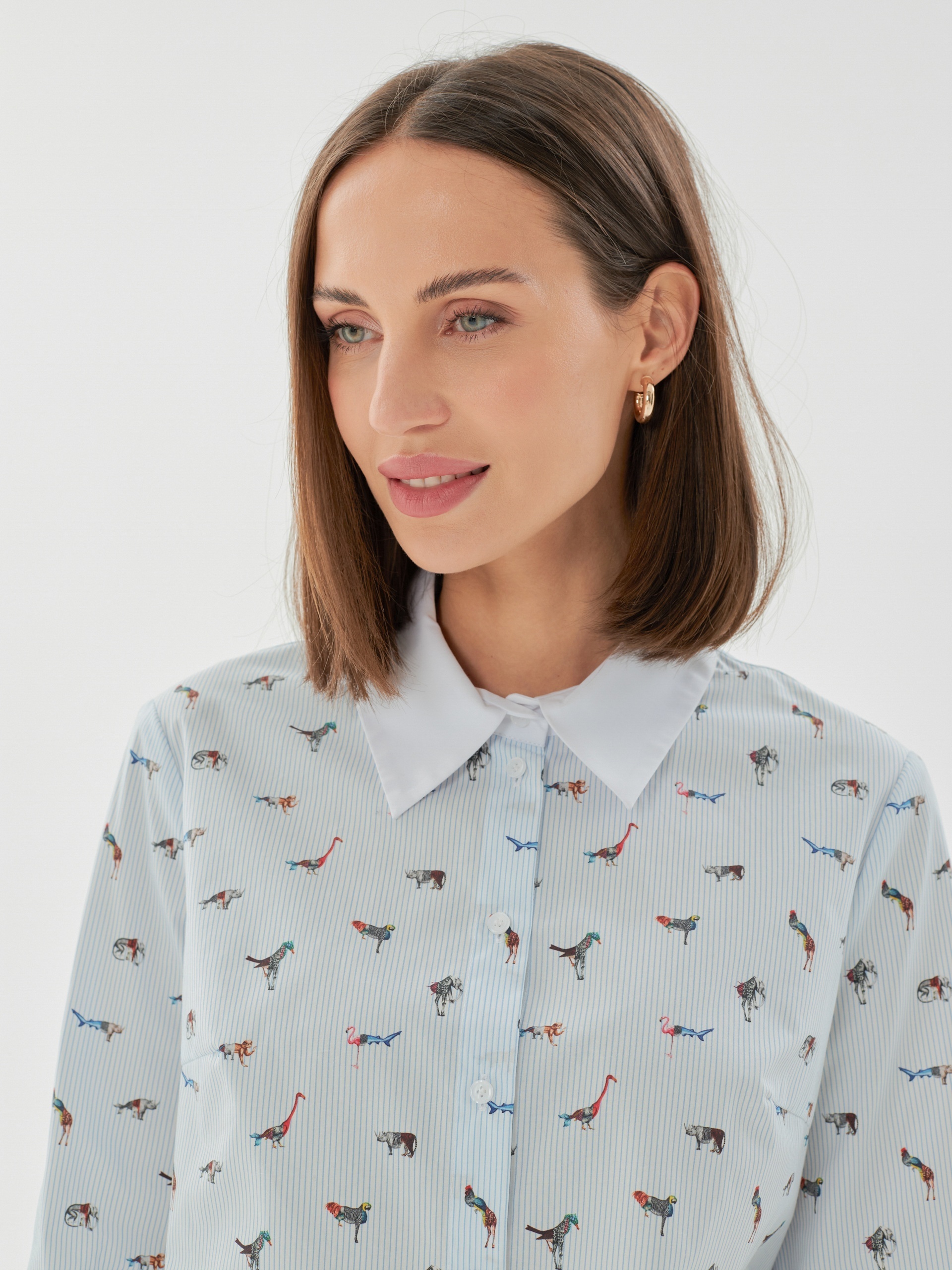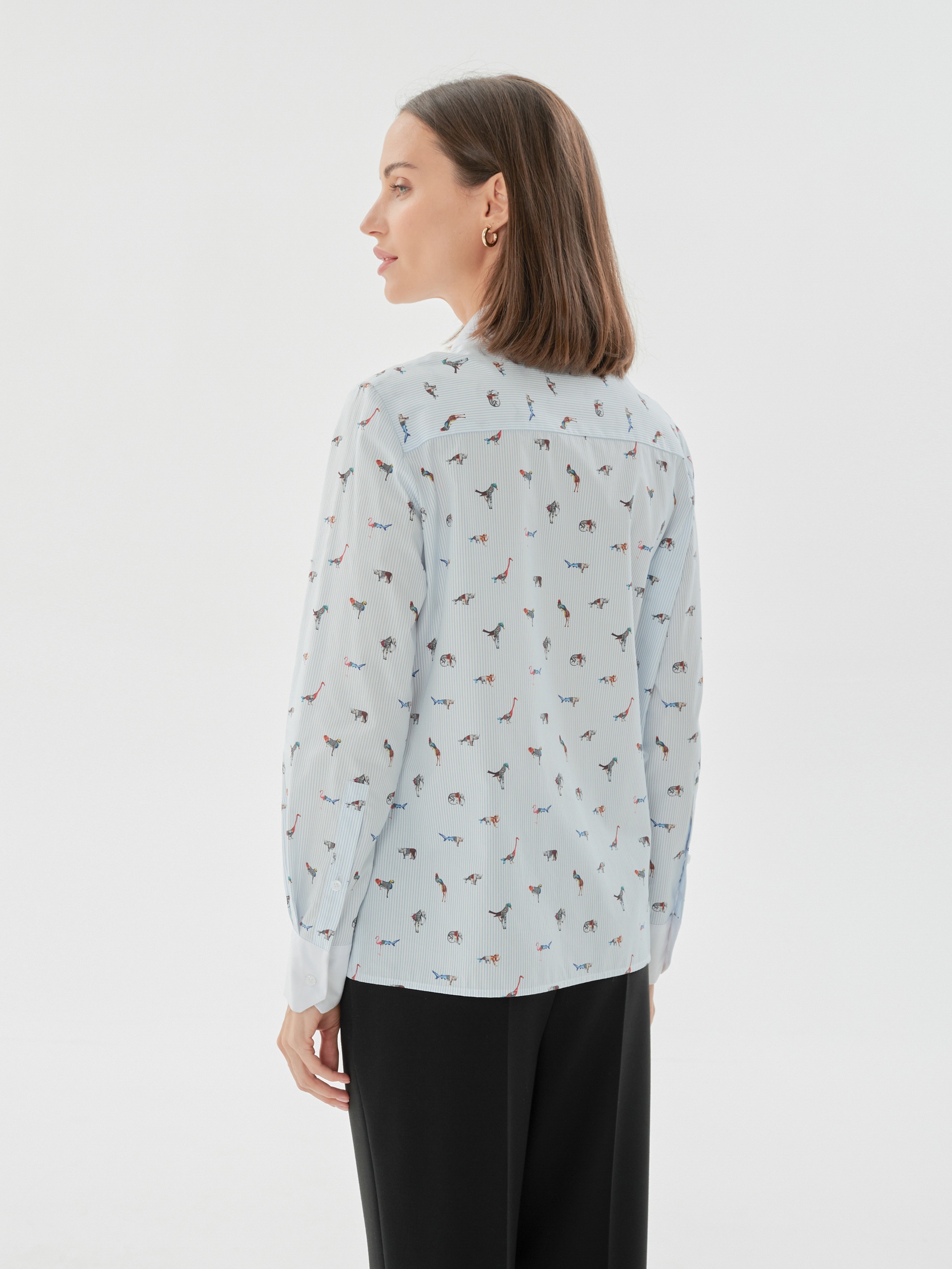 Свободная блуза прямого силуэта, выполнена в принте с фантастическими животными, воплощающем в себе идею создания сюрреалистичной фауны мира будущего. Манжеты и воротник выполнены из контрастного белого хлопка. На спинке кокетка со складкой.
