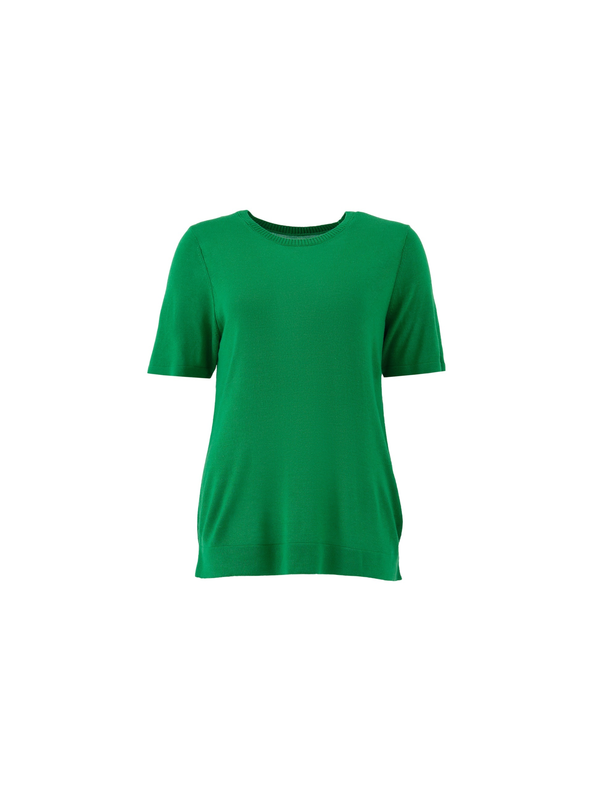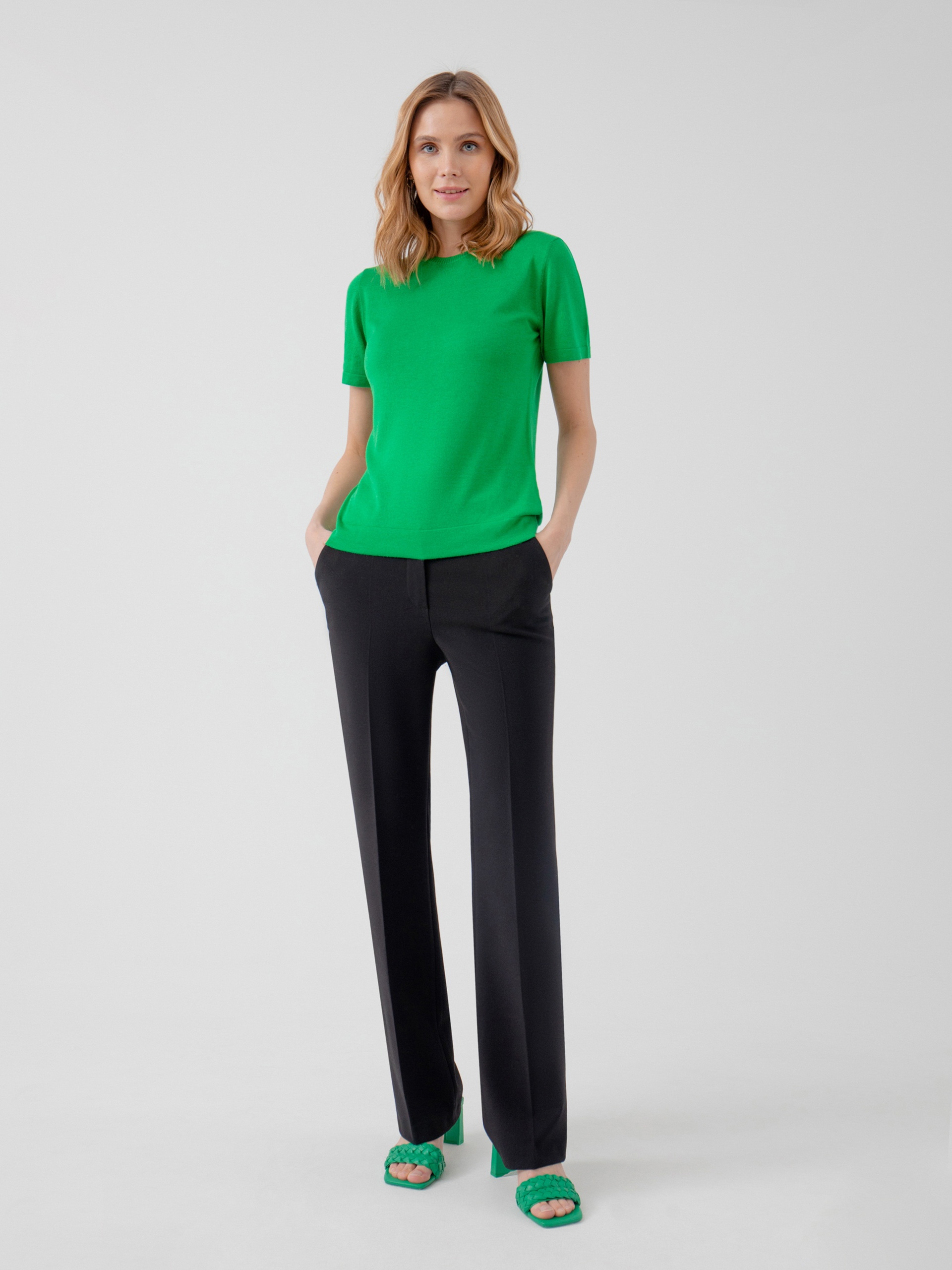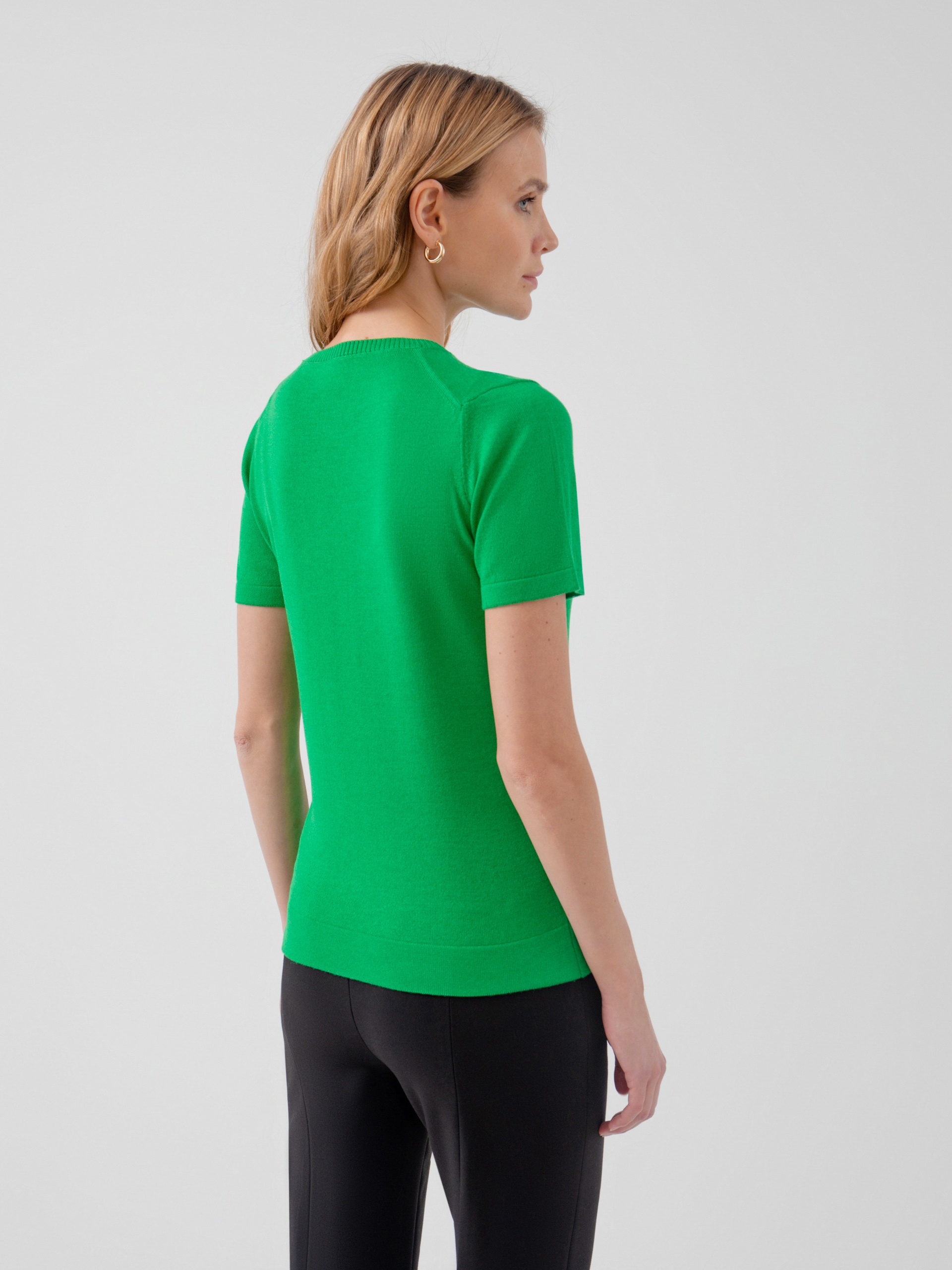 Джемпер с коротким рукавом сочетает универсальность свободной прямой футболки с комфортом тонкого вязаного трикотажа. Гладкая к нежной коже вискозная нить холодит кожу, не электризуется и обладает легким блеском.
