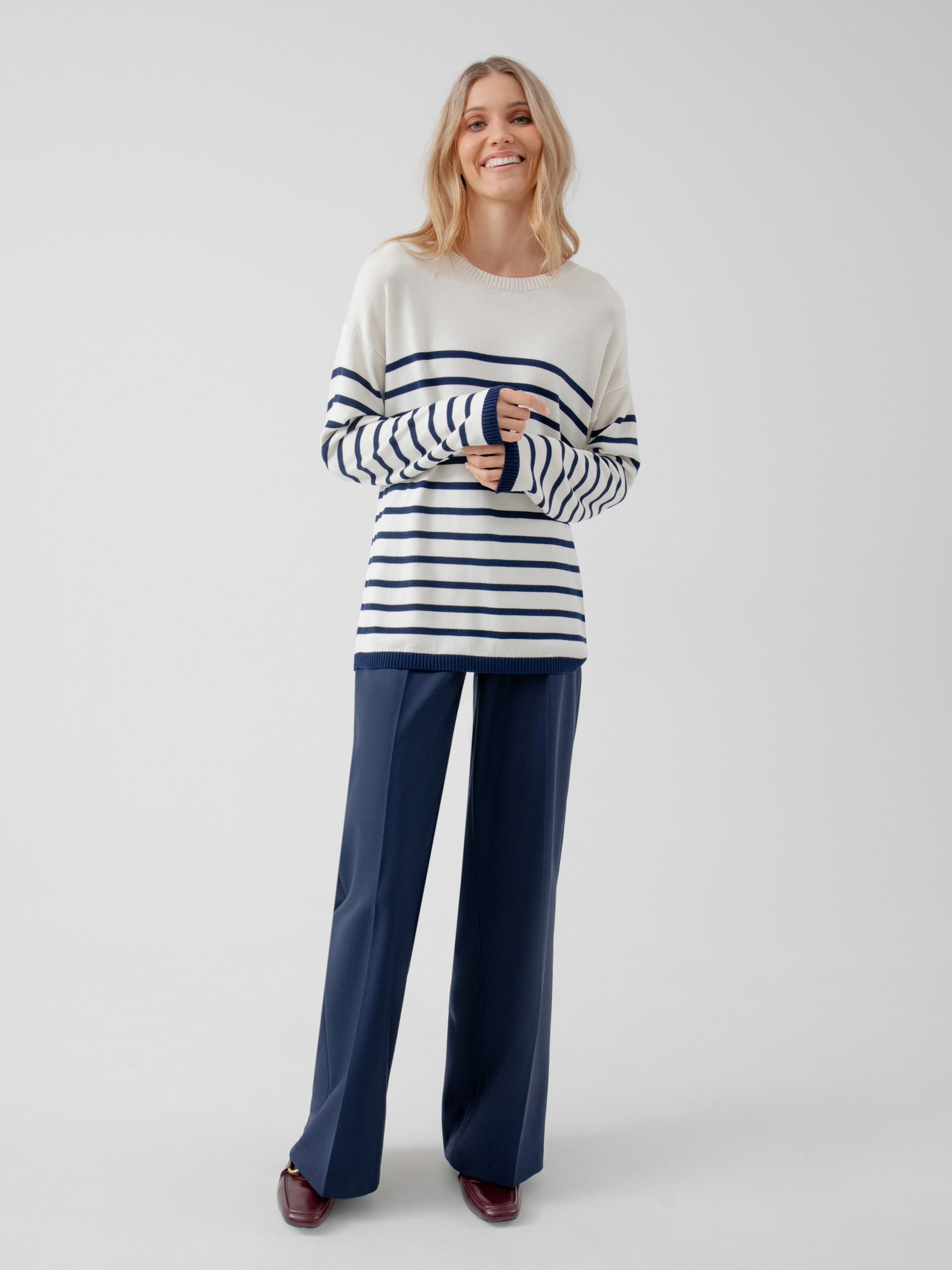 Джемпер свободного кроя в бретонскую полоску придаст вашему весеннему образу настроение морского вояжа, даже если за окном холода.