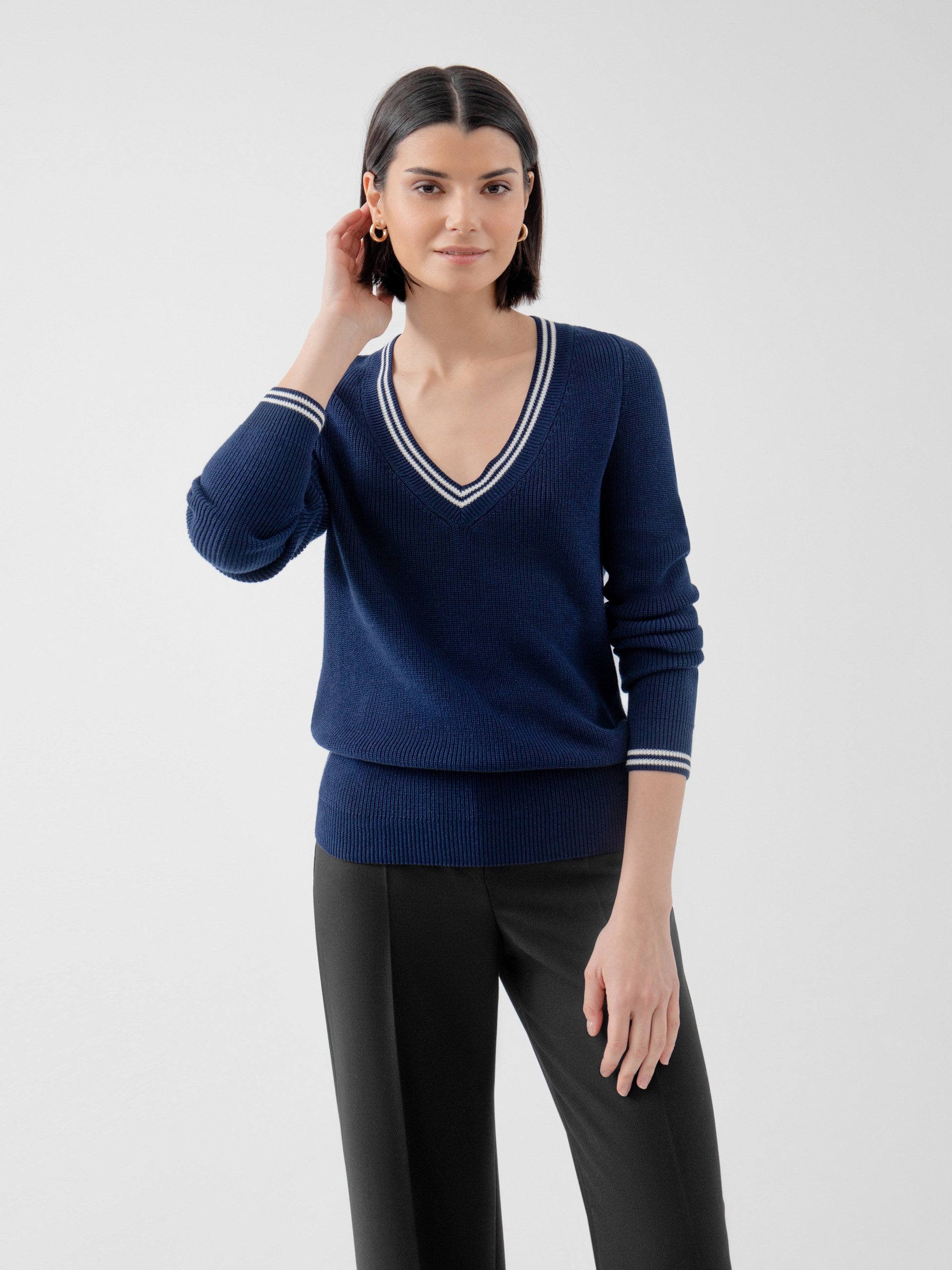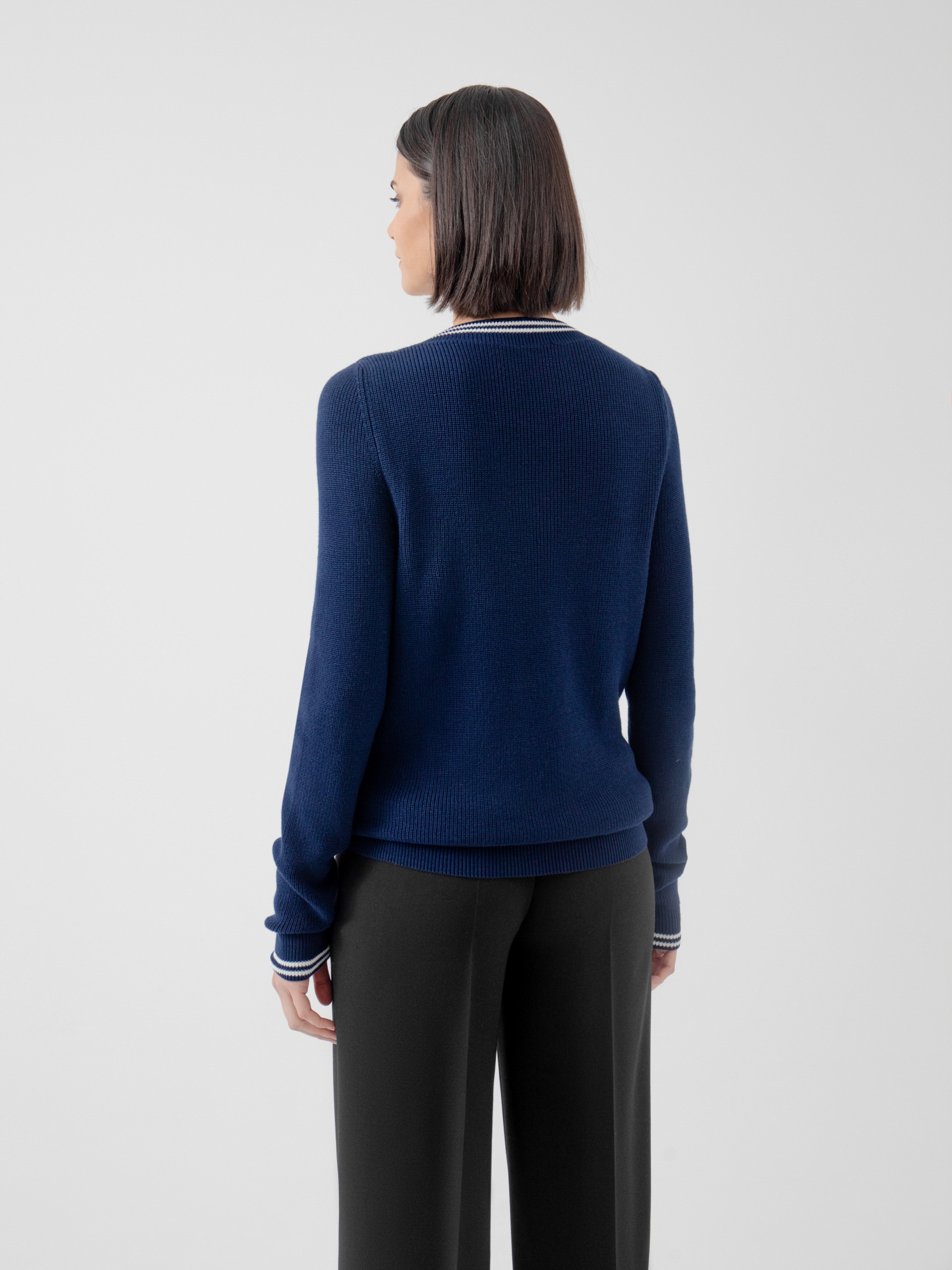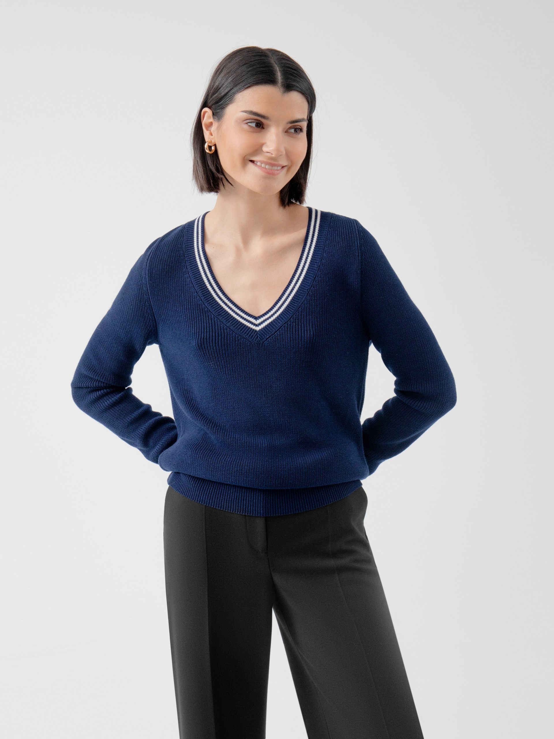 Базовый джемпер с V-образным вырезом горловины, связанный резинкой, с контрастными белыми полосками по вороту и манжетам. Будет абсолютным "must haVe" для вашего гардероба, легко создавая беспроигрышные ансамбли с другими вещами.