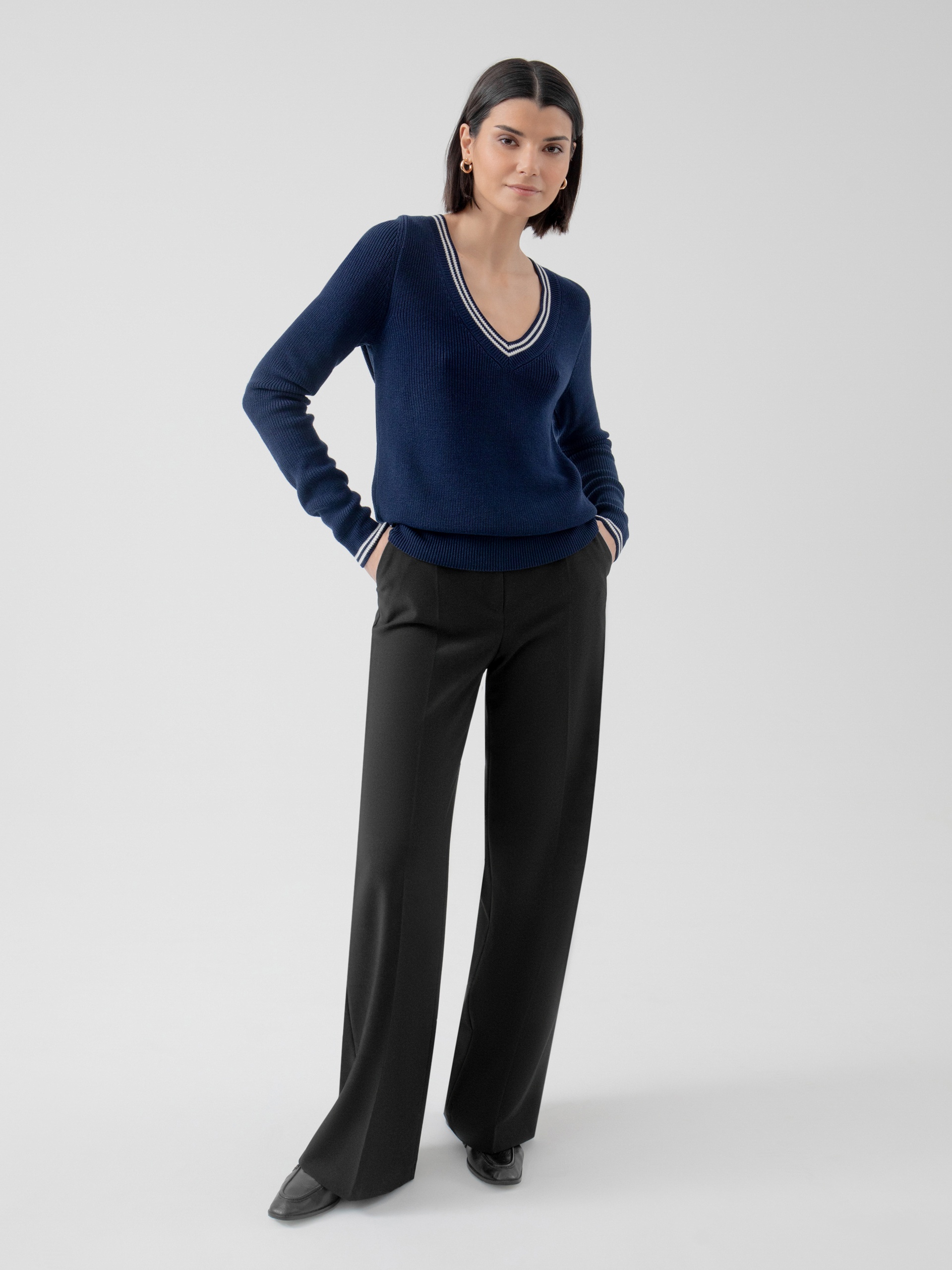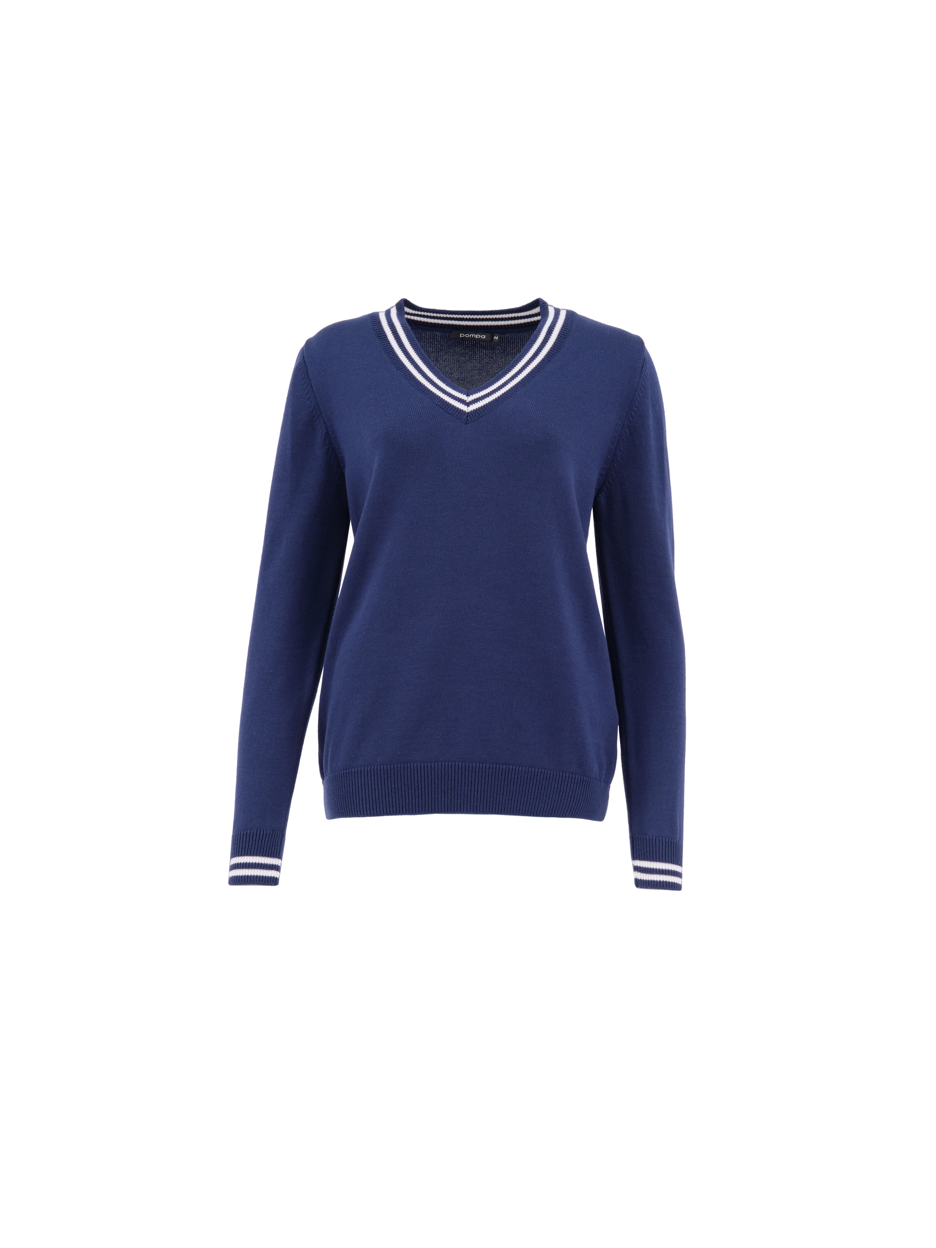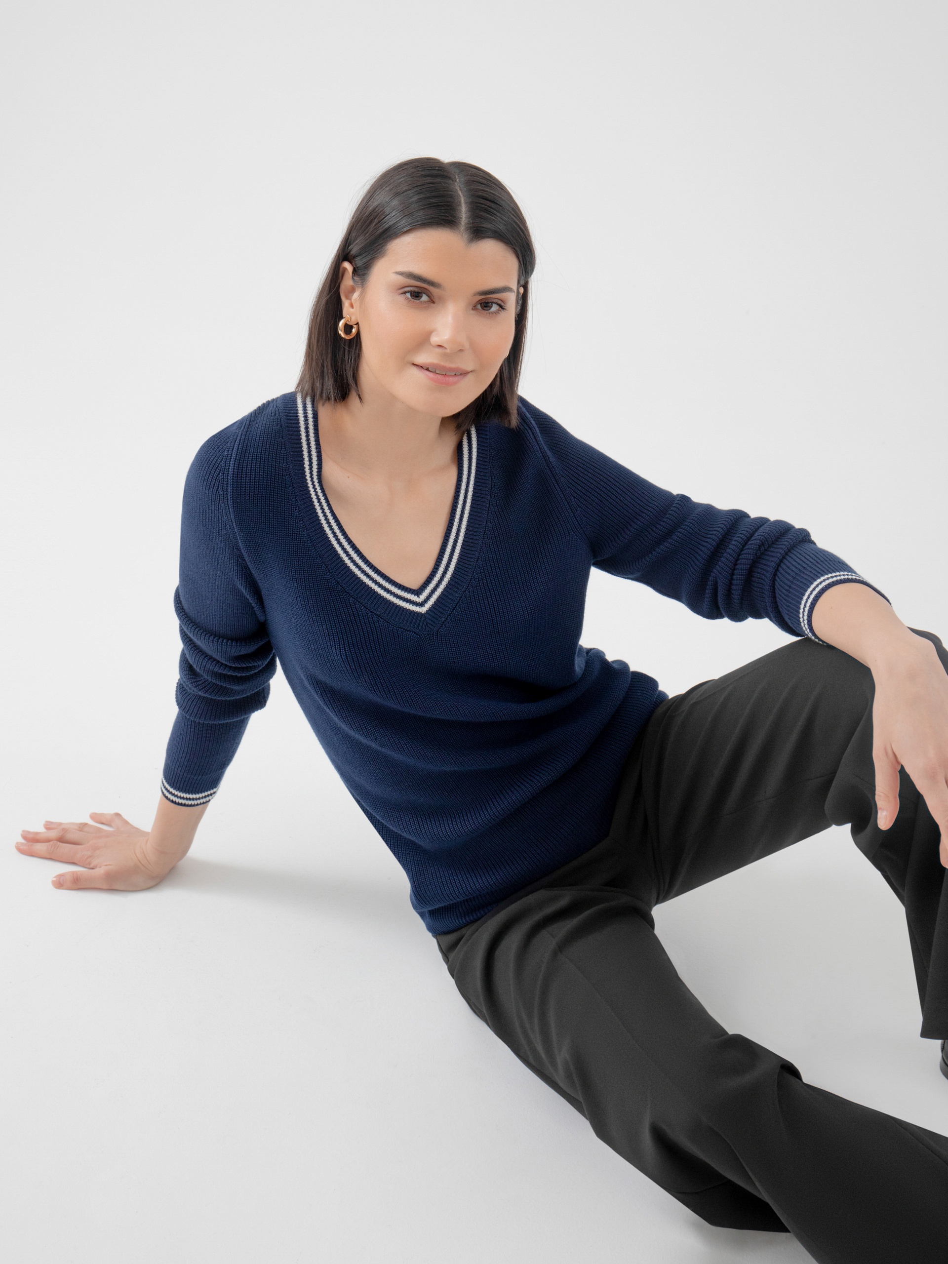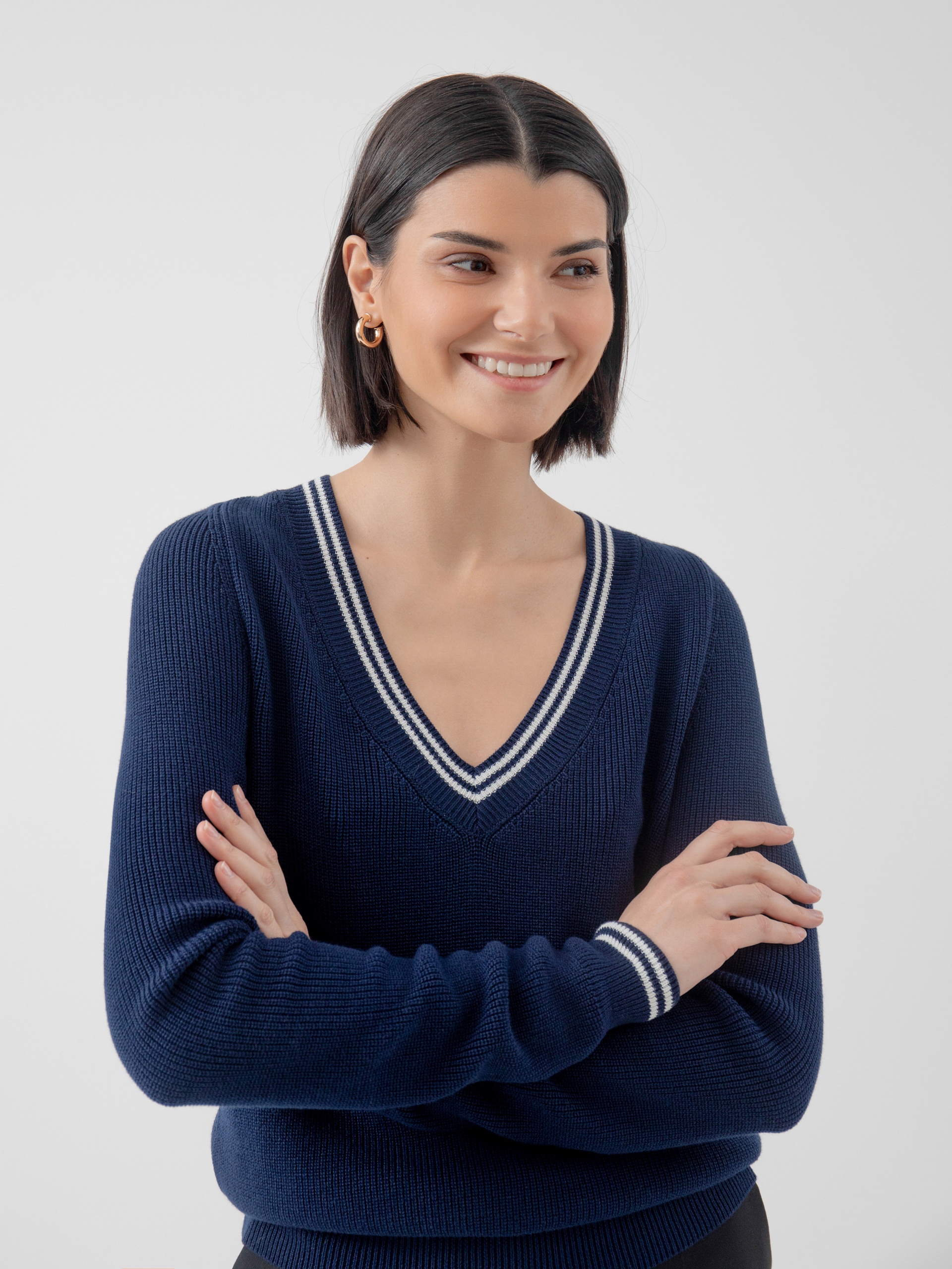 Базовый джемпер с V-образным вырезом горловины, связанный резинкой, с контрастными белыми полосками по вороту и манжетам. Будет абсолютным "must haVe" для вашего гардероба, легко создавая беспроигрышные ансамбли с другими вещами.
