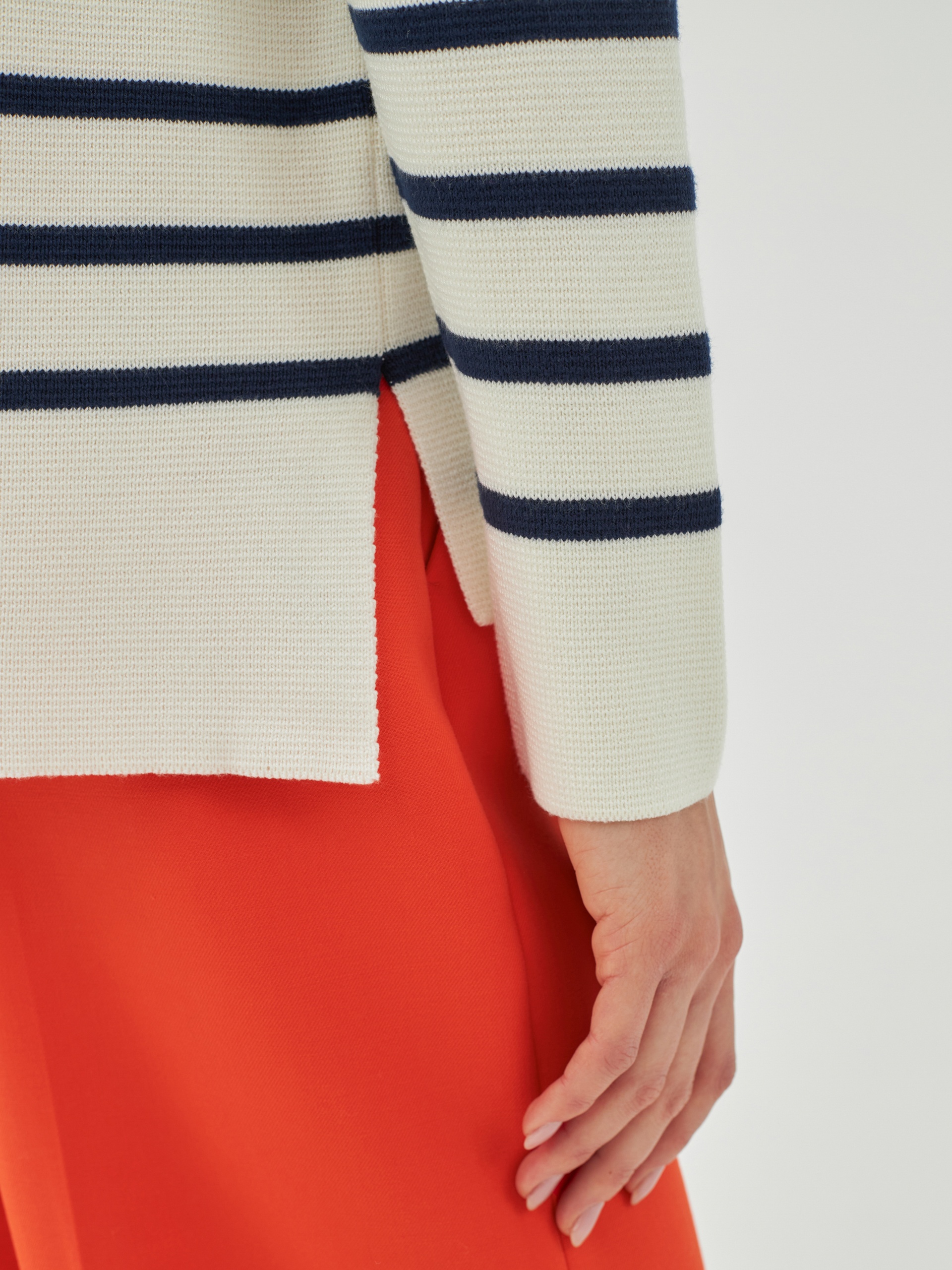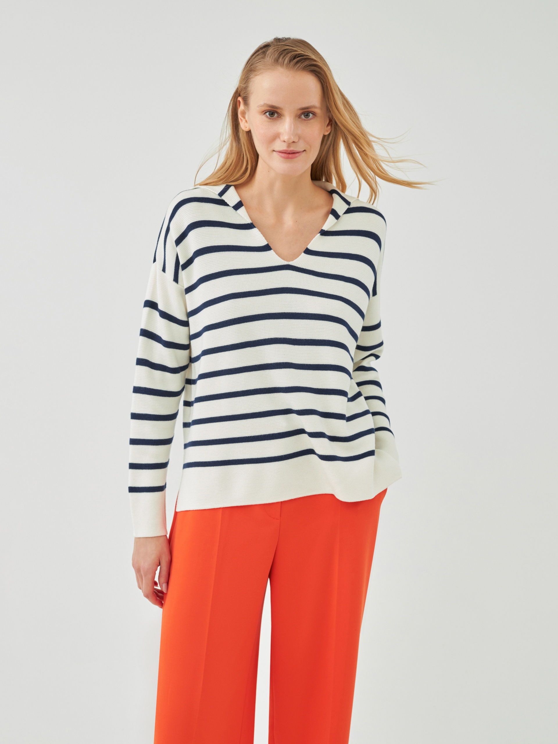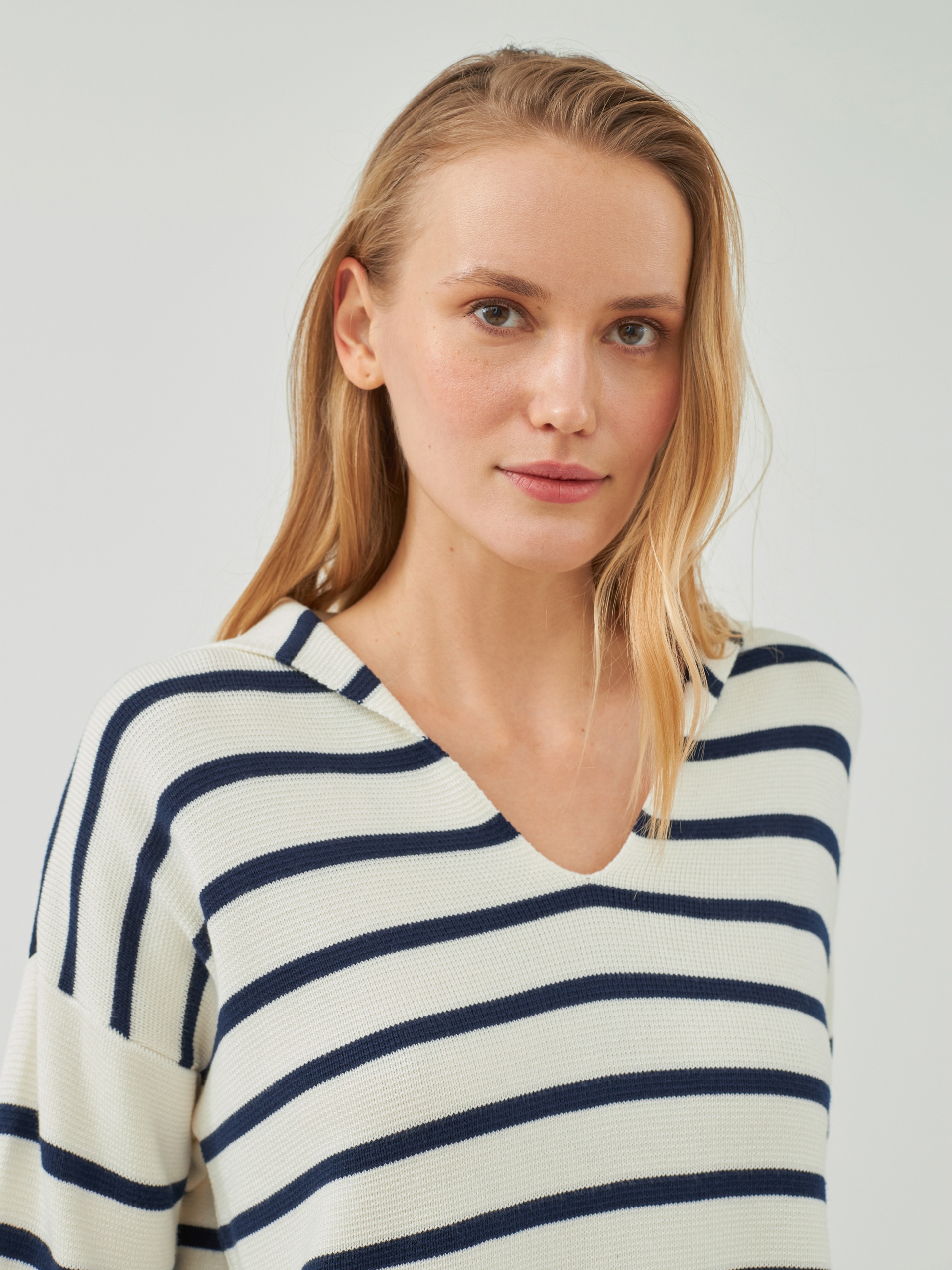 Джемпер свободного силуэта с V-образным вырезом и воротником апаш придаст вашему образу дух свободы. Разрезы по бокам изделия дополнительно подчеркнут это. Вискозная нить в составе пряжи приятно холодит кожу и имеет легкий блеск. С этим джемпером можно создавать как нейтральные, так и яркие образы.