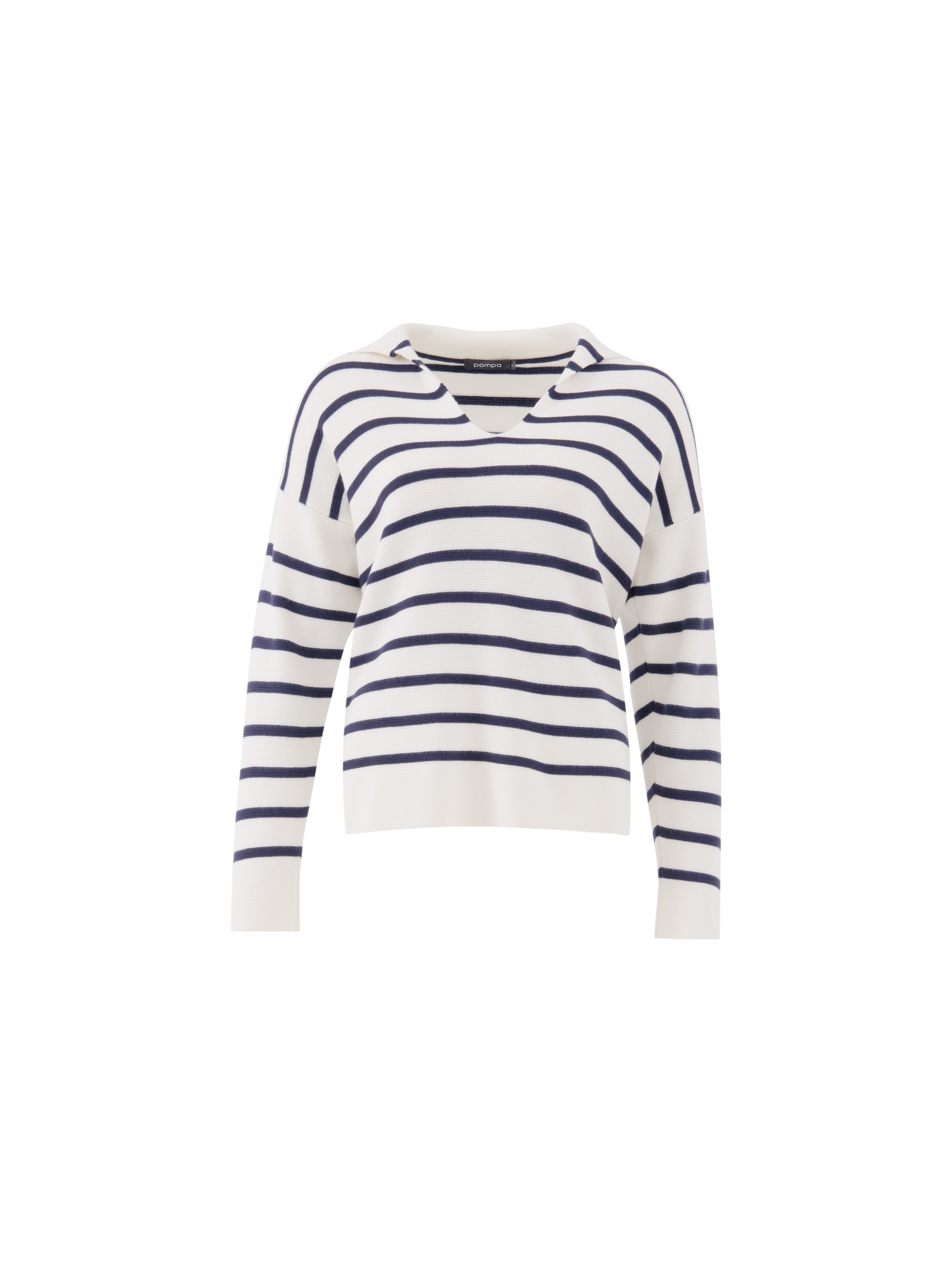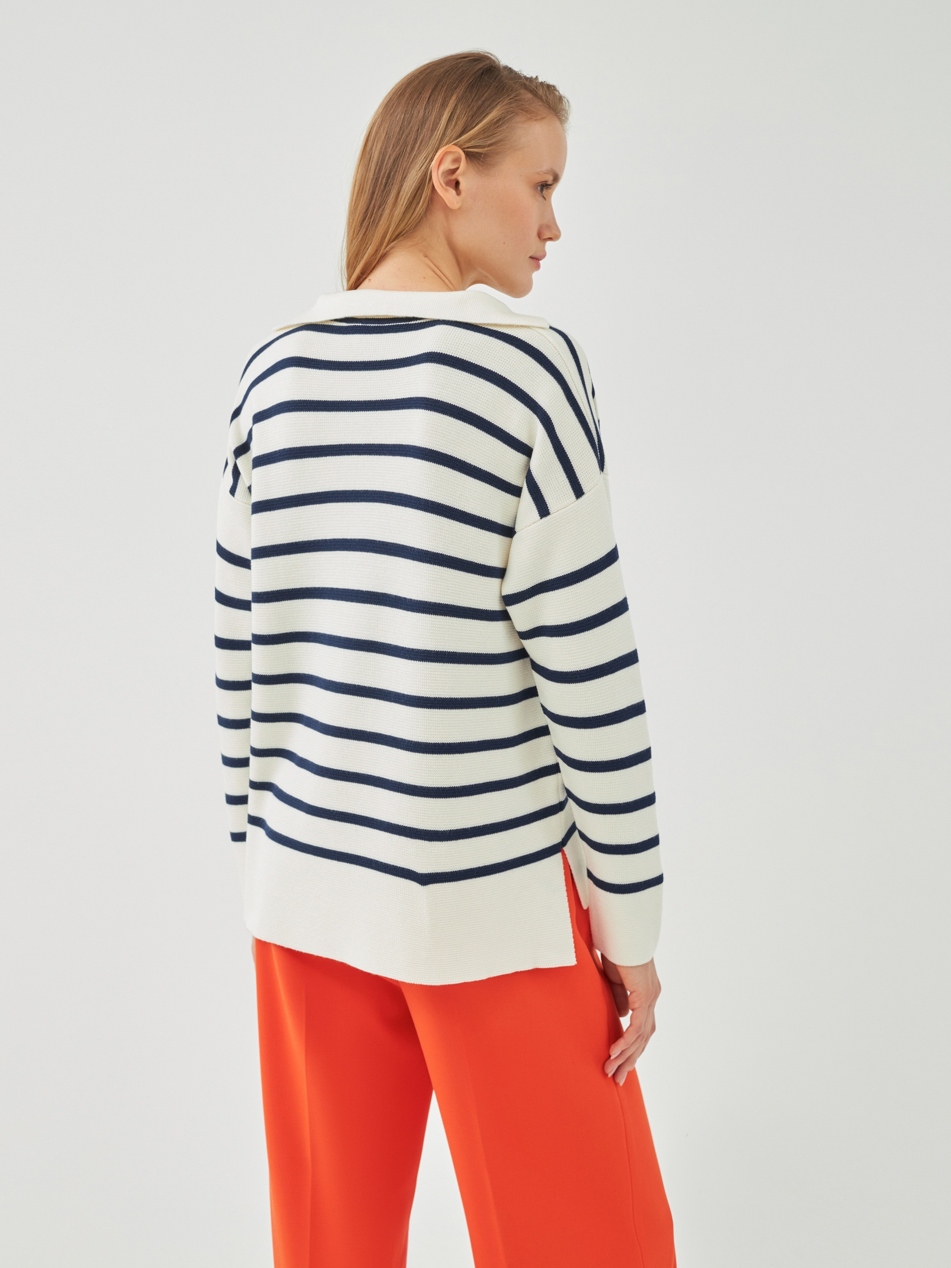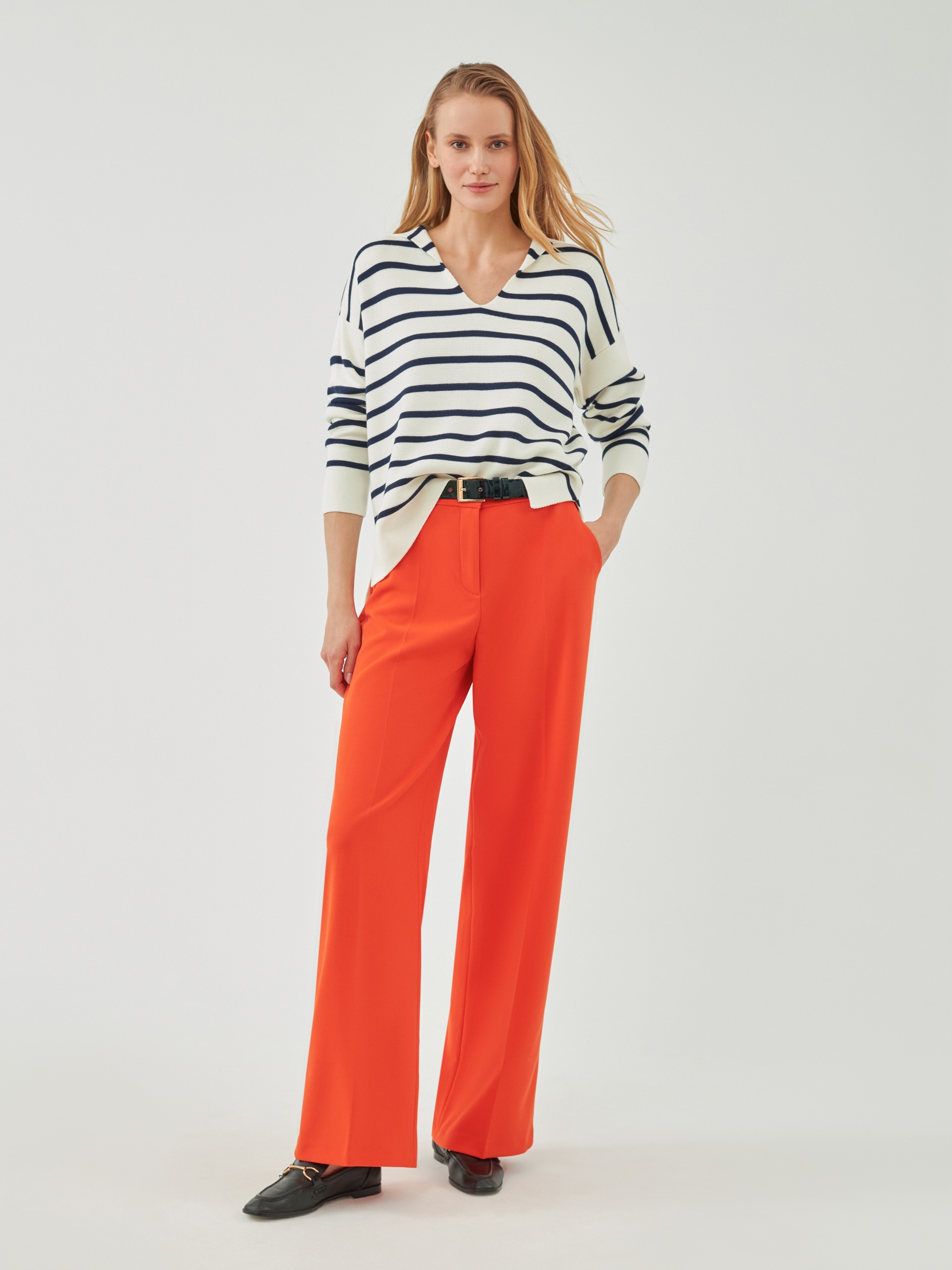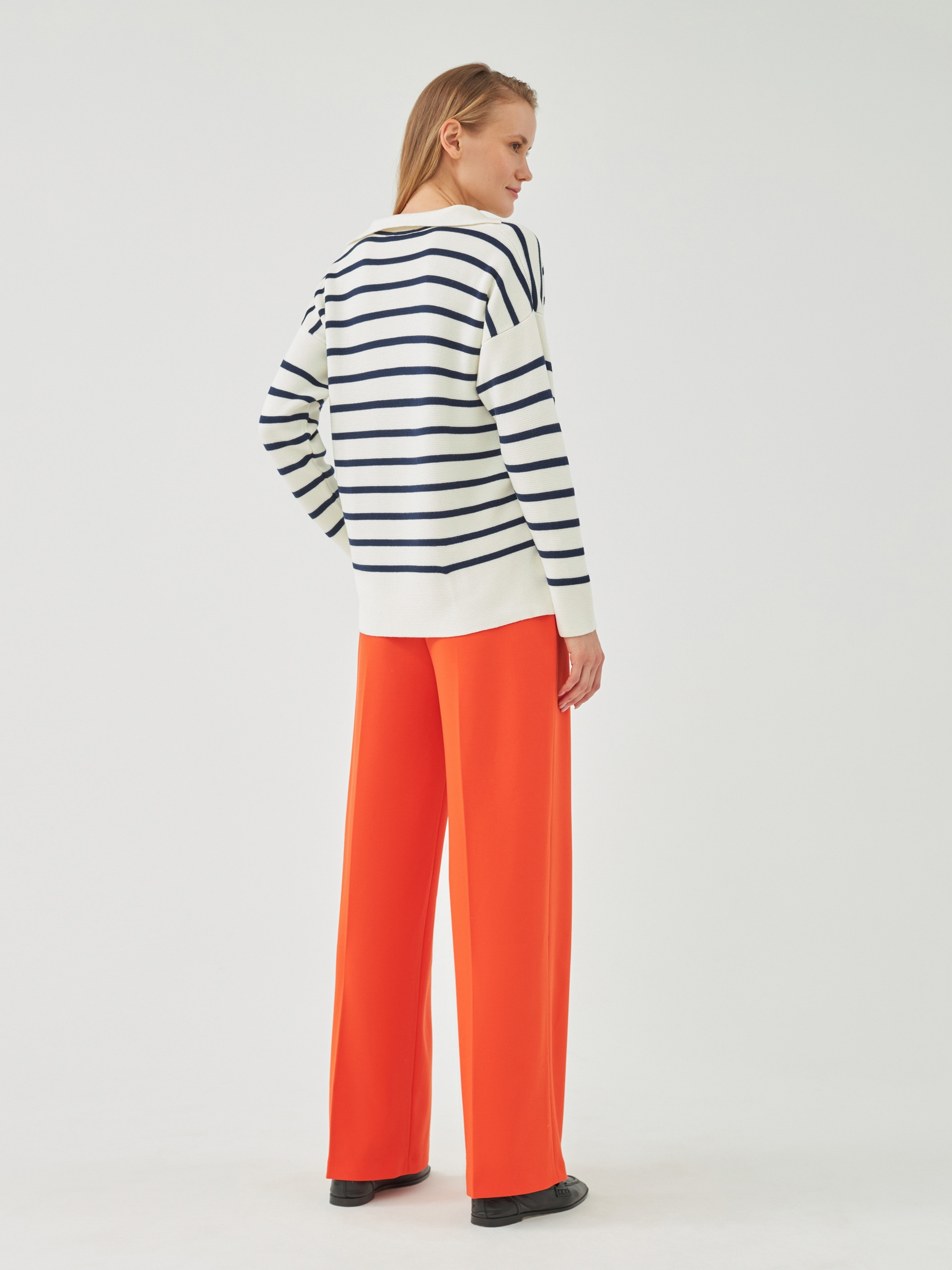 Джемпер свободного силуэта с V-образным вырезом и воротником апаш придаст вашему образу дух свободы. Разрезы по бокам изделия дополнительно подчеркнут это. Вискозная нить в составе пряжи приятно холодит кожу и имеет легкий блеск. С этим джемпером можно создавать как нейтральные, так и яркие образы.
