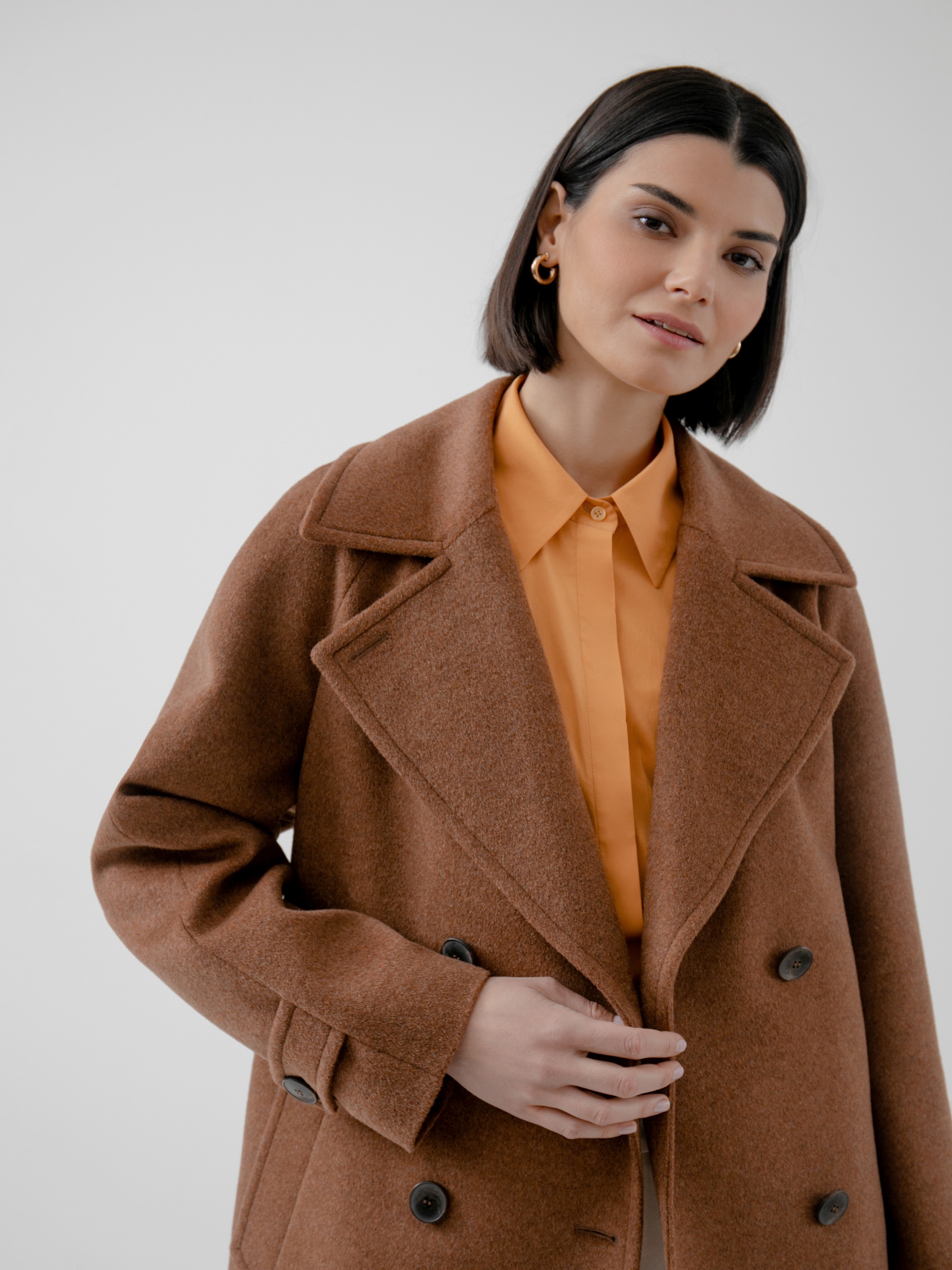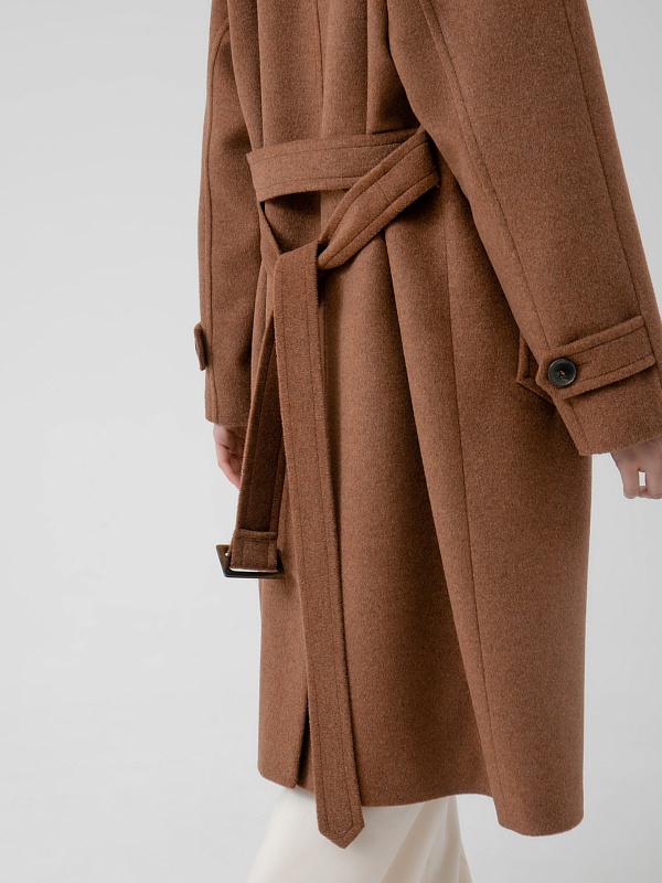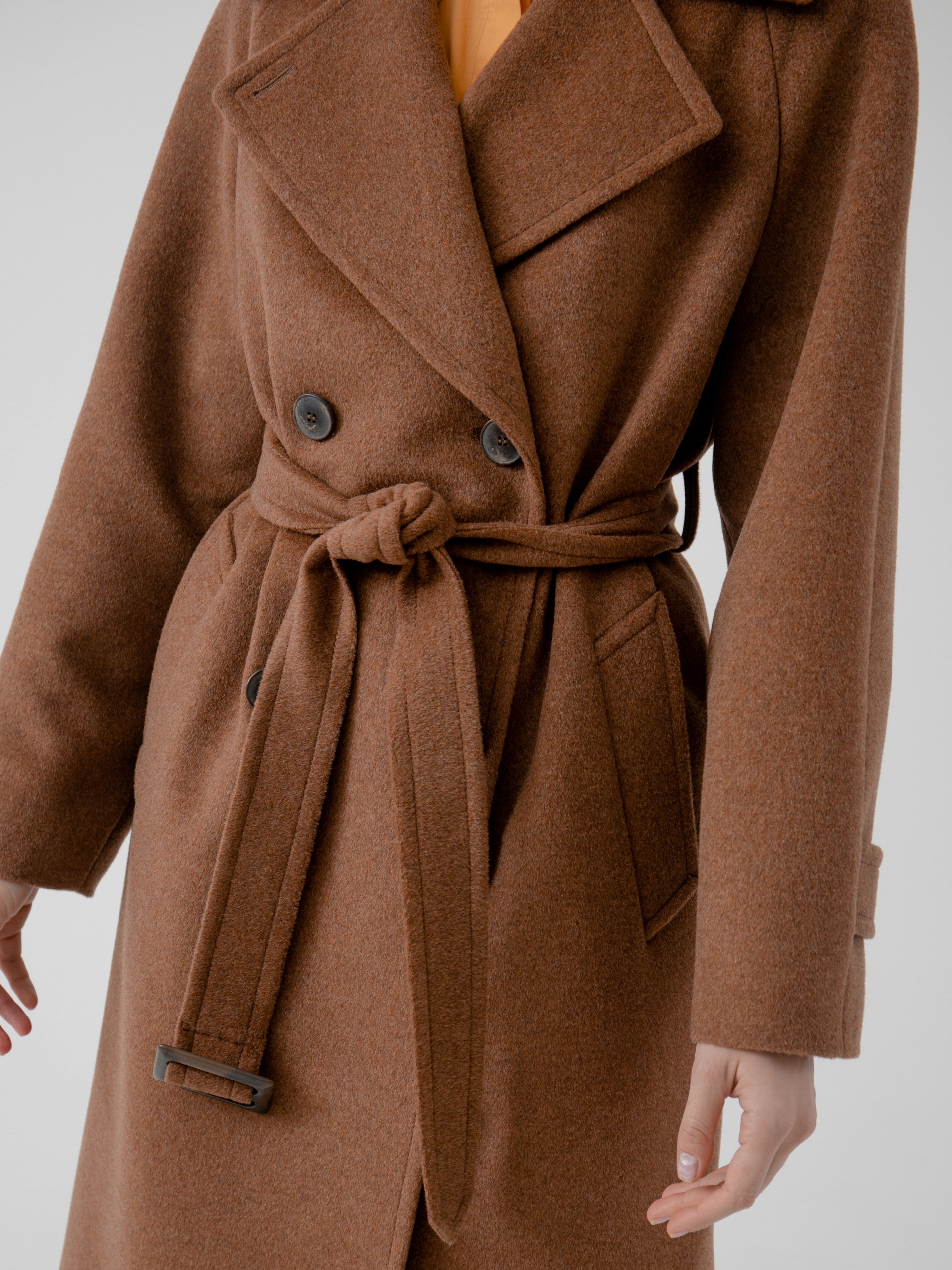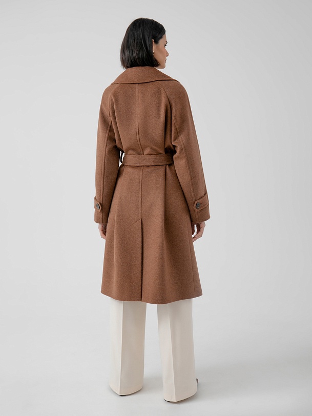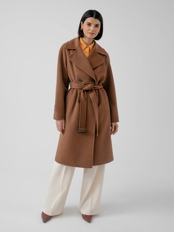 Классическое пальто прямого силуэта в роскошном цвете темный кэмел. Комфортная длина пальто, закрывающая колено, позволяет с легкостью создавать самые различные современные образы и носить его как с брюками, так и с юбками. Мягкая линия рукавов-кимоно не только выглядит очень утонченно, но и создает дополнительный комфорт при надевании объемных свитеров и плотных жакетов первым слоем. В качестве дополнительного аксессуара к пальто прилагается пояс, который подчеркнет талию и сделает образ более женственным, а также с легкостью поможет каждый день создавать уникальные образы. Пальто выполнено из премиальной шерстяной ворсовой ткани. Произведено в Санкт-Петербурге.