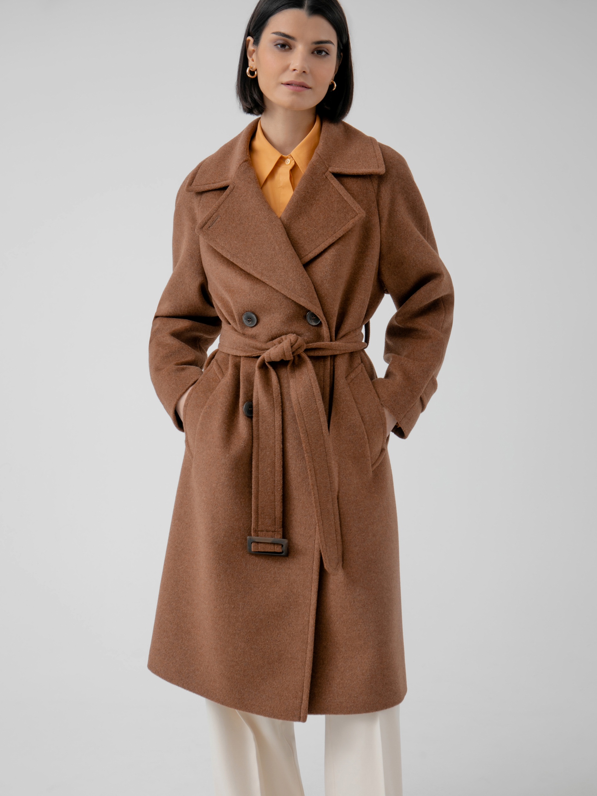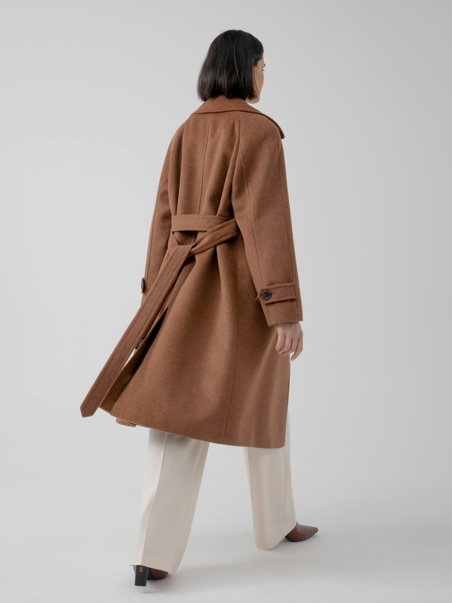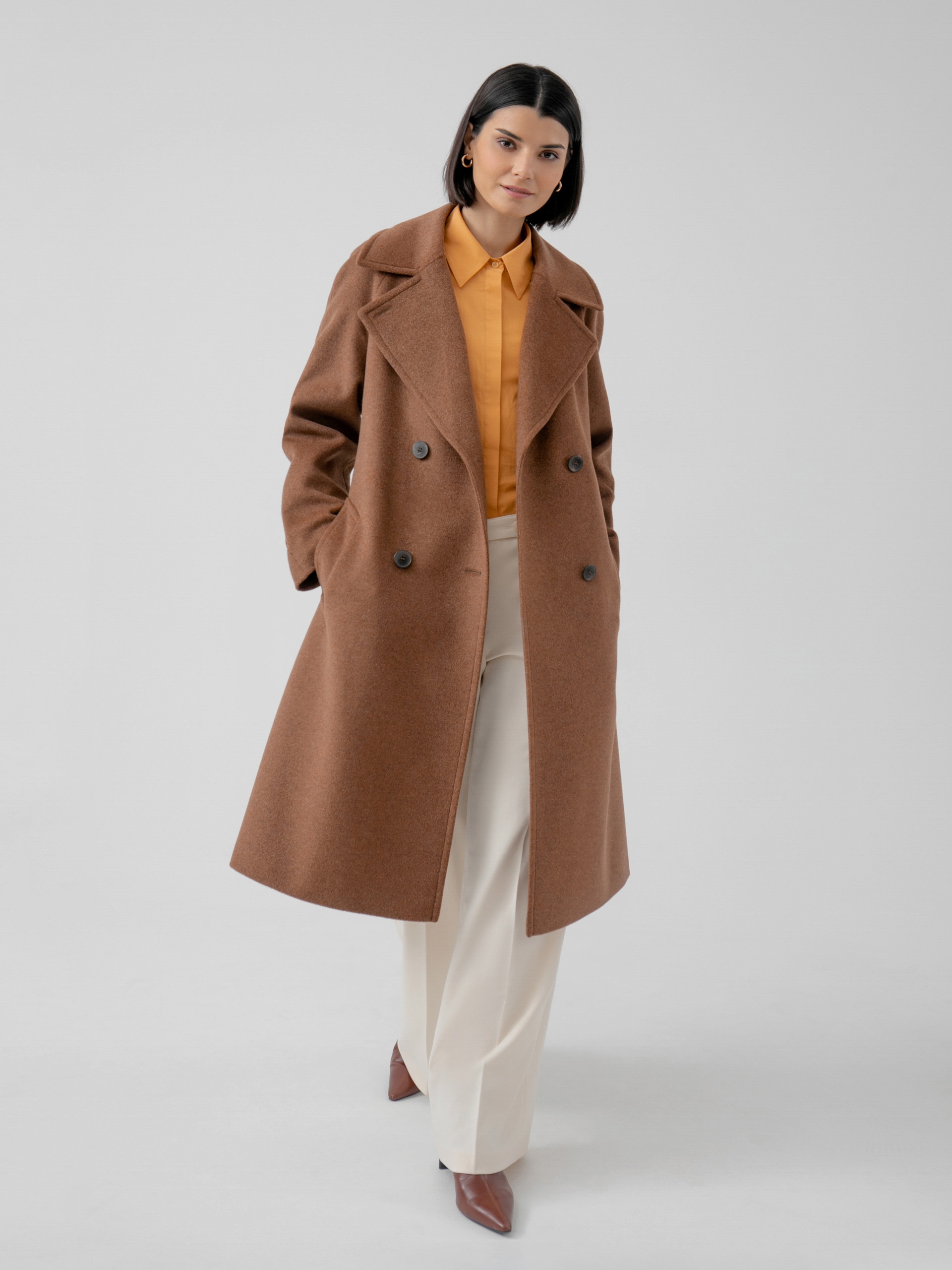 Классическое пальто прямого силуэта в роскошном цвете темный кэмел. Комфортная длина пальто, закрывающая колено, позволяет с легкостью создавать самые различные современные образы и носить его как с брюками, так и с юбками. Мягкая линия рукавов-кимоно не только выглядит очень утонченно, но и создает дополнительный комфорт при надевании объемных свитеров и плотных жакетов первым слоем. В качестве дополнительного аксессуара к пальто прилагается пояс, который подчеркнет талию и сделает образ более женственным, а также с легкостью поможет каждый день создавать уникальные образы. Пальто выполнено из премиальной шерстяной ворсовой ткани. Произведено в Санкт-Петербурге.