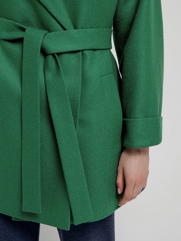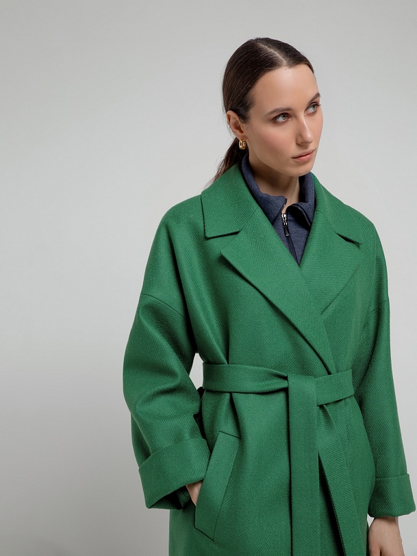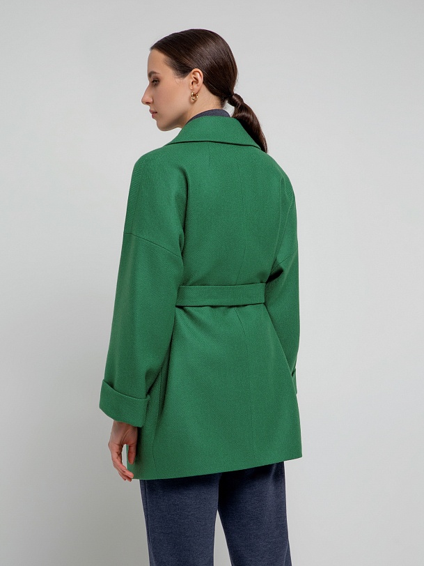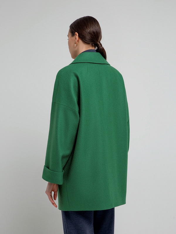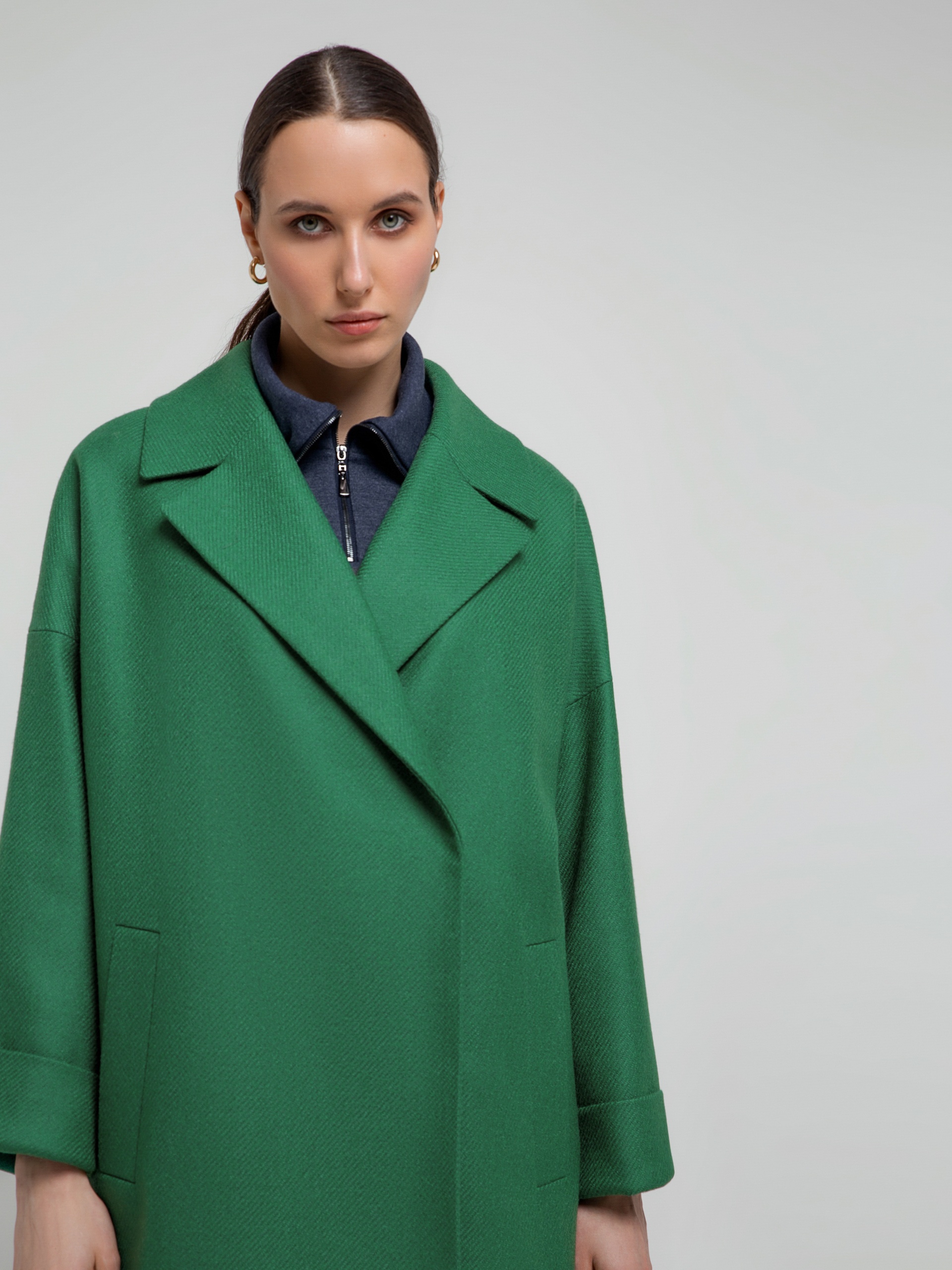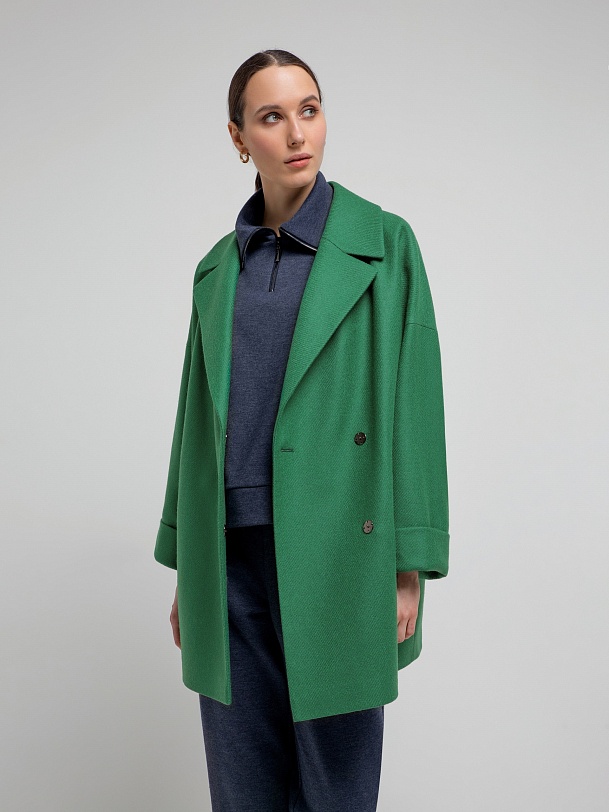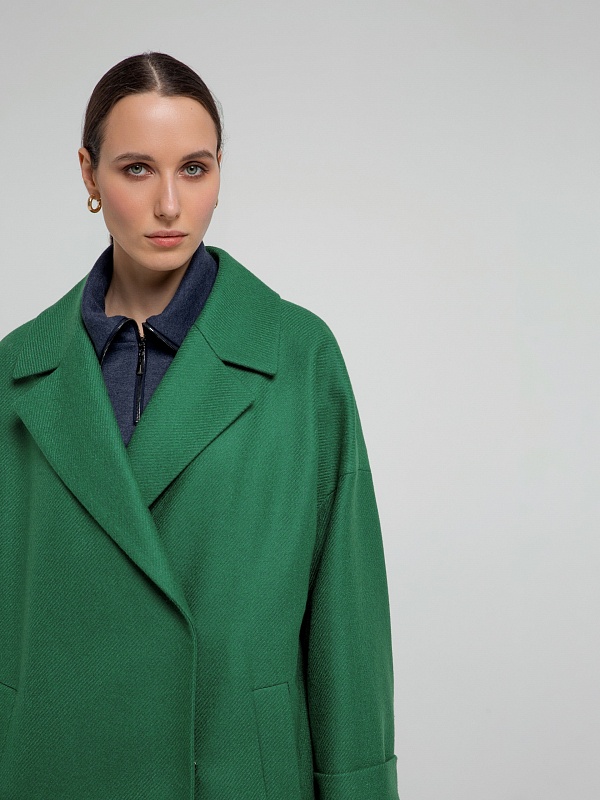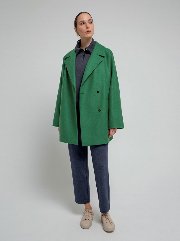 Двубортное укороченное пальто прямого силуэта из шерстяной ткани ярко-зеленого цвета. Широкий английский воротник, застежка на два ряда надежных кнопок, рубашечный рукав с широкой подгибкой низа и глубокие карманы с листочками делают пальто невероятно комфортным в носке, а цвет и форма делают его очень стильным и ярким. Длина пальто выше колена. Пальто произведено из шерстяной ткани с эффектом twill. Произведено пальто в Санкт-Петербурге.
