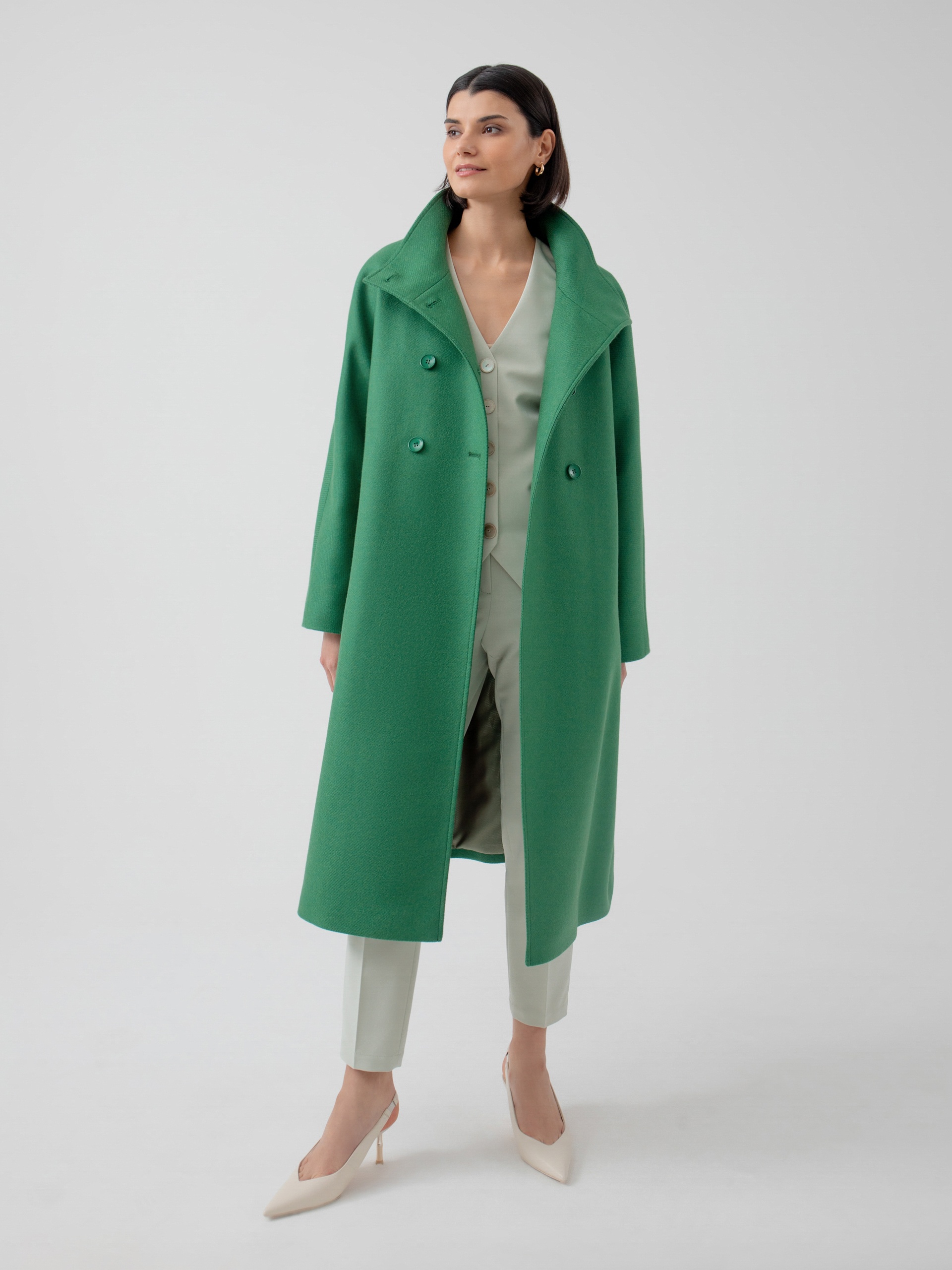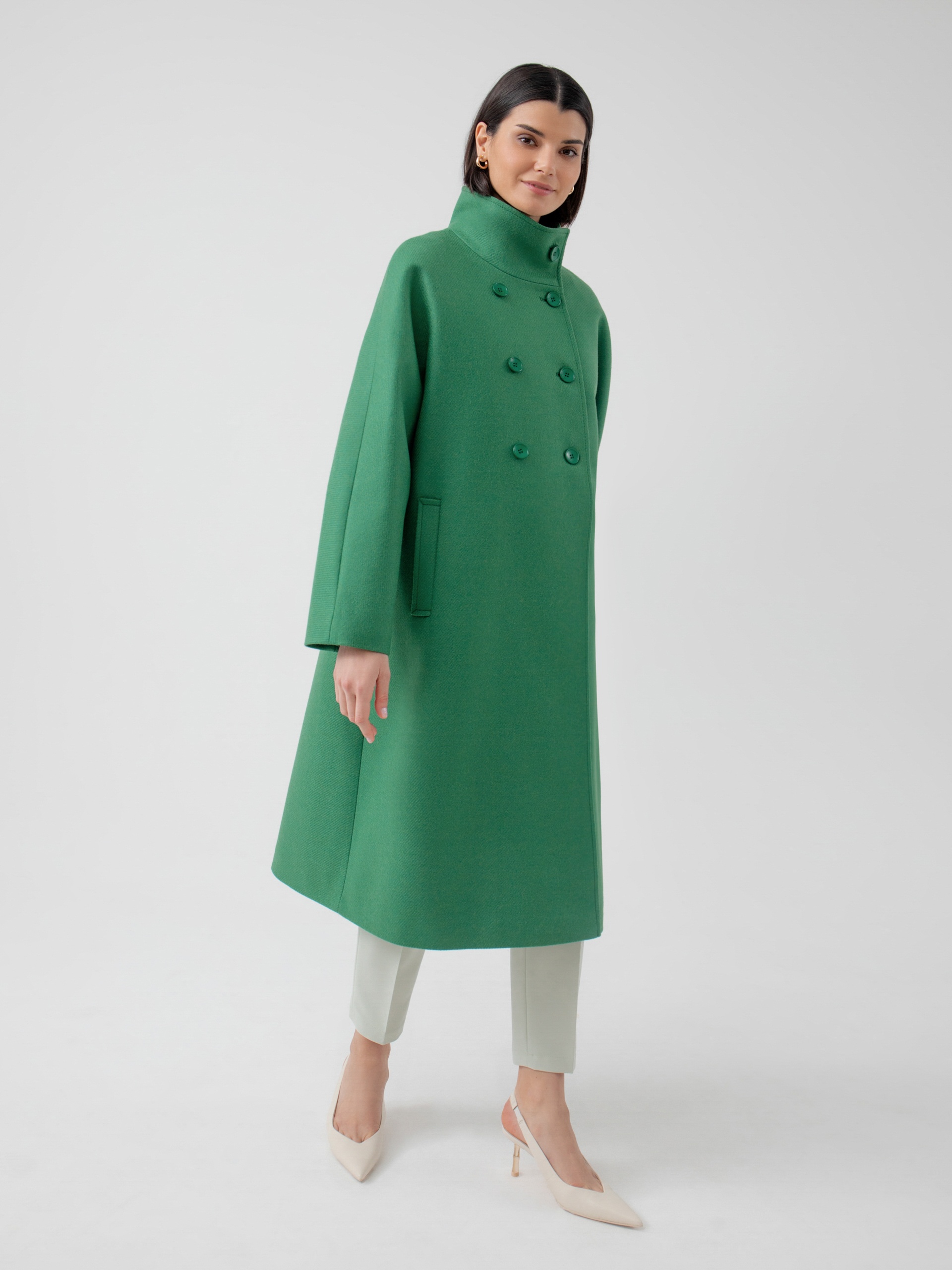 Ультрамодное двубортное пальто из премиальной шерстяной ткани в ярком зеленом цвете с эффектом twill. Пальто модного трапециевидного силуэта будет уместно в любой ситуации и с легкостью модернизируется под любой Ваш образ, сделав его уникальным. Пальто выполнено из премиальной ткани с высоким содержанием шерсти, а для наилучшего сохранения тепла применена мембрана RaftPro, надежно защищающая от ветра. Произведено в Санкт-Петербурге.